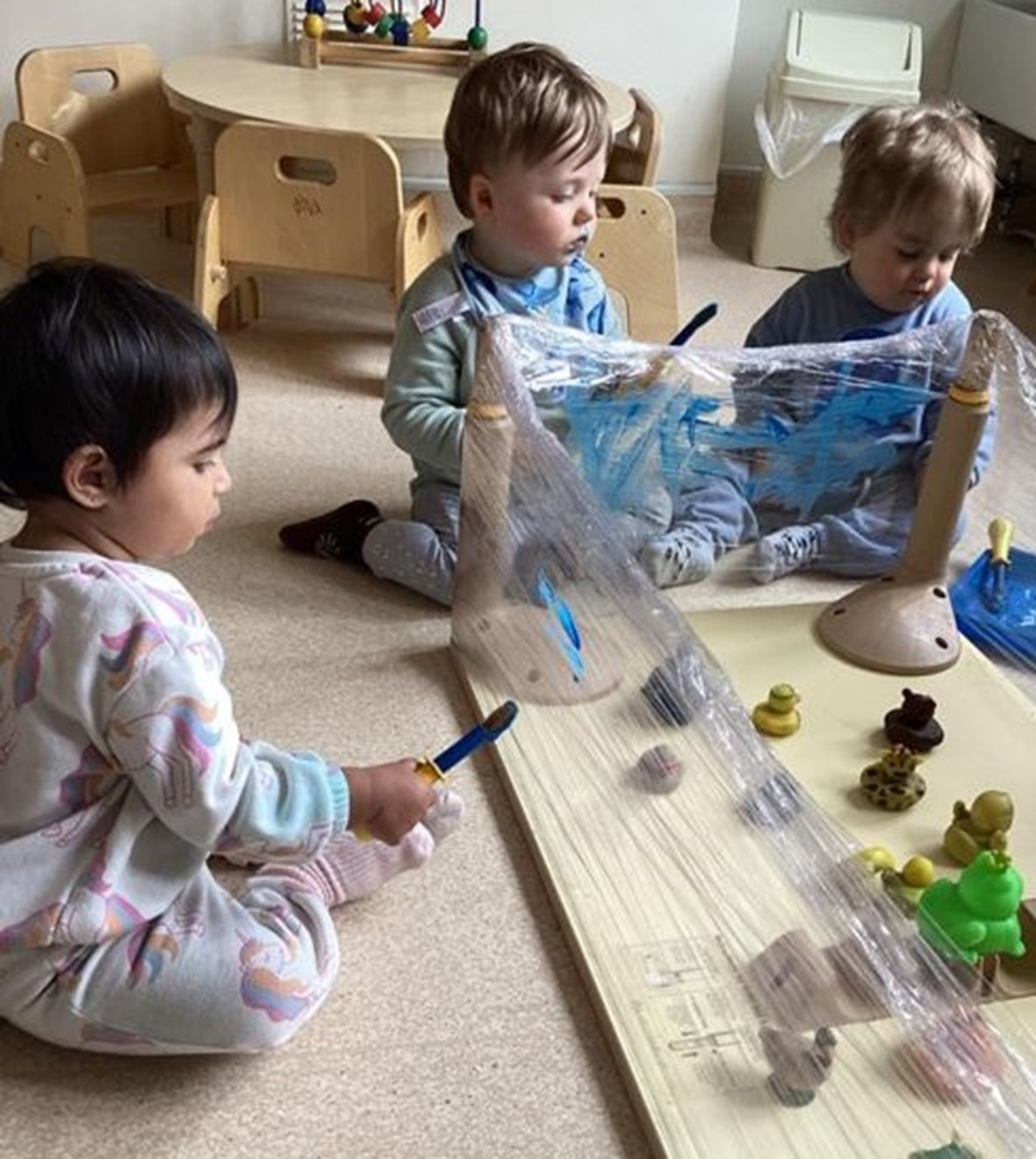 The children in Tigers were singing '5 little Ducks' and decided to expand the children favourite song into an activity. The children placed all the ducks on the upside down table, cling film was then added around the table, which allowed the children to paint the pond.