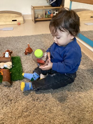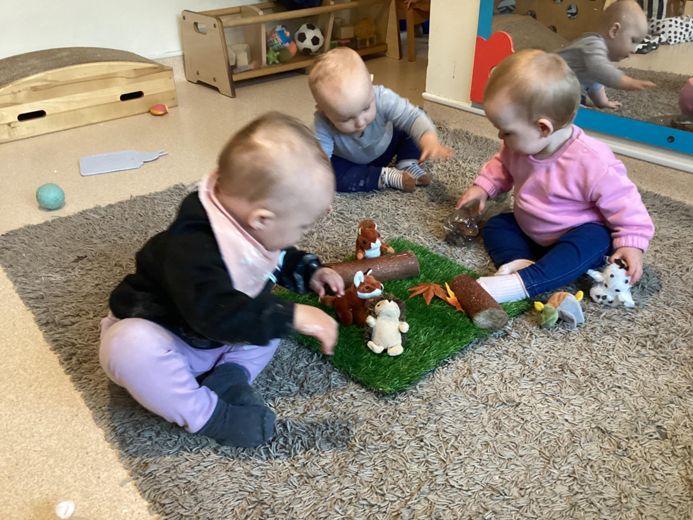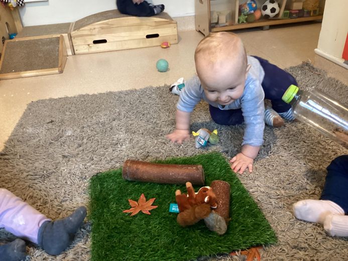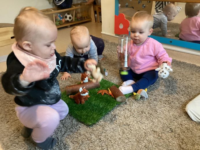 Playing with woodland animals in autumnal scenery and observing autumnal nature in a bottle, such as autumn leaves and acorns.