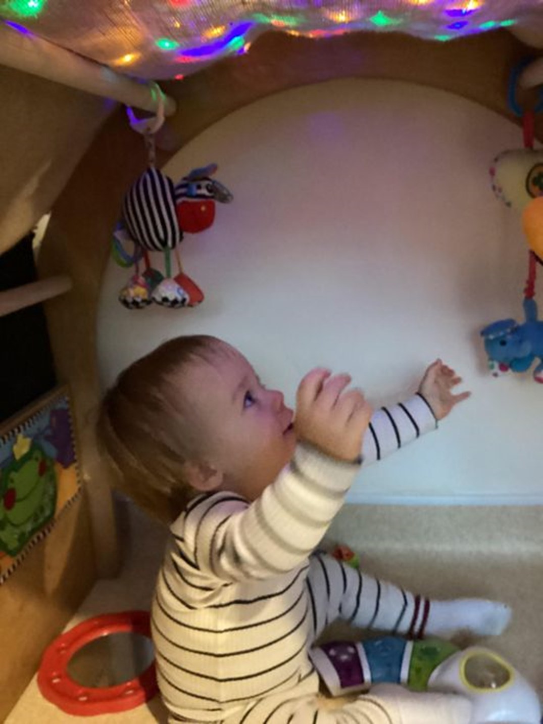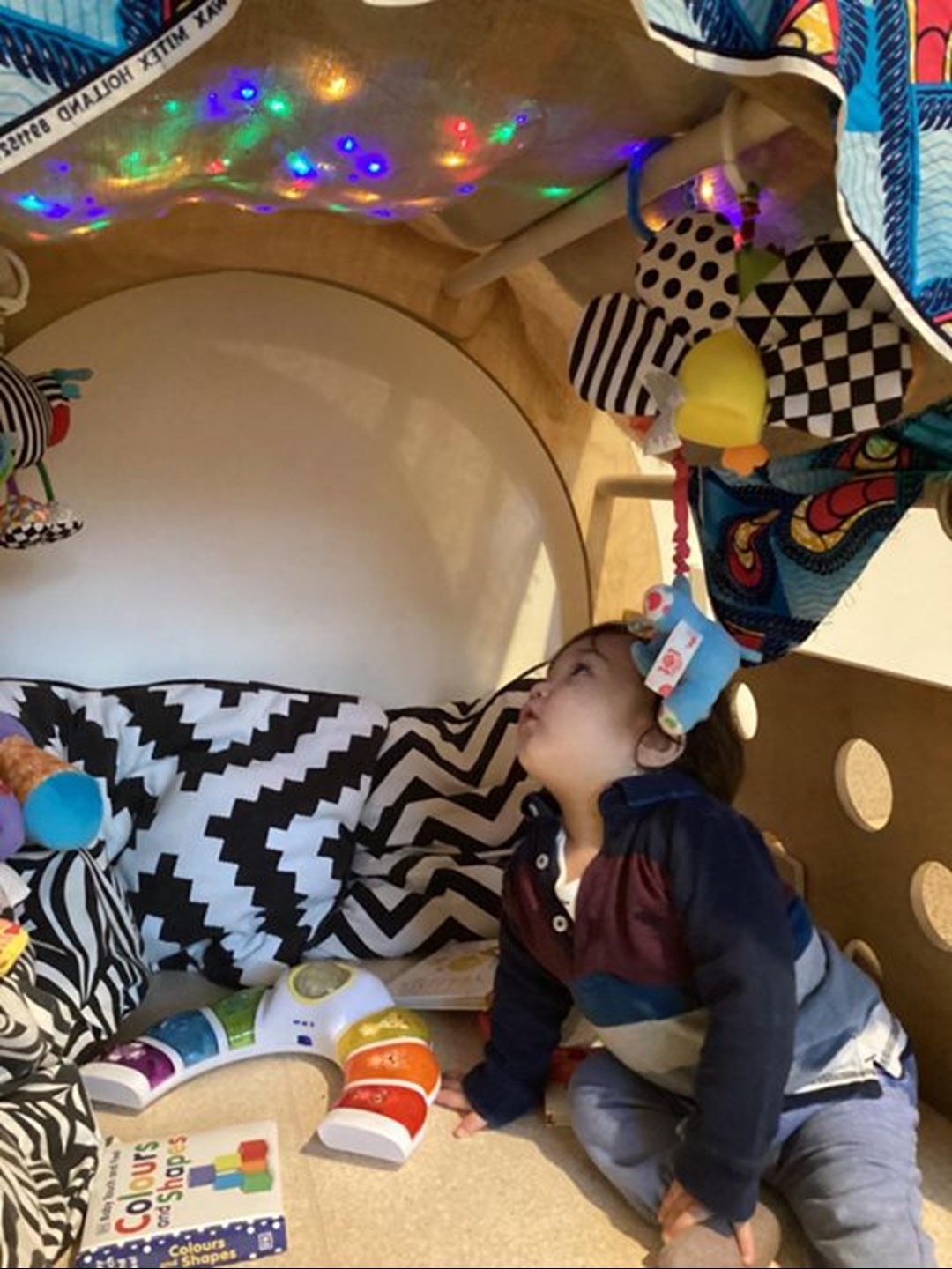 A cosy area for babies that aligns with the Early Years Foundation Stage (EYFS) should be a calm, secure space with soft lighting, sensory elements like soft textures and mirrors, and books for quiet time. It should be an enabling environment that supports prime areas of development, such as physical, personal, and emotional development.