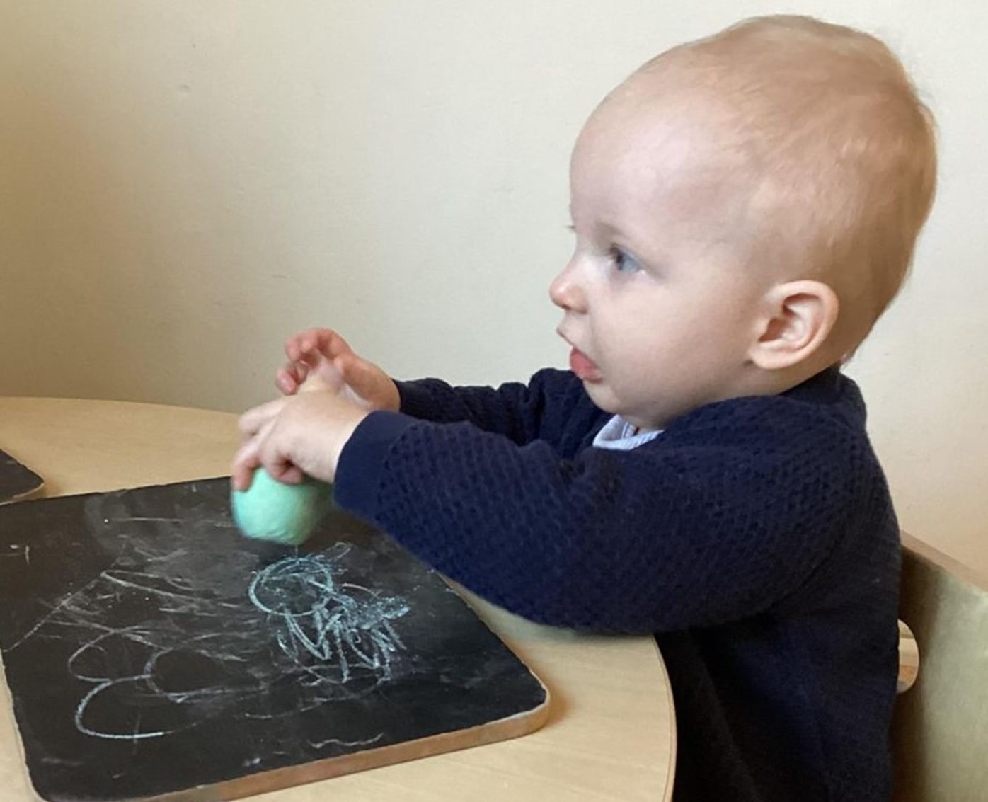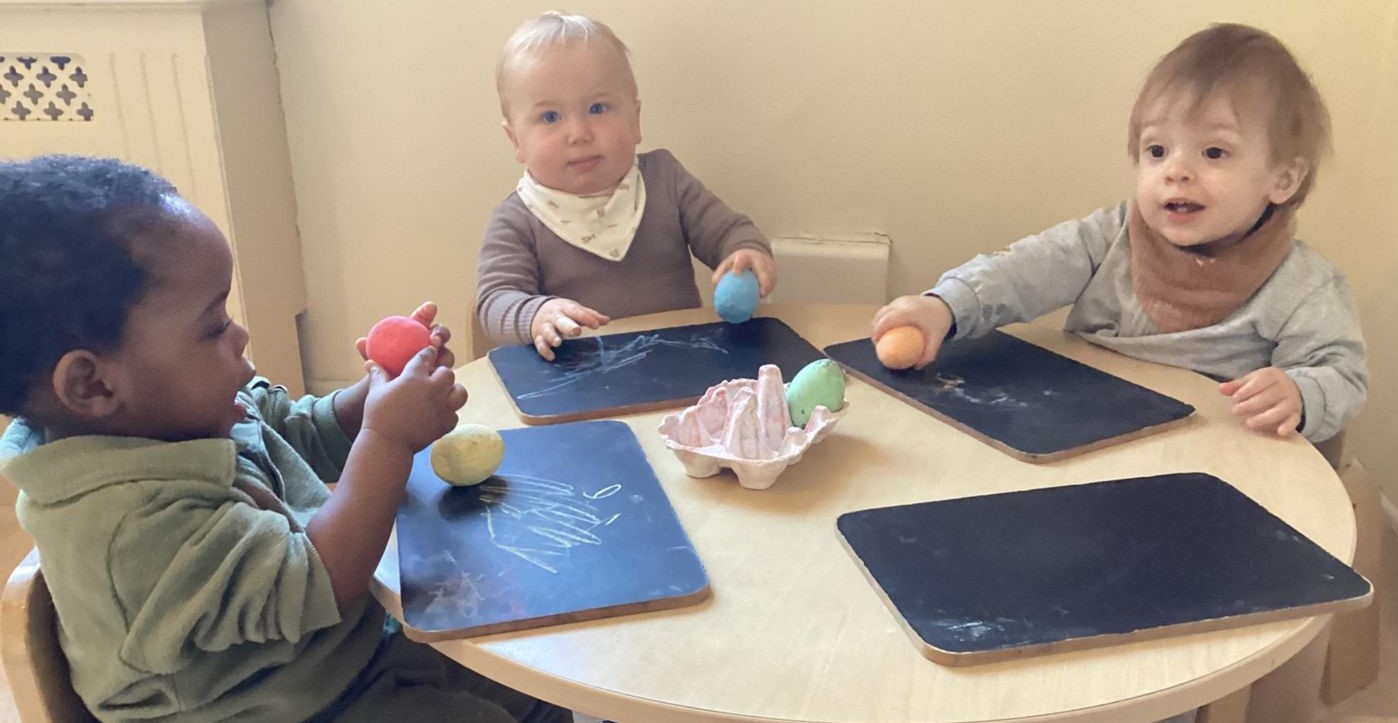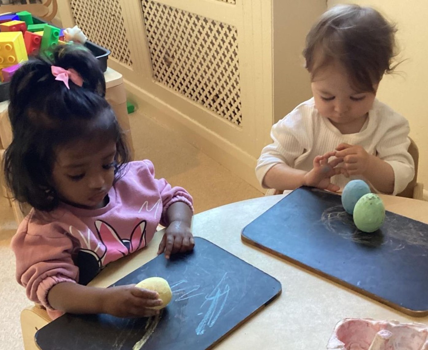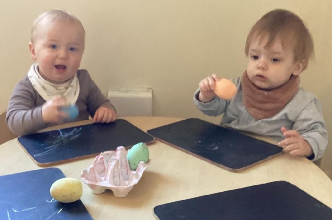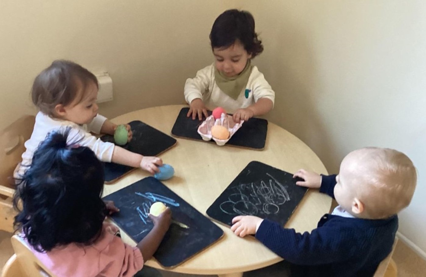 The children enjoying mark making with chalk and chalk boards developing their fine motor skills.