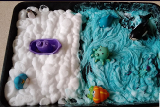 Cub had been learning 'Row, Row your boat' at the circle times and expanded this by making a shaving foam sea scene with boats and sea creatures.