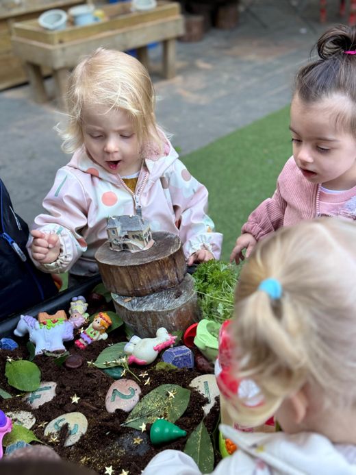 We began with a wonderful role-play session around our fairy garden tuff tray. The children were captivated by the twinkling biodegradable glitter (our special "fairy dust") and loved sprinkling it over the garden alongside glittery stars. They used their imaginations to bring the fairy world to life.