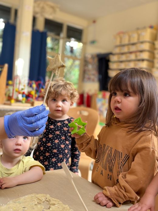 Next, we got creative (and a little messy!) by making our own edible fairy wands. The children used their early maths skills to measure out the ingredients, learning all about numbers and quantities through hands-on fun. They mixed, rolled, and carefully cut out star shapes, before inserting kebab skewers to transform them into wands.