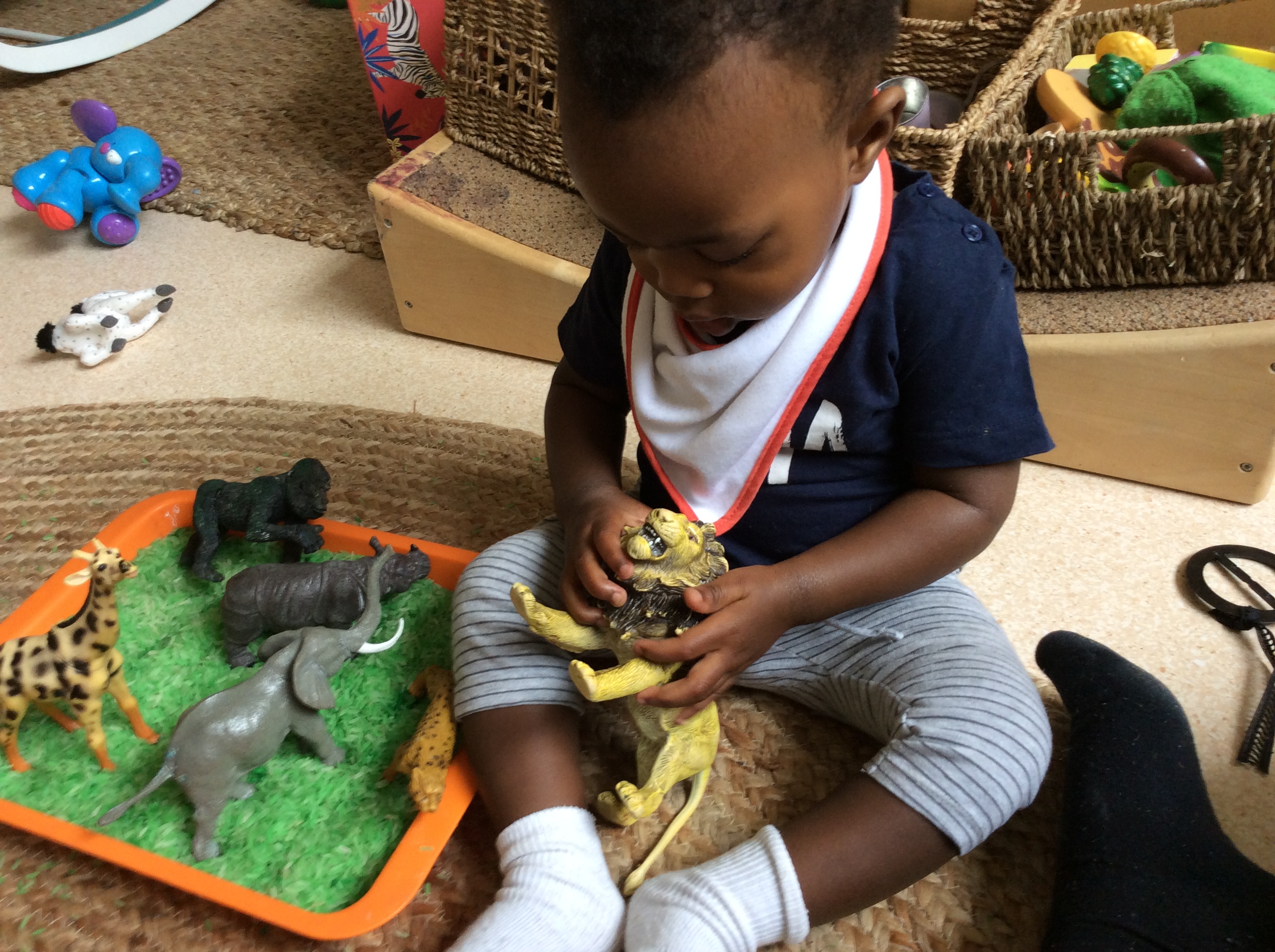 To finish off our animals from around the world topic this week in the baby room we explored animal habitats as reflection on what we have learned throughout the month. Firstly we explored our texture books to look at animals in their habitats. We also used the computer to watch short clips of animals exploring in their homes and how they live. We particularly loved looking at the farm animals and making the noises and sounds for all the animals we could see, “Baa” and “Oink” were very popular. To extend our learning we then explored our own habitats for our small world animals. This helped us to explore different textures, make marks and use our imaginations as we moved the animals around the different trays.