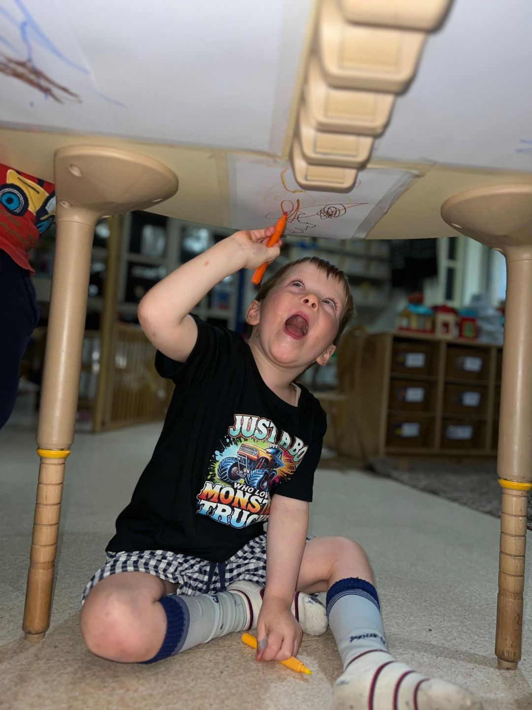 To build on this idea of perspectival drawing, we then introduced a mindful drawing activity. Sheets of paper were attached underneath the tables, and by adjusting the table heights, children could choose to sit or lie beneath them as they drew. Using pens and pencils this time, the children enjoyed the peacefulness of creating their artwork while looking up, discovering how a change in position can inspire a completely different drawing experience.