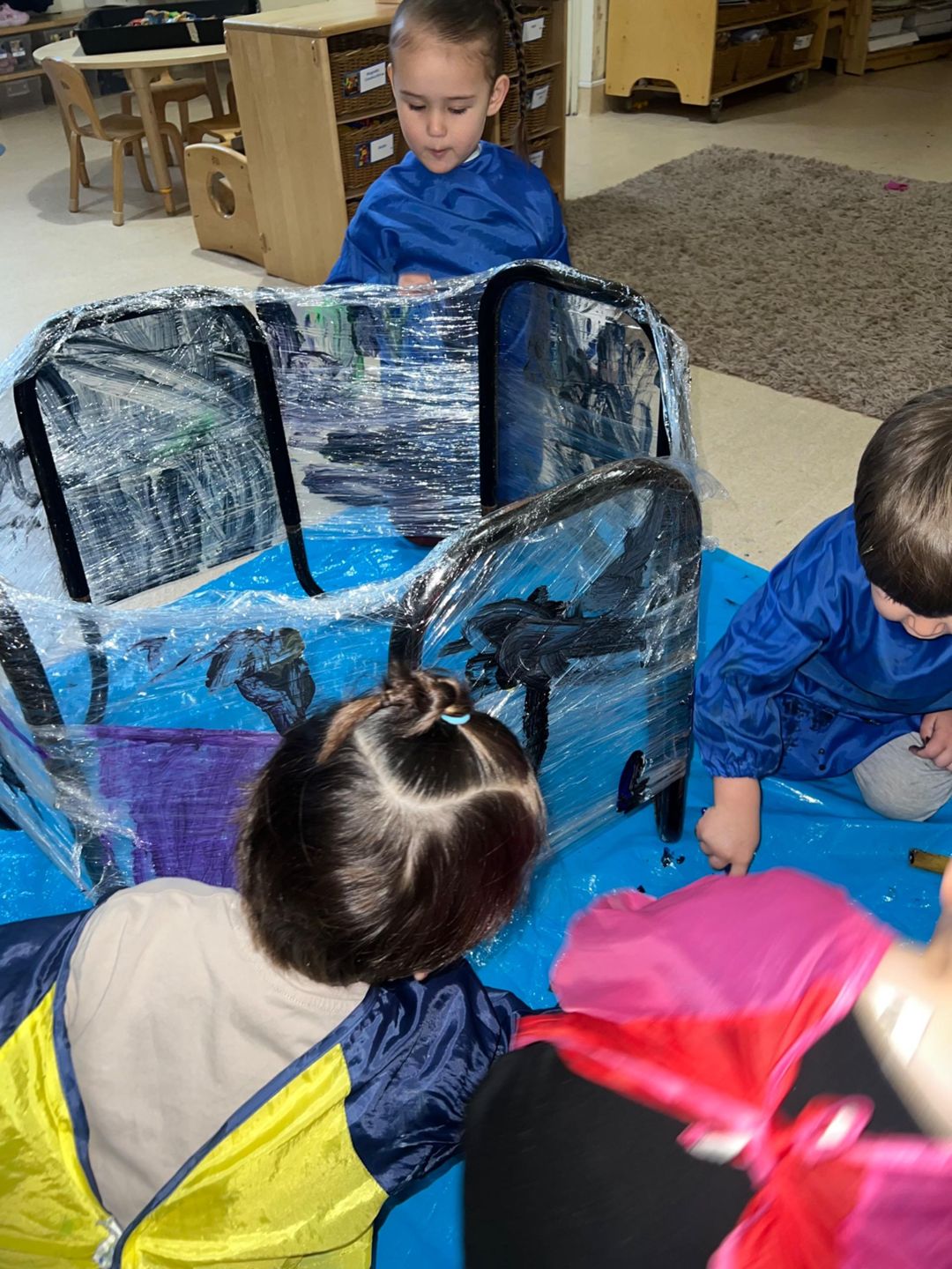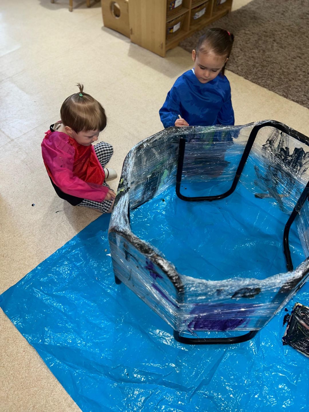 This week in preschool, the children explored artwork from new and exciting perspectives. We began by stretching cling film across the tuft tray stand and offering paint and brushes. The children were fascinated by the different strokes their brushes made on the film, watching closely as their movements created colourful marks. Some children mentioned they were “painting their house,” which inspired us to take the experience a step further by inviting them inside the stand to paint “the inside” of their house too!