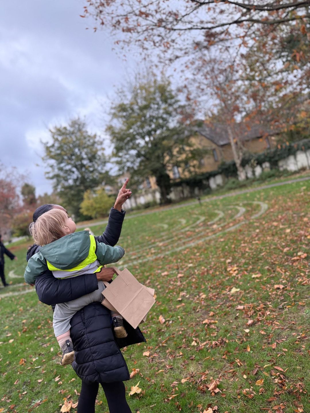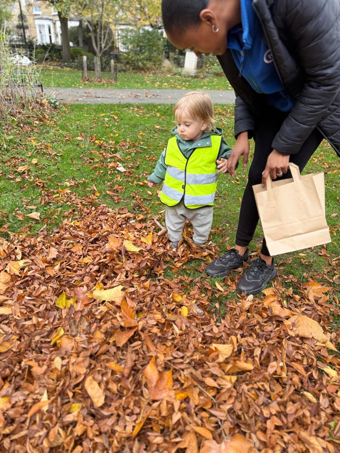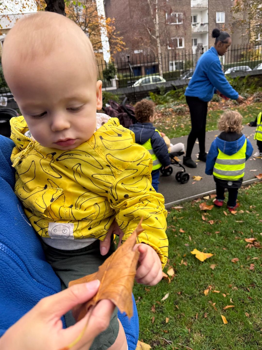 The babies and a few of the toddler room children enjoyed a lovely autumn walk together, exploring the crisp air and colorful leaves around them. The children were fascinated by the different shapes and colours, stopping often to pick up leaves from the ground and feel their crunchy texture. Some of the toddlers helped the babies collect leaves to put in their little bags proudly showing each other their finds. The sound of leaves crunching under tiny boots brought lots of smiles and giggles as they toddled and ran around the park. It was a calm, happy outing where the children could enjoy being outdoors and experience the sights, sounds, and textures of the changing season.