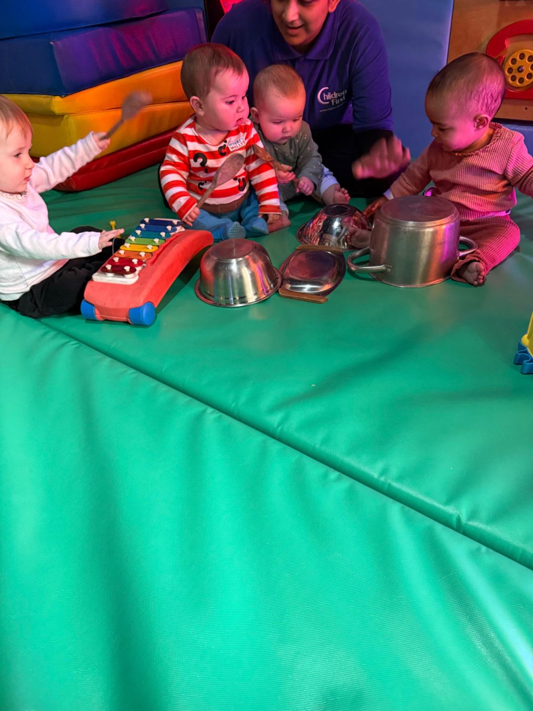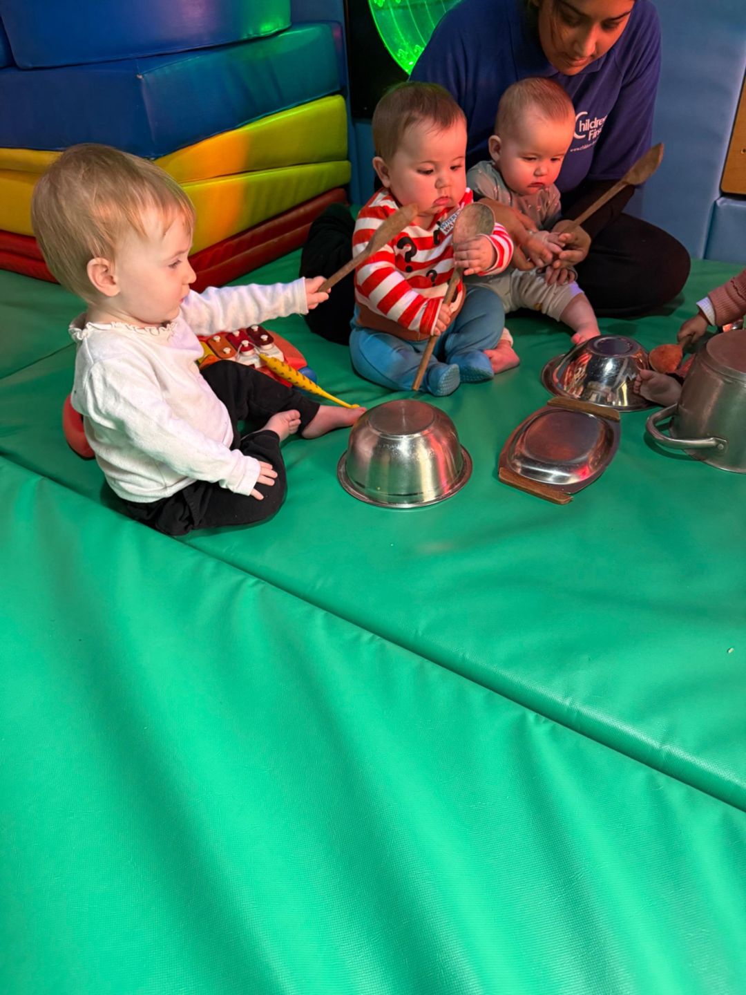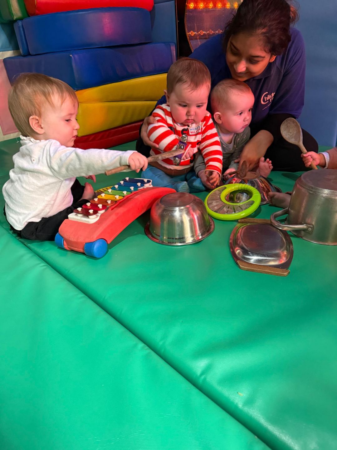 This week the babies formed their very own mini band and had lots of fun making music together. They were given the option to explore musical instruments or to get creative using everyday items they might see at home and at nursery. Some chose to play the bells, egg shakers and the xylophone, while others enjoyed creating their own sounds using metal pots and wooden spoons. There were lots of smiles and excitement as the babies expressed their creativity through sound.