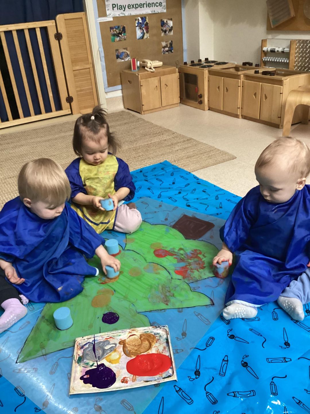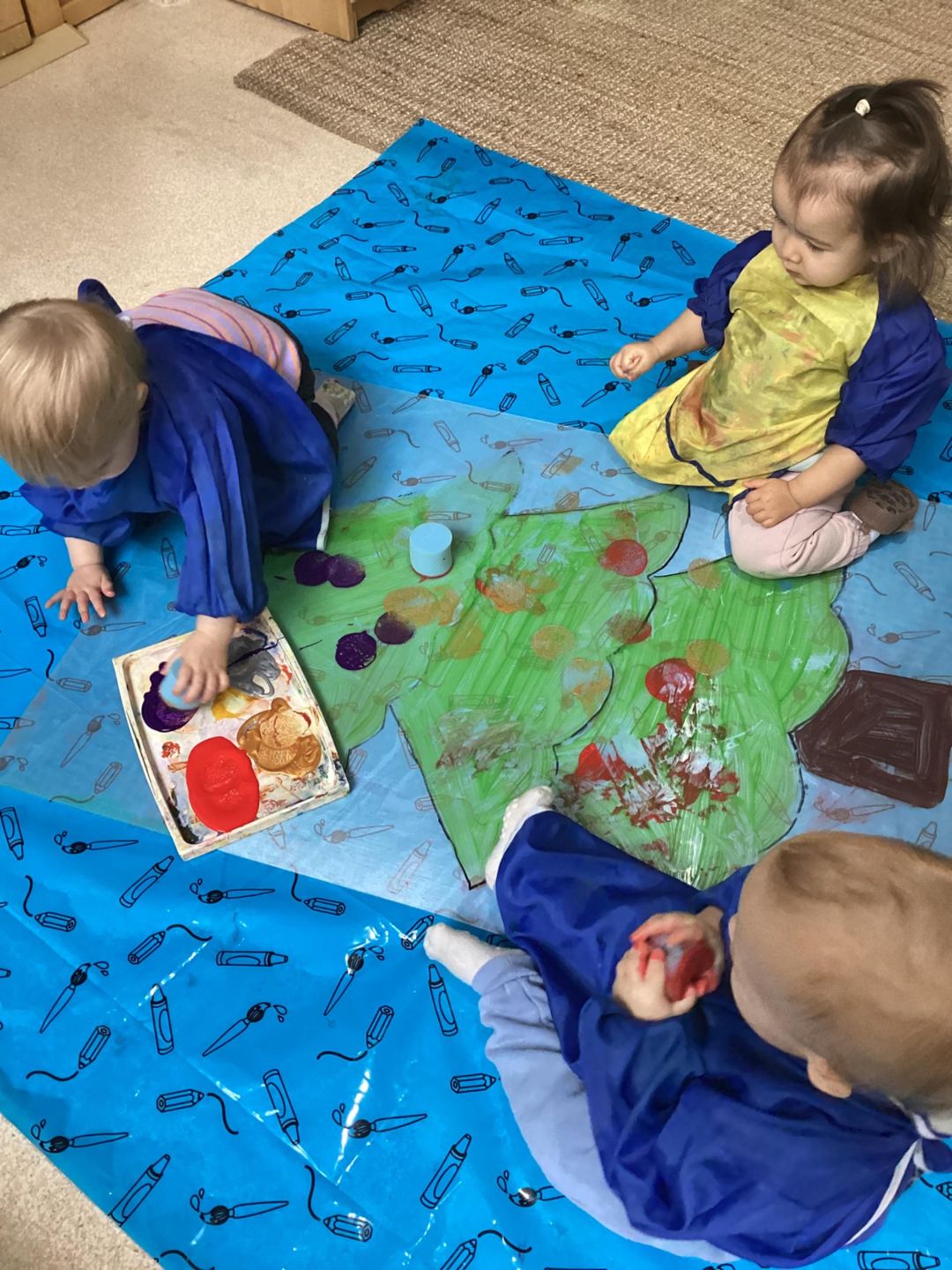 Today in the baby room, we drew a big Christmas tree on a clear plastic sheet and placed it on the floor inviting the babies to explore it. We set up some recycled circle shaped sponges with a tray of different coloured paints, the babies really enjoyed exploring the colours and textures as they pressed the sponges onto the tree to make bauble prints. The babies tapped gently onto the plastic making circle shapes on the tree, they were very interested in feeling the paint before putting it onto the sheet. Everyone got involved in their own way. By the end, the tree was covered in bright, messy, cheerful spots, and the babies were very proud of their creation.