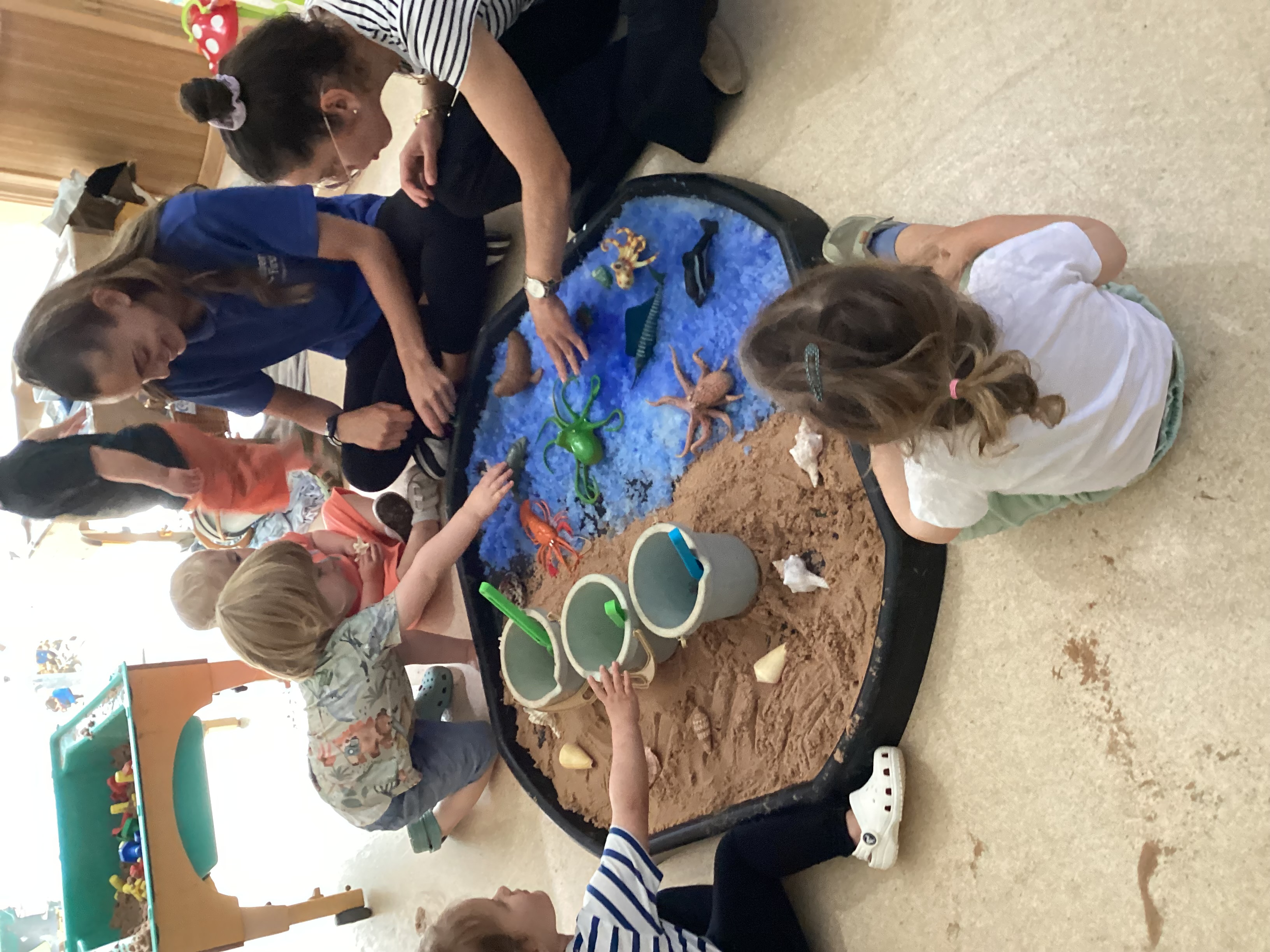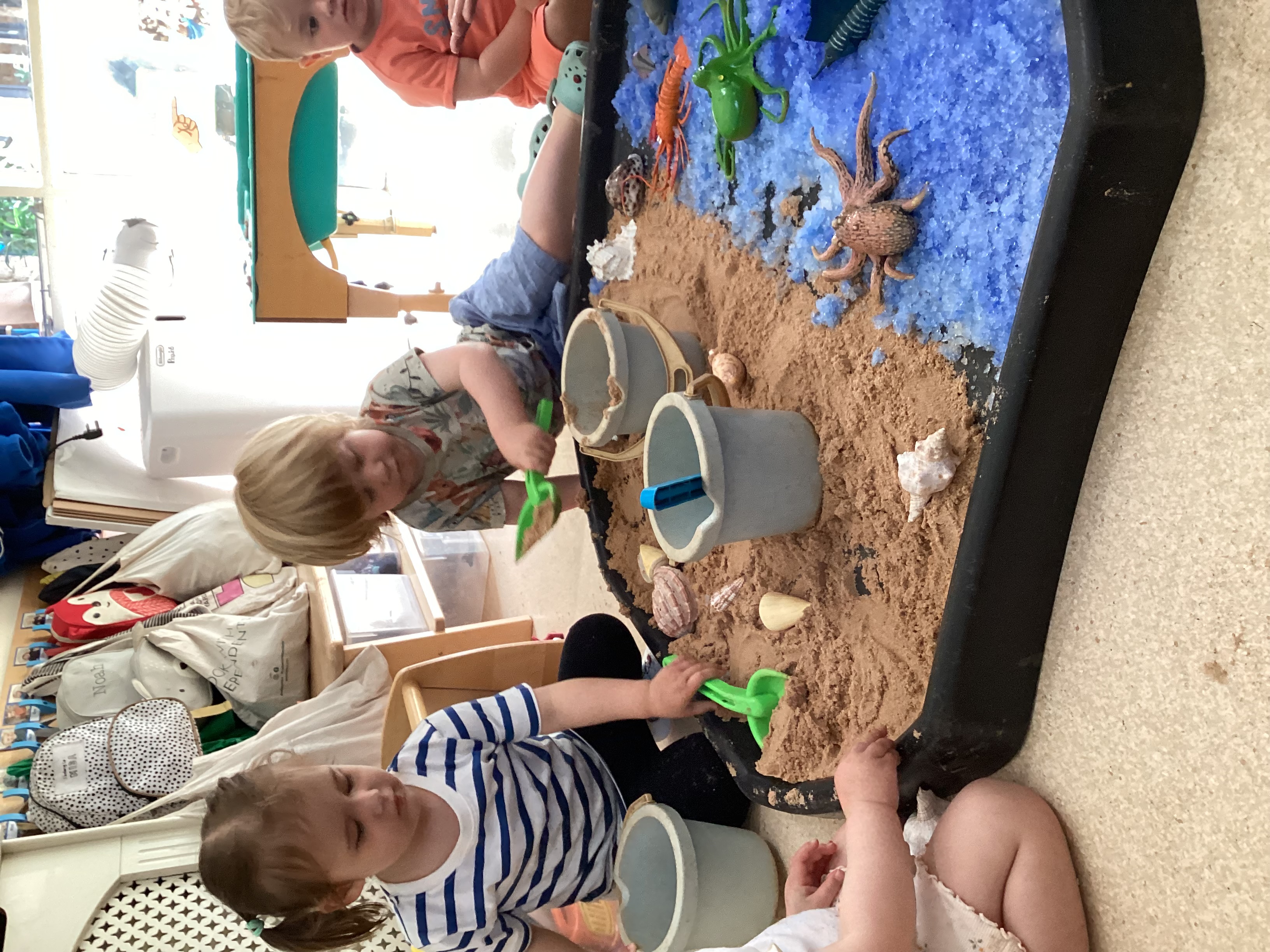 This week in the toddler room we took advantage of the lovely hot weather and explored summer. To do this we had a beach day in the room. We started with a beach texture tray that was filled with sand and jellybaff. We added sea animals, shells and buckets and spades to the tray. We really enjoyed building and molding with the sand and enjoyed creating sandcastles using our motor skills when handling the buckets. We also role played with the sea animals and learned their names. We learned “dolphin”, “shark”, “lobster” and “octopus”. While playing with these we were able to make links to our favourite stories like “Tiddler the story telling fish” And “Gilbert the Great” To further extend this in the garden we splashed in the paddling pool exploring filling and emptying with jugs and buckets and were able use the hose to fill up the pool. We also explored strengthening our motor skills by using spray bottles. We all had so much fun splashing and playing in the water, and it was a lovely way to keep cool.