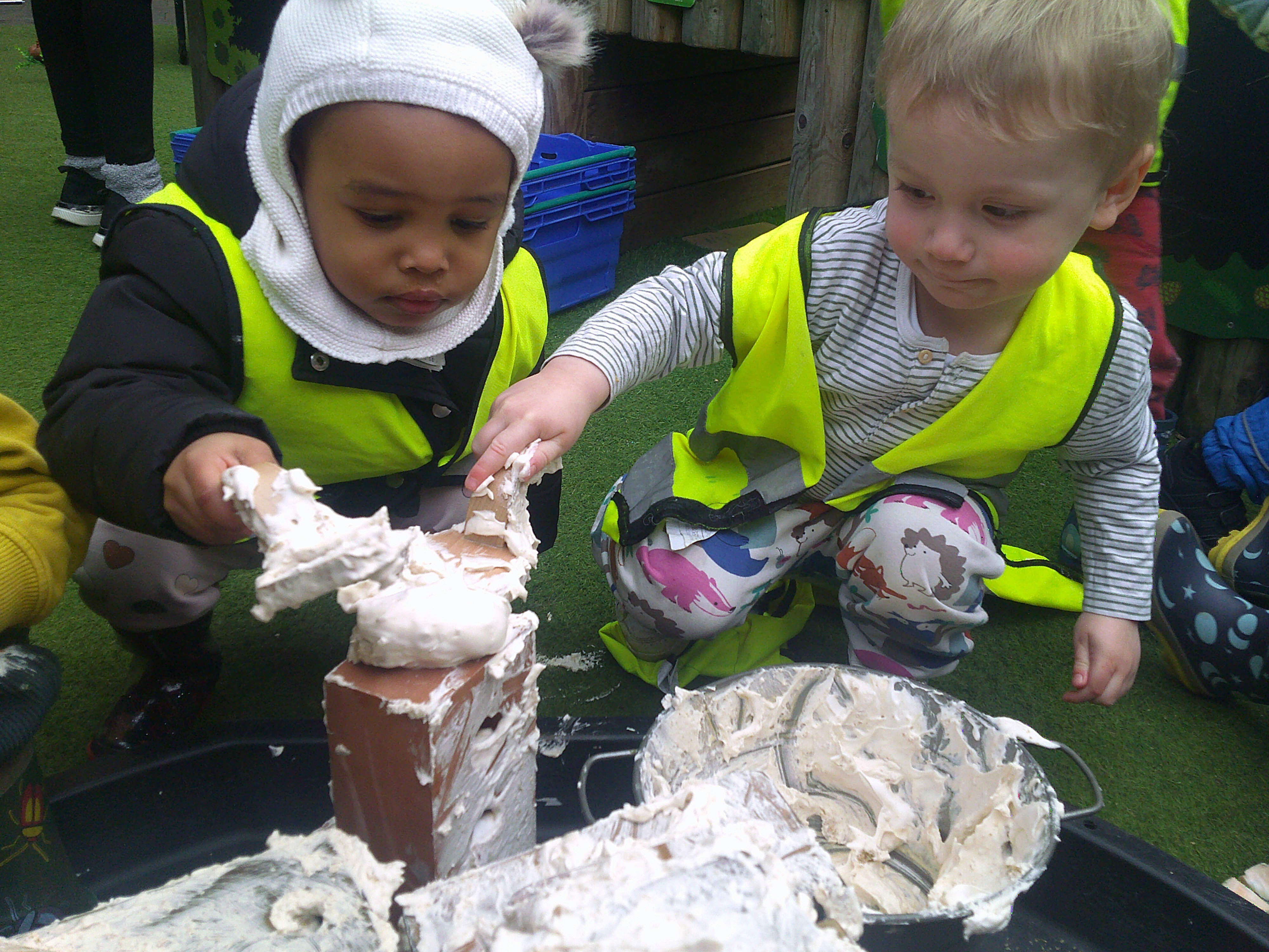 This week in pre-school we have been learning about the importance of builders in our society. We put on hard hats and high vis and used shaving foam, brown paint and crumbled Weetabix to make cement like paste, we then got different kinds of bricks (foam and wood) to build a house. We used the cement scrapers to apply even amounts of cement to the structure. Pre school had to use their critical thinking to see what methods were best for building their house. It was decided that the wooden blocks shouldn’t go at the top as they are too heavy and make the structure fall. They also realised that if they added too much cement the structure would slip.