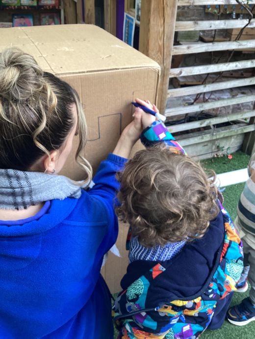 We began our castle project by designing the front door. An adult presented three different door designs, and the children eagerly voted for their favourite. Once a design was chosen, we drew the outline on the box, and the children carefully traced over the lines — an excellent opportunity to develop their fine motor skills.