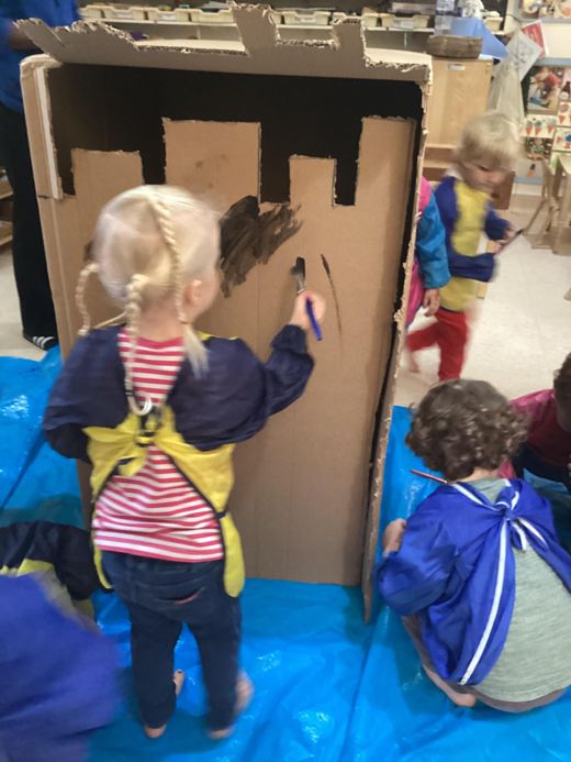 When it came time to cut out the door, the thick cardboard proved to be a challenge, so an adult stepped in to help with the cutting. Afterwards, we brought the castle indoors and began painting. The children chose a silver-grey colour for the castle walls and got busy painting — working together, sharing tools, and strengthening their gross motor skills through wide, sweeping brushstrokes.