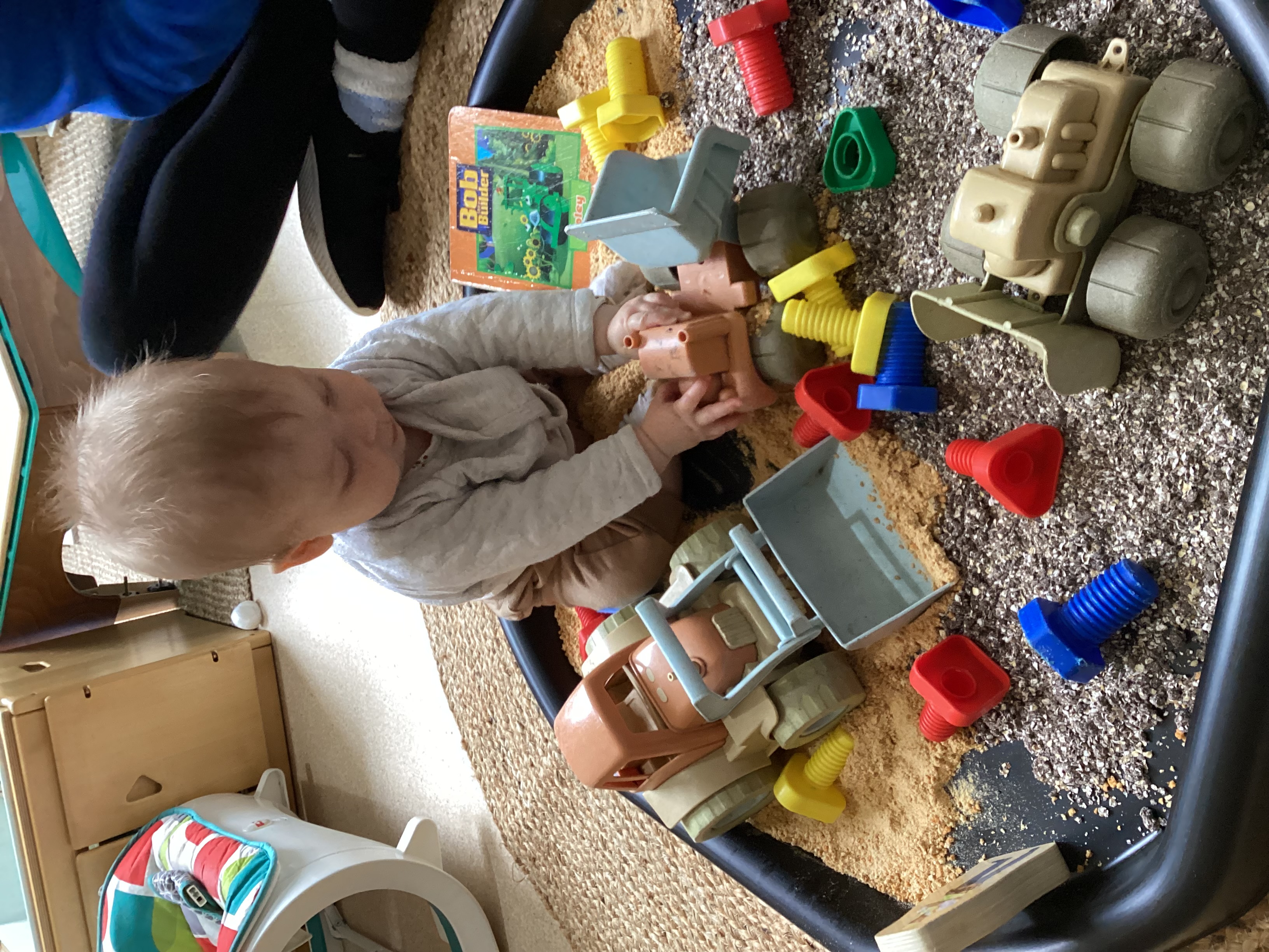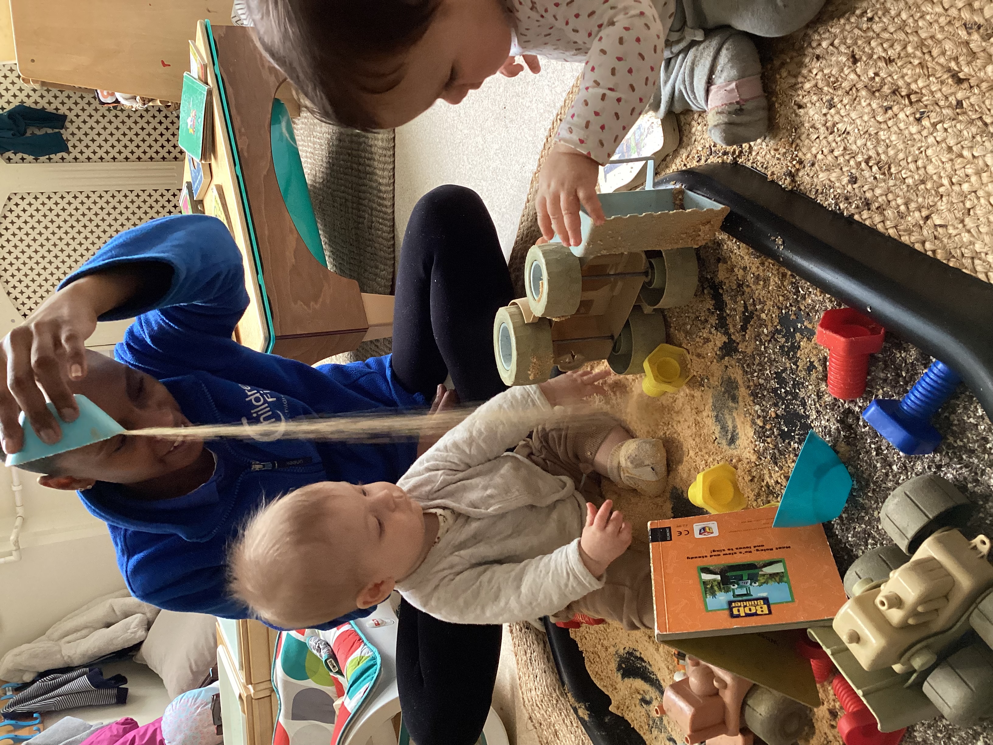 This week in baby room, to end our topic ‘people who help us’ we looked at builders and what they do. First we created edible sand using cereal and mud using coloured oats and used our hands to scoop the building materials into our digger and tipper trucks. This enabled the babies to explore two different textures as they sprinkled the dry sand and squeezed the sticky mud. To extend this the babies transformed into builders for the day. They all enjoyed dressing up and exploring the different types of tools builders use.