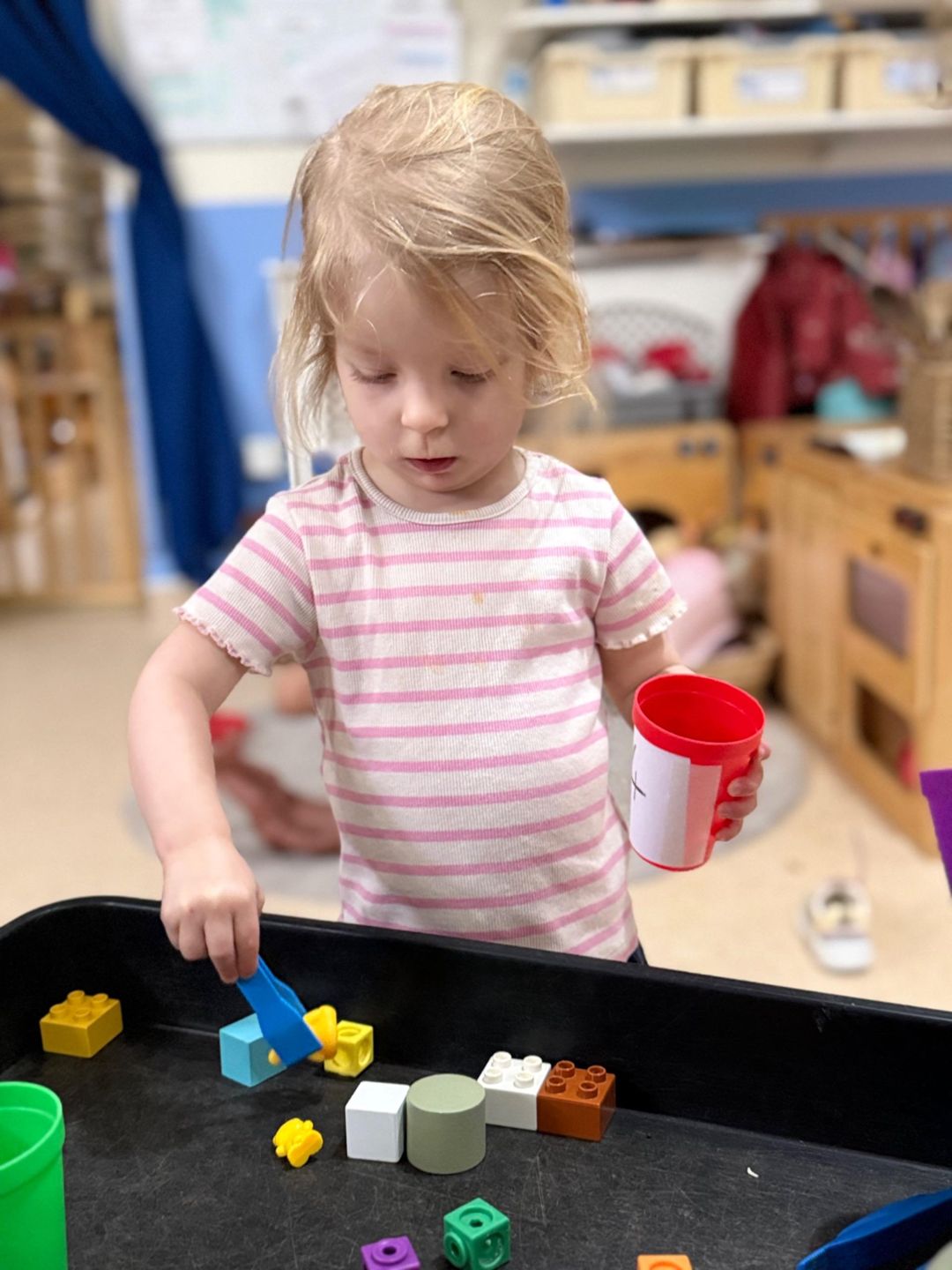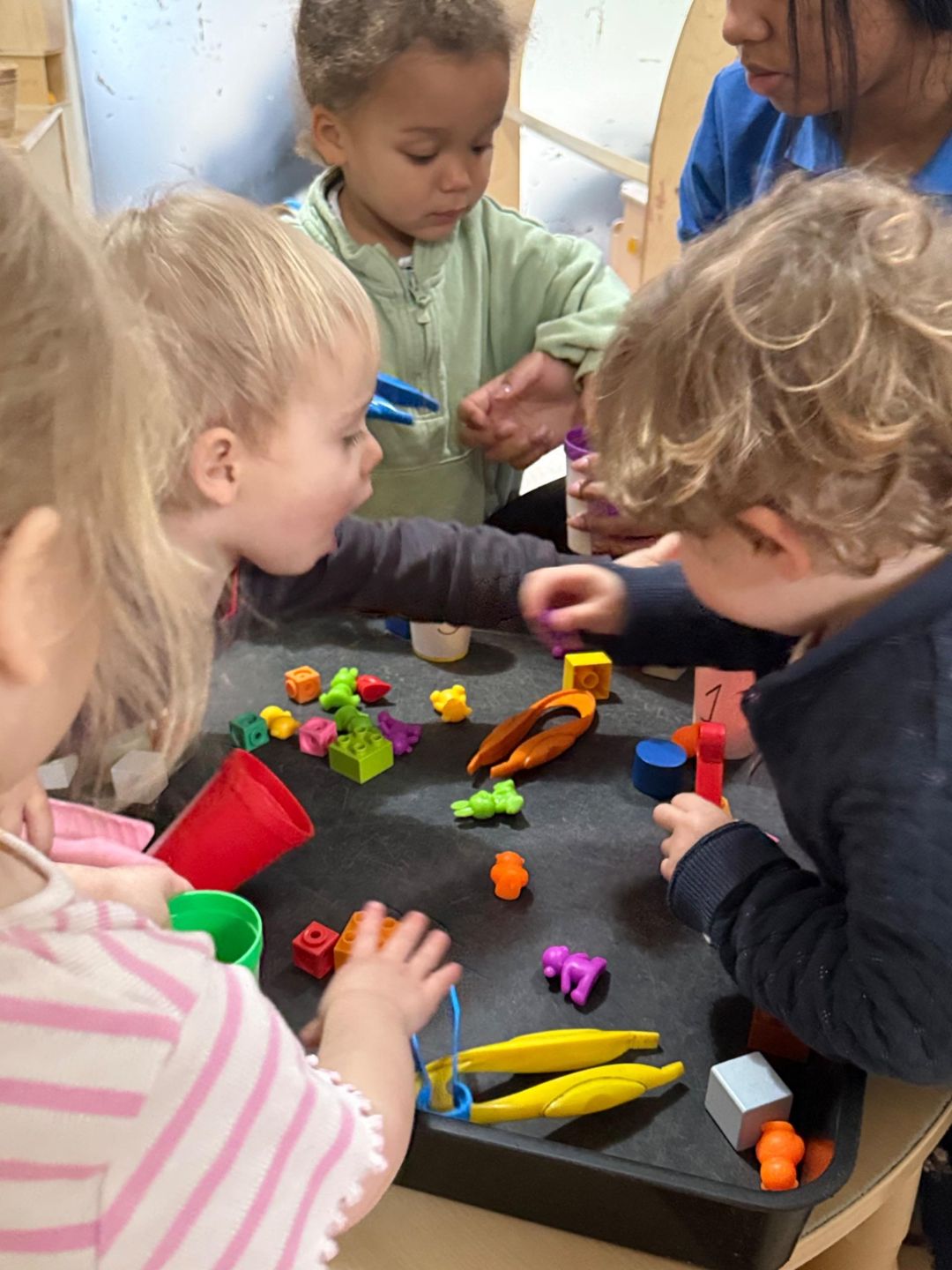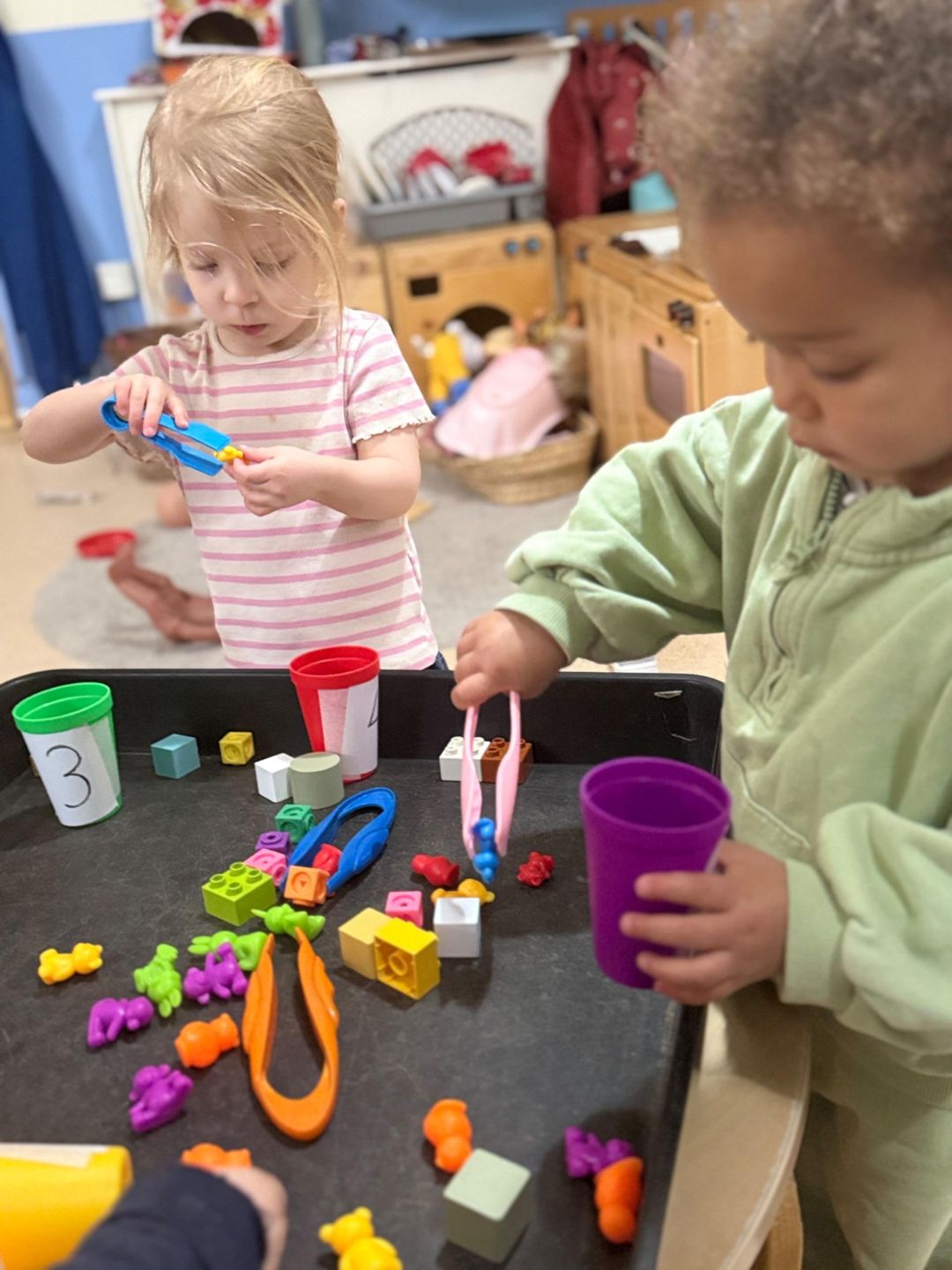 This simple activity supported fine motor development as children grasped, pinched, and transferred the objects, strengthening the small muscles in their hands. It also introduced early maths concepts as they explored colours, counted items, and compared groups using language like “more” and “less.”