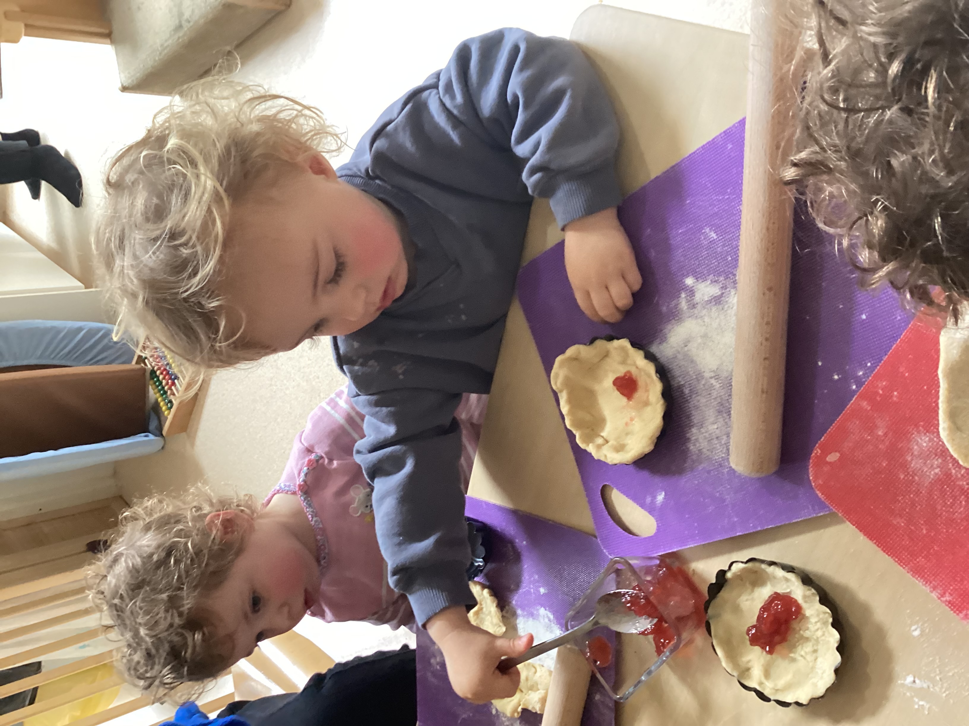 On Monday the toddlers made some lovely Jam tarts with Chef Bernie. Bernie demonstrated to us how to roll out pastry with rolling pins and then pat with our hands. We really enjoyed doing this and linked it to when we play with playdough. Our next job was putting our rolled out pastry into some cake tin cutters. We used our fine motor skills to press and mould our pastry into the cases. We then used spoons to scoop some lovely jam on top of our pastry to finish off our jam tarts. We then put them in the oven and let them cook ready for us to enjoy at home. Well done toddlers what lovely jam tarts.