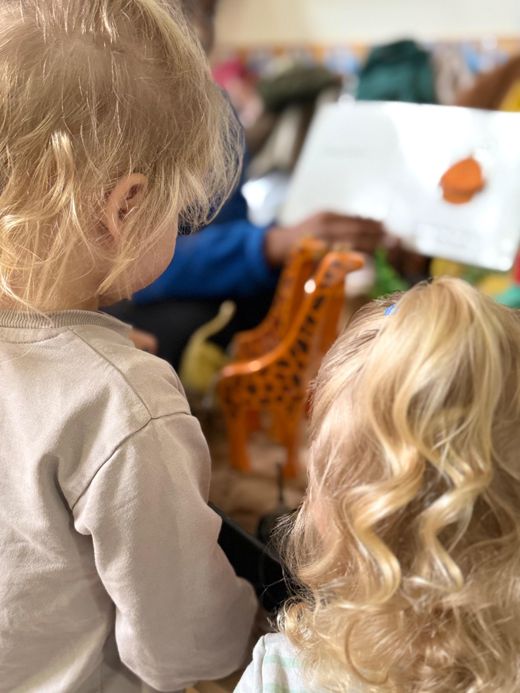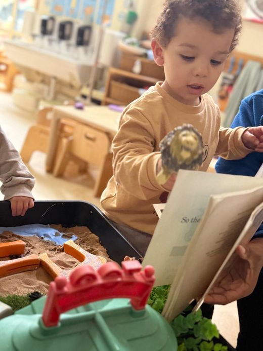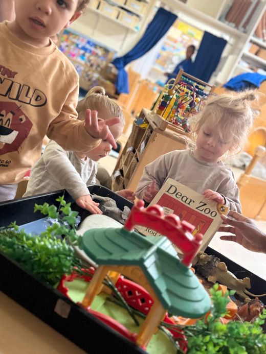 The toddlers engaged in a sensory exploration of animal habitats, based on the Dear Zoo book. They listened to the story and eagerly pointed out the various animals, recognising them in their respective environments. The tuff tray was set up to represent these natural habitats: blue cornflour symbolised water, sand was used to represent the lion’s environment, and greenery was added to reflect the habitats of the snake and the monkey. Throughout the activity, the children explored different textures, allowing them to interact with materials that represented the animal’s natural surroundings and as some of the toddlers identified animals from the story, they began naming animals and even began making some animal sounds as they played and explored the tuff tray.