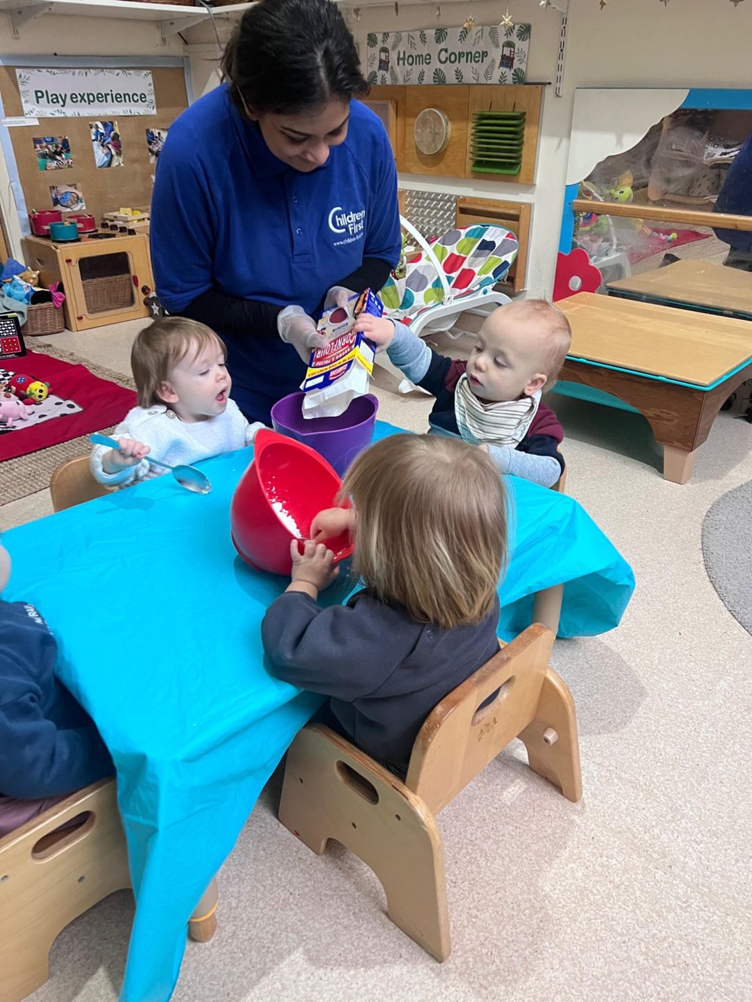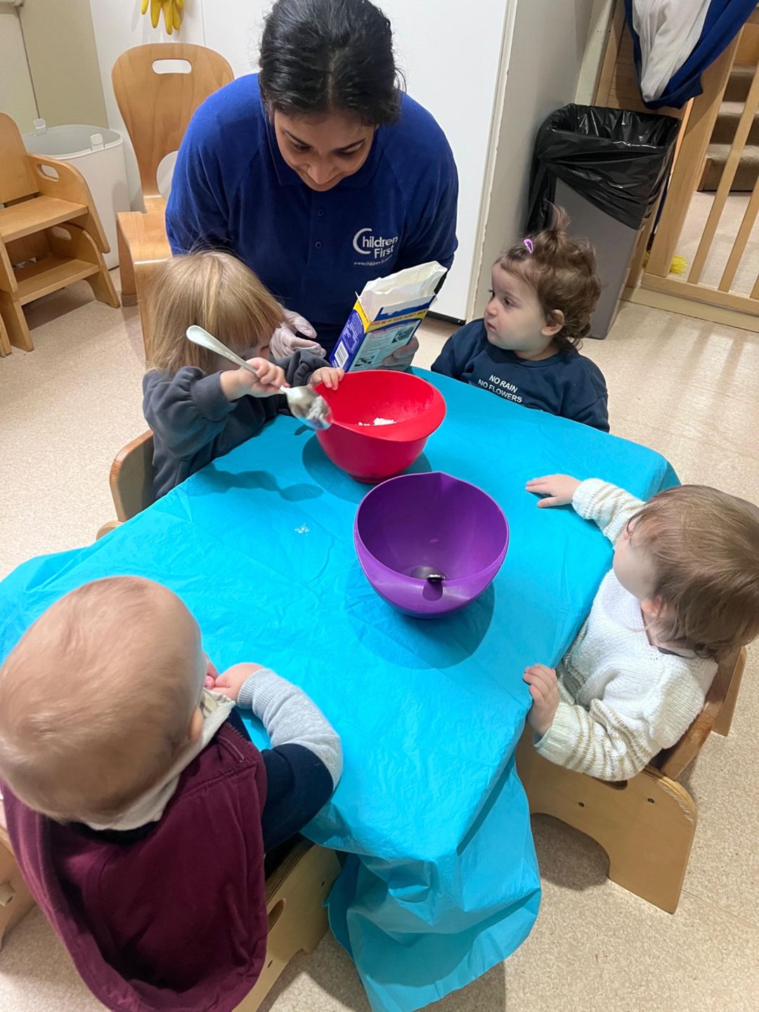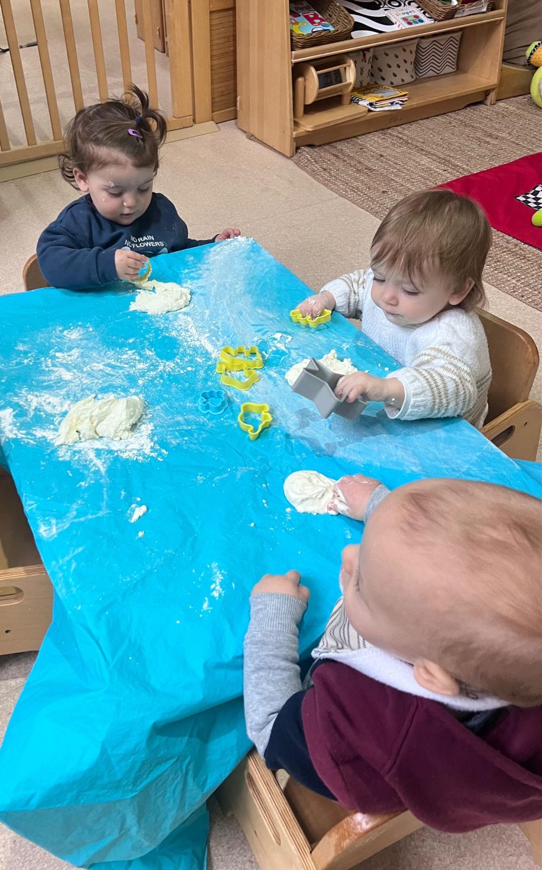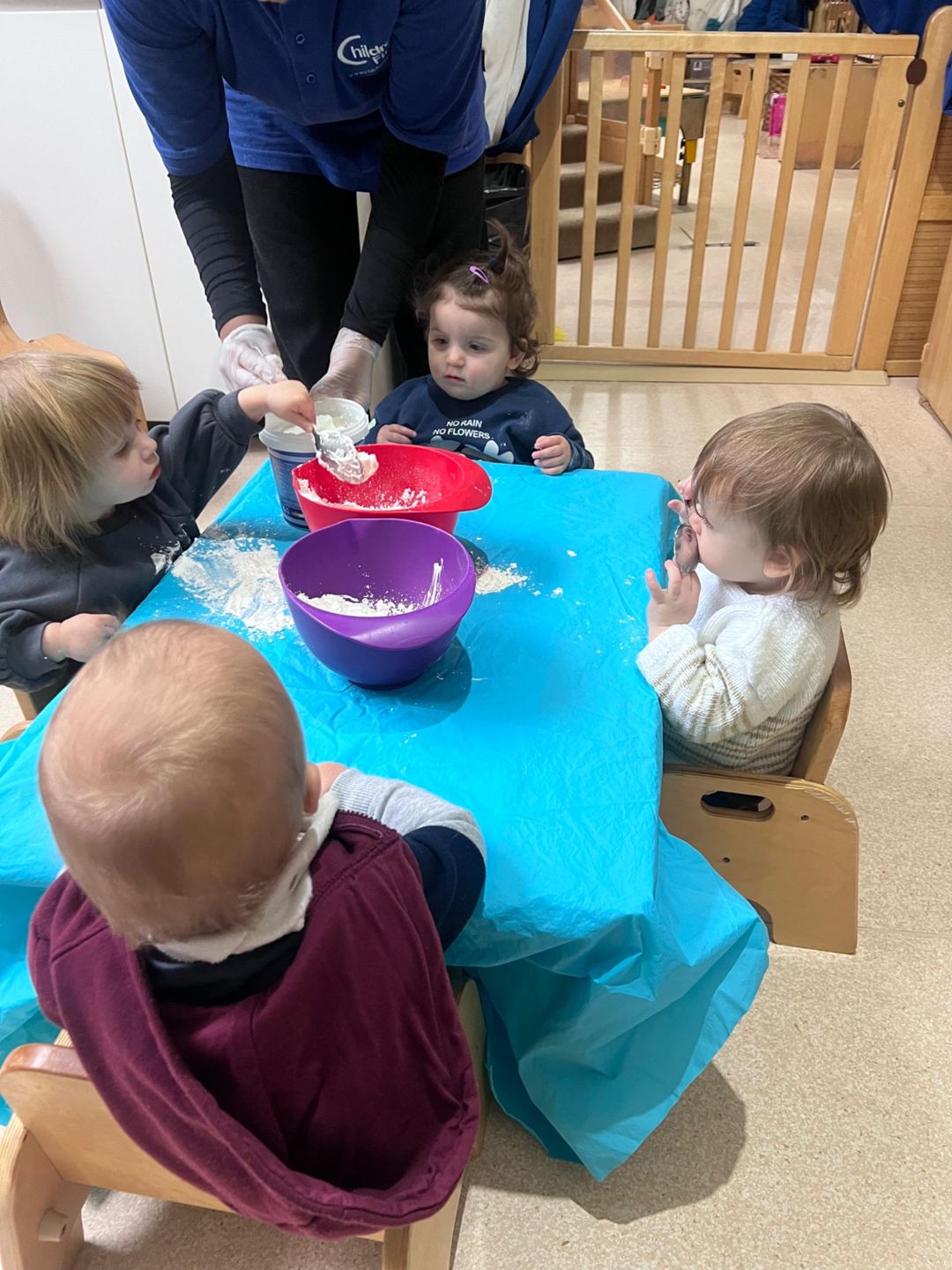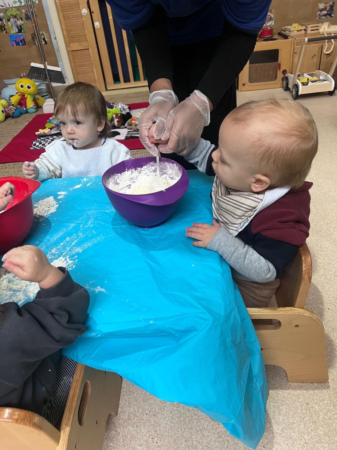 This week in the baby room we enjoyed a lovely sensory activity making edible play-dough using yogurt and cornflour. The babies took turns measuring out the ingredients and adding them to their bowls. With support from the adults, they mixed everything together and watched it change into a soft dough.