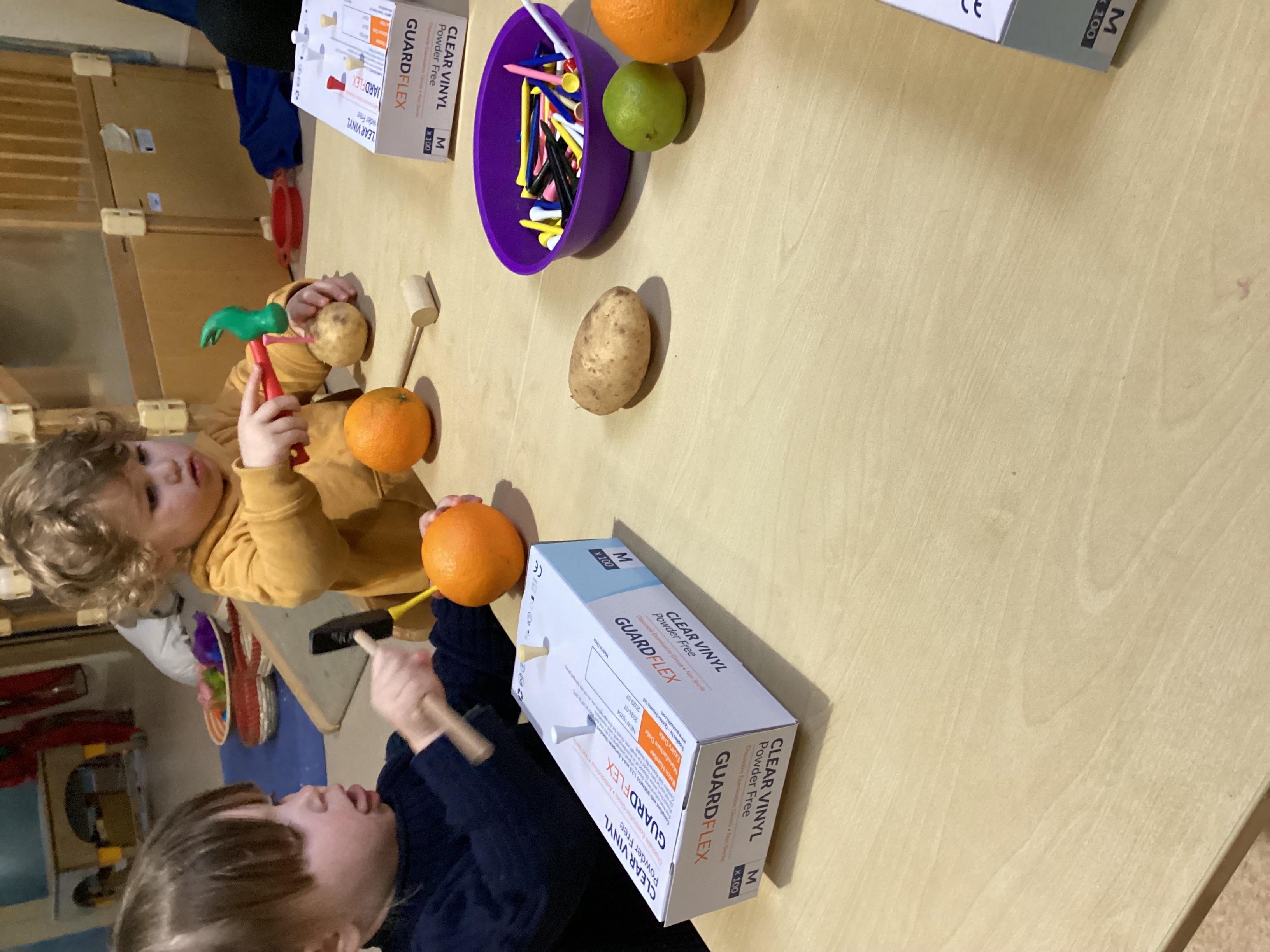 This week in the toddler room we have been exploring risky play, We got plastic pins and hammers to make wholes in different materials we compared the difficulty of the fruits finding the oranges were harder because of its tough skin, the children used words like “its hard” and “juicy” when discovering that making holes in the oranges would make juice squirt out. Some children found it easier using their hands rather than the hammers but persevered with the activity. The children made great use of their motor skills and hand eye co-ordination for this activity showing great care and focus.