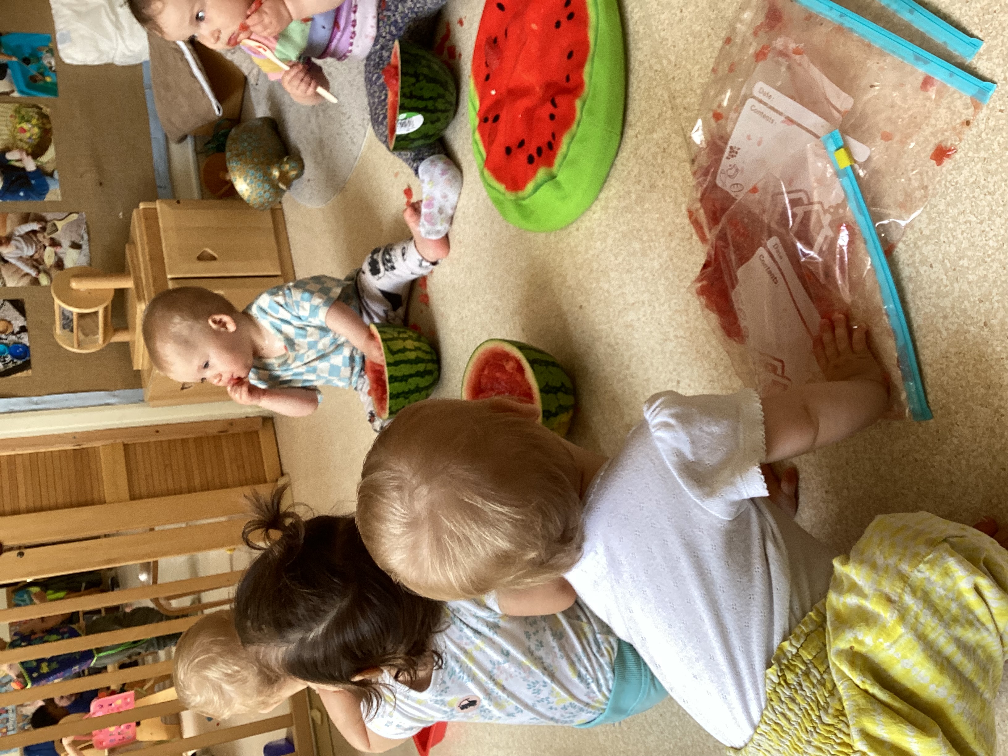This week in the baby room we continued to explore all things associated with summer, we decided to create another edible sensory experience using watermelons. First, we gave some of the watermelon into Ziplock bags so that they could visually explore the watermelon and its seeds by squishing it Inside the bag, this enabled the children who were not too keen on the texture to still explore and enjoy the experience. To extend this we then froze the watermelon inside the bags to enable for a further sensory experience whilst they explored the temperature and investigated and observed the texture as it defrosted. each of the babies their own half of a watermelon and allowed them to use their hands and spoons to scoop out the fruit. The babies love being able to taste as they play so this activity was a great way for them to explore. We then encouraged the babies to use their hands to scoop