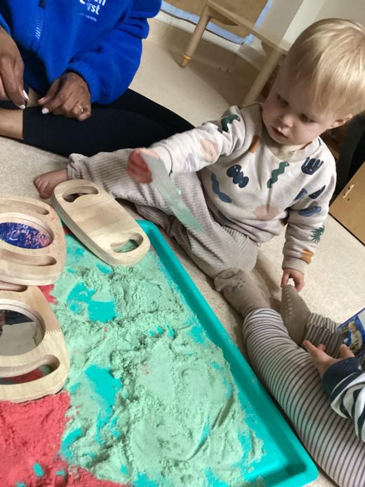 We placed individual photos of each child in a tray and covered them with brightly coloured powder. The children were encouraged to explore the tray, using their hands to uncover the hidden faces. It was such a joy to watch their reactions as they discovered themselves and their friends — with lots of pointing, smiling, and excited sounds.