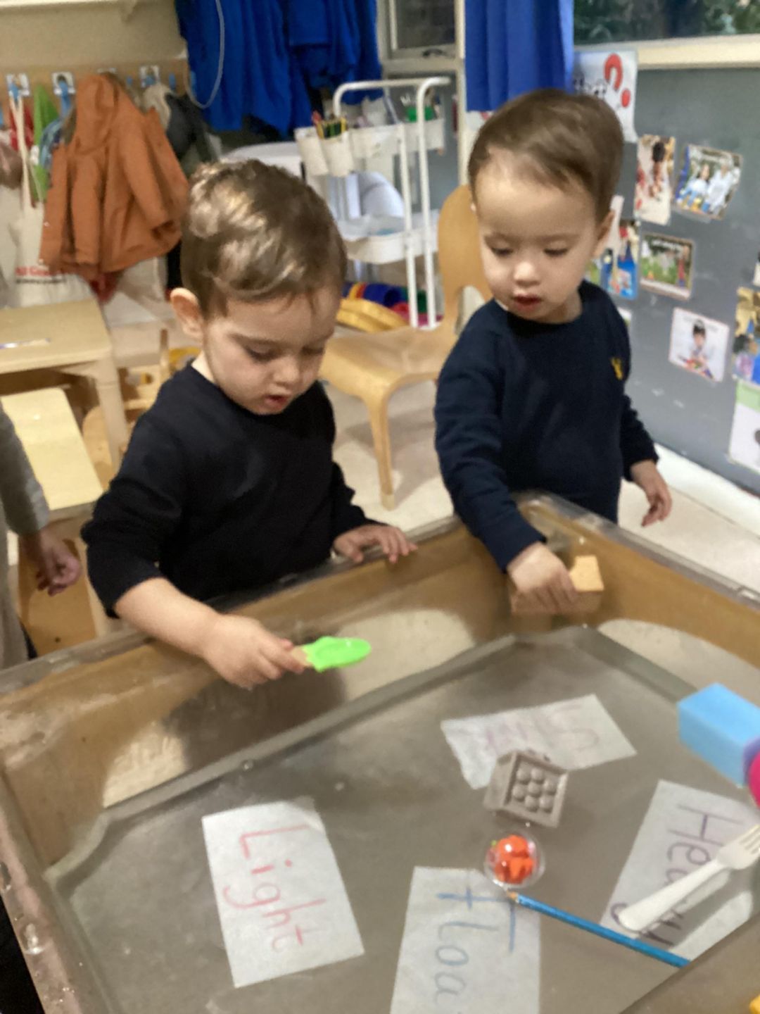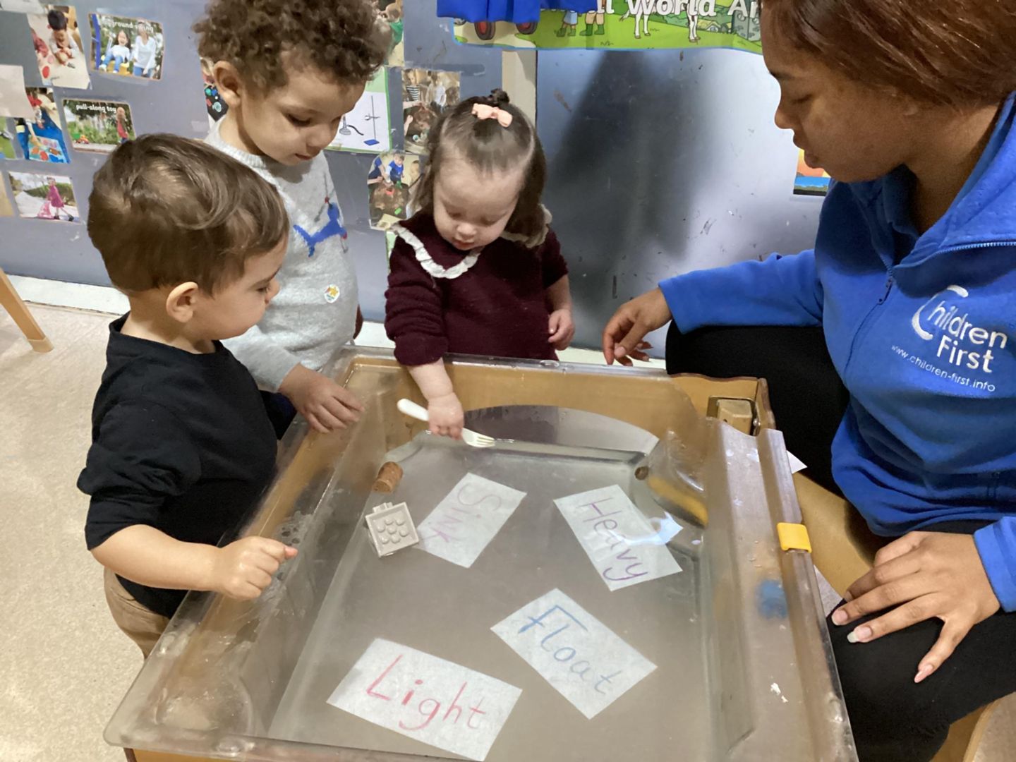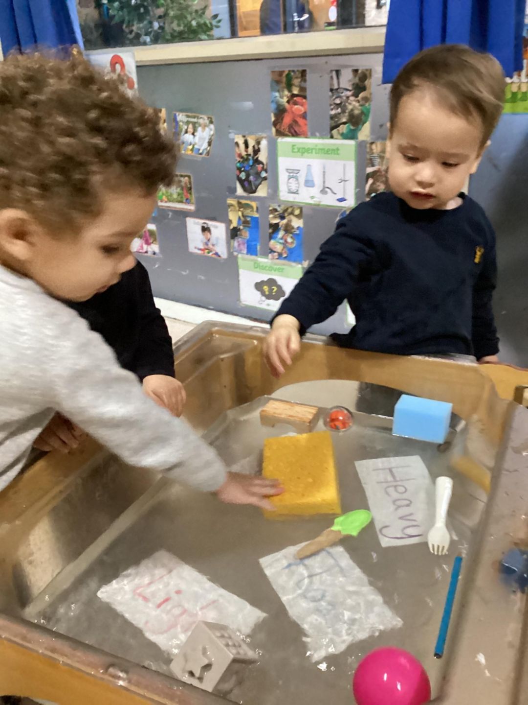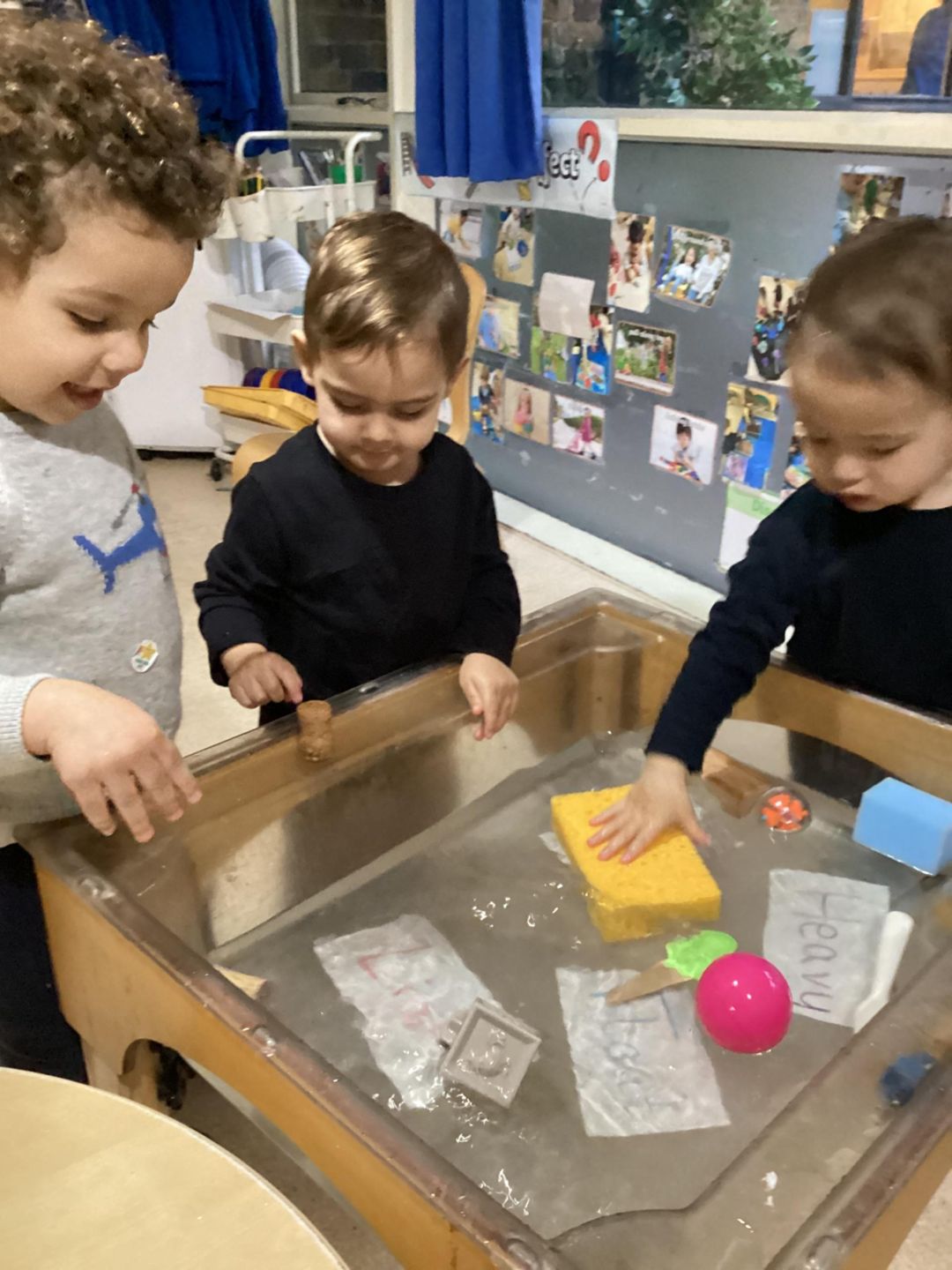 The toddlers took part in a fun and sensory-filled sinking and floating activity. A large tub of water was set up with a variety of simple objects for the children to explore, such as balls, blocks, cups, and natural items. The toddlers were encouraged to pick up the objects, feel their weight in their hands, and then place them gently into the water. They watched with interest to see what would happen next. Some objects stayed on top of the water and floated, while others slowly sank down to the bottom.