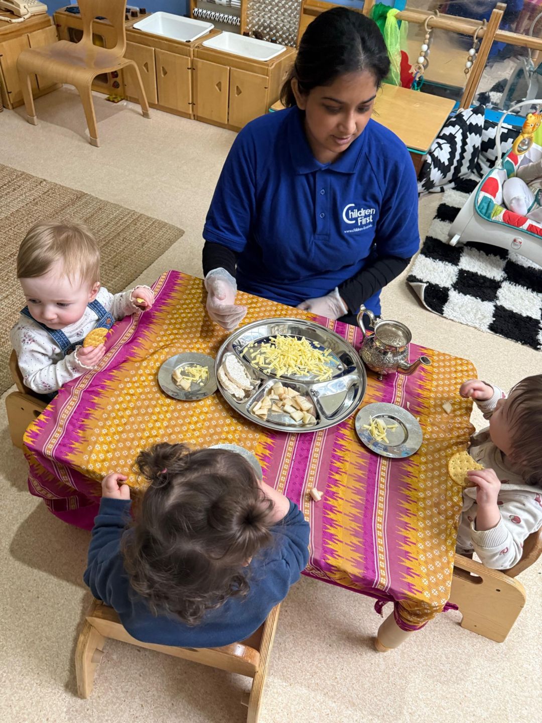 This week in the baby room, we marked the special month of Ramadan by turning our afternoon snack into a little iftaar celebration. We spoke about how Ramadan is a special time for many families around the world, and that iftaar is the meal eaten when the sun goes down. The children were curious and engaged as we created a warm, calm atmosphere around the table. For our iftaar meal, we enjoyed grated cheese, juicy pears, and crunchy crackers. The babies loved sitting together with their friends, sharing this special moment. They did a wonderful job pointing at what they wanted to eat and having all foods in their plates. This supported their independence, decision making skills, and fine motor development. It was a lovely opportunity to promote communication, and social interaction while celebrating different cultures and traditions.