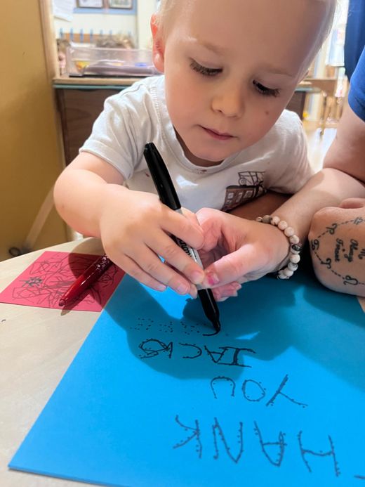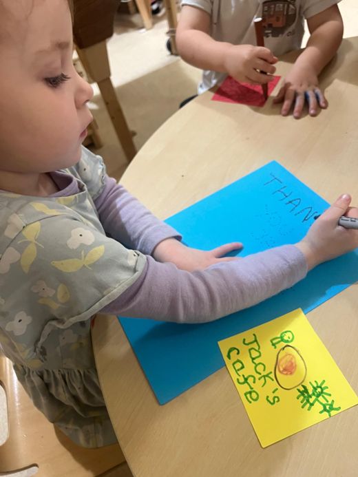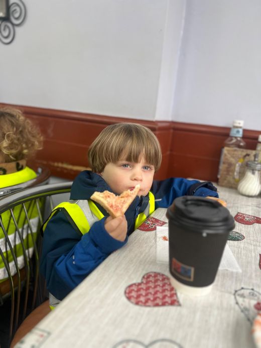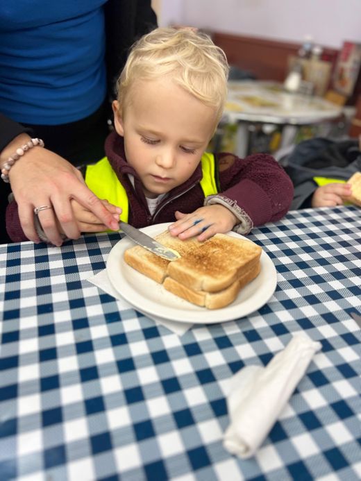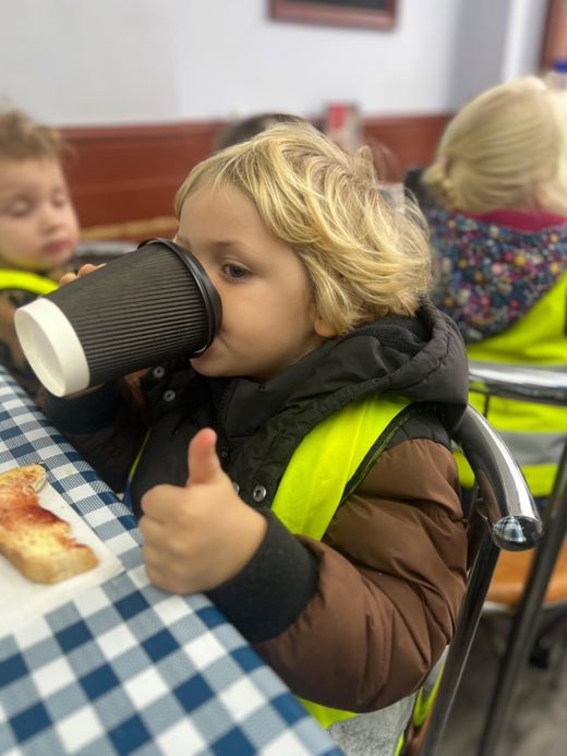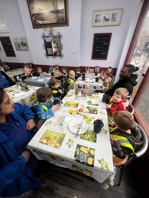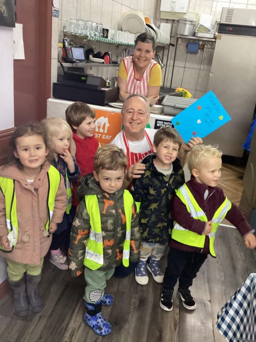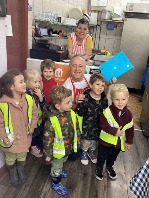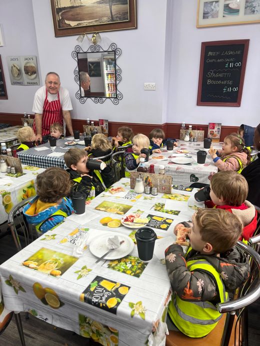 This week preschool visited our local cafe “Jacks cafe”, the children thoroughly enjoyed sitting down around the tables and discussing what we thought may be on the menu, the jam and butter came out and most of us guessed TOAST! The toast was given to us and we had the choice of having it with or without Jam. The children had pleasant conversations during this visit talking about other cafes they have visited and what they usually get, many saying they go and get “baby cino’s” with their mums and dads. After thoroughly enjoying their snack of toast (and jam) they were offered warm frothy milk in take away cups which they thought was amazing! “This is so warm to drink on such a windy day” and “mmm this is warming me all the way up” were some amongst many comments made. We said thank you to the owner and headed back to nursery where we all coloured in a picture and made a card to say thank you for our wonderful experience. The children used excellent mark making skills to write out the card and draw their pictures. When the card was all done some of us asked if we could go deliver it back today! So we quickly popped back to give our thank you card! The owner was very happy and we said thank you again in person.