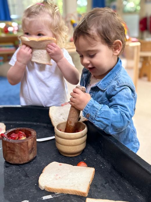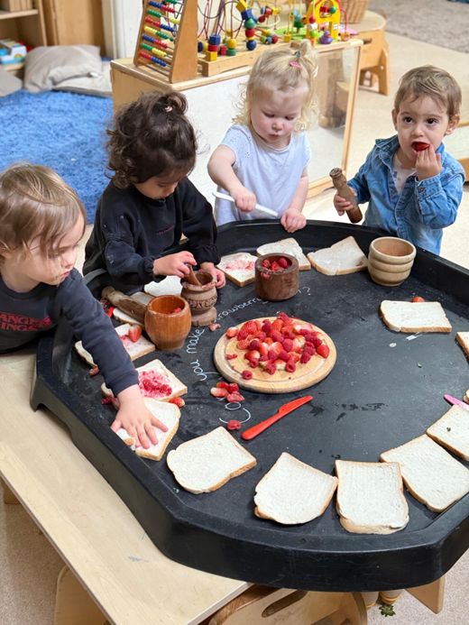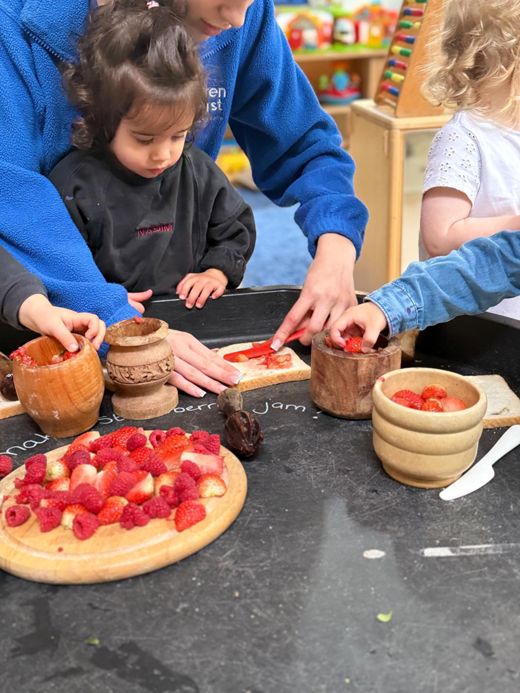 Once their jam was ready, the children used knives to carefully spread it onto pieces of bread. They loved exploring this sensory and imaginative activity and were thoroughly engaged in each step of the process — from mashing the fruit to tasting their creations!