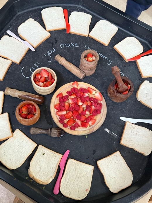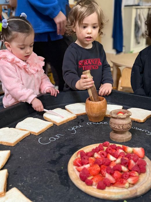 This week, the toddlers explored some fun role play where they made their very own jam! The children enjoyed picking strawberries and raspberries, which they then mashed using pestles and mortars to create their own fruity jam mixture.