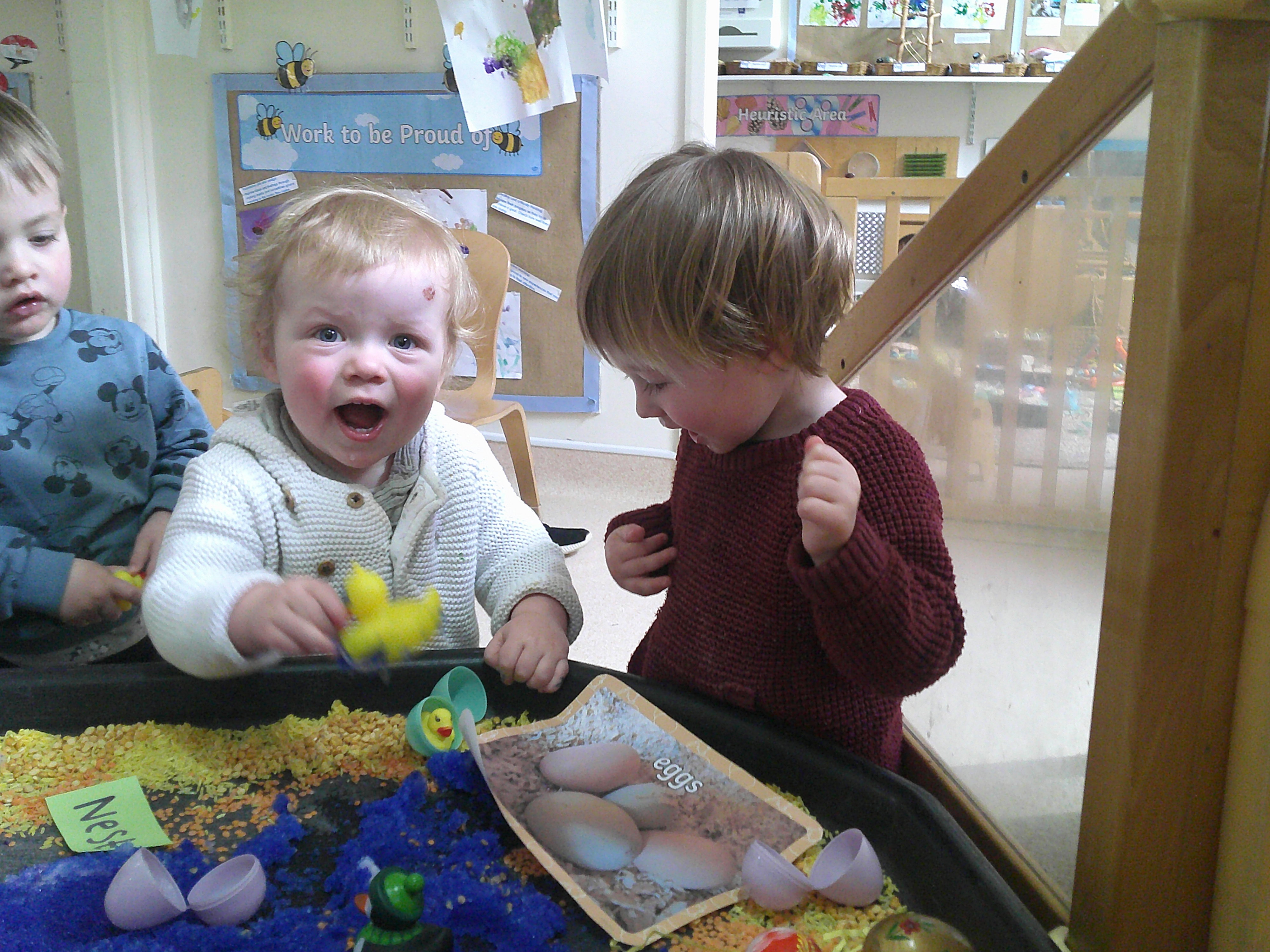 This week in toddler room the children have continued their knowledge of life cycles and explored the life cycle of a duck. The children looked at the different stages of how a duck is being formed the children used familiar words such as “egg and duck”. The toddlers then enjoyed their duck themed tuff tray exploring the eggs and the ducks in the tray. The toddlers explored different textures within the tray and enjoyed using their sense of touch to feel and explore the different texture. The children compared the big ducks to the small ducks and enjoyed filling up the eggs with the different sized chicks. The children enjoyed singing familiar nursery rhymes such as ‘5 little ducks went swimming one day’ as they were making their ducks swim in the water.