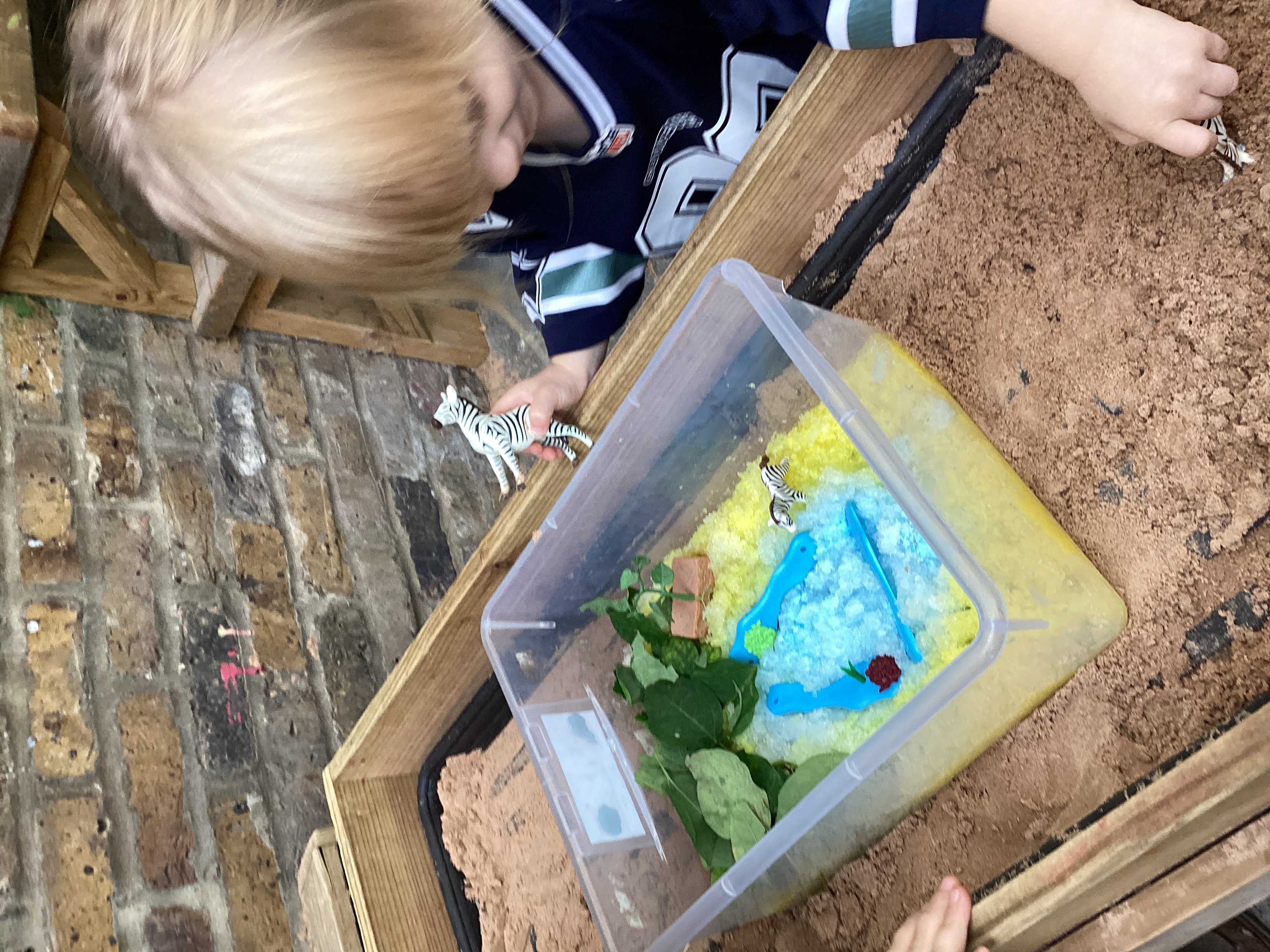 To end our blog we made different terrains focusing on one animal each and hid them in the garden trying to match their habitual area as much as we could. We used the binoculars and the telescopes to explore the garden and find the different animals being zoologists. We had so much fun exploring the sensory experience of each of the terrains and remembering the facts from their habitats and why they live in the places they do.