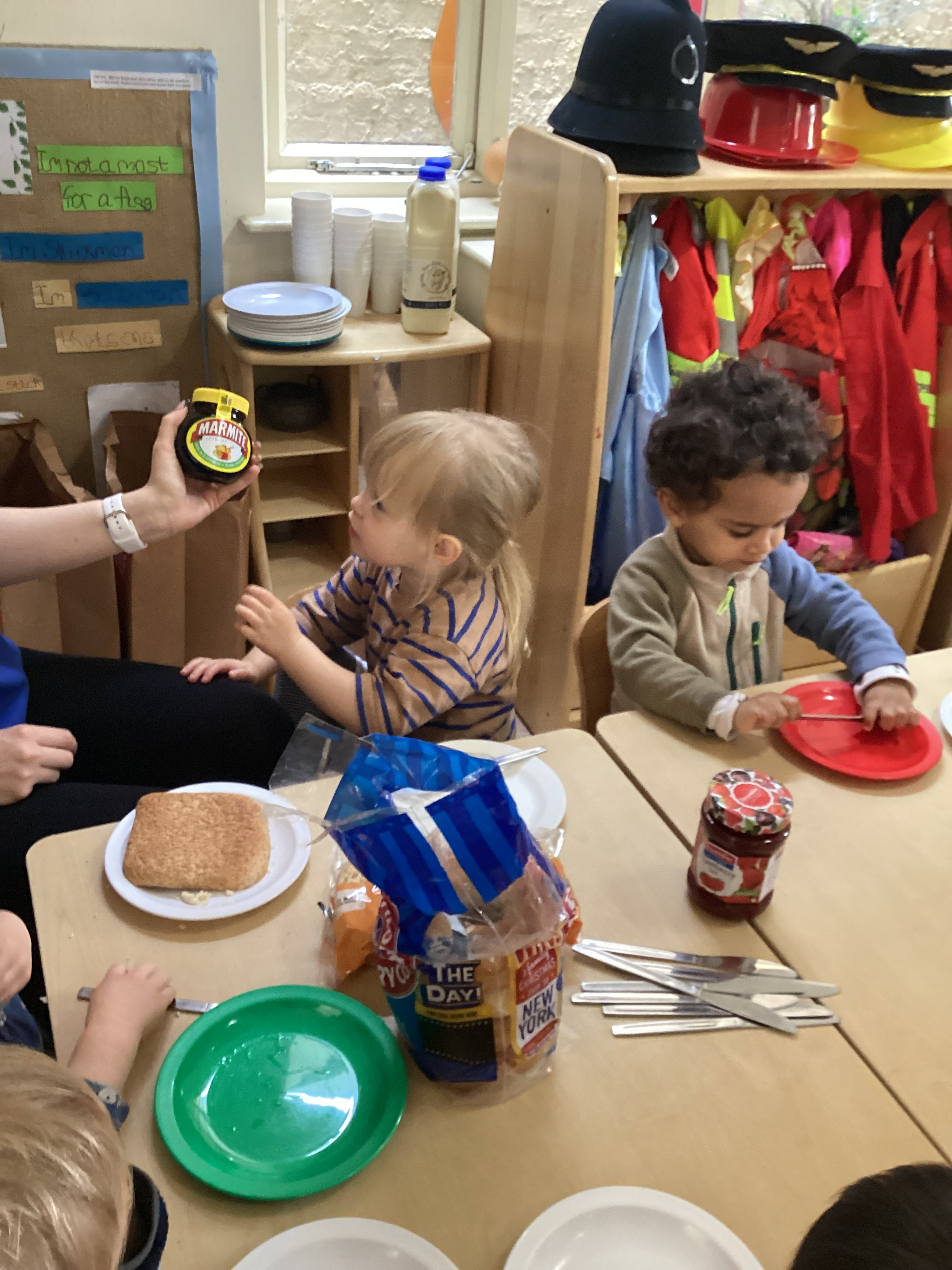 This week in preschool we continued our materials topic, we followed a child’s interest of making toast and extended it. We got bagels, crumpets and bread and explored their textures we then toasted them. Before using the toaster the children performed a risk assessment on the toaster and the knives, they explained that the toaster is hot and we need to be careful when putting the toast in and out and that knives are sharp so we must be careful with our fingers when buttering and cutting. We compared the feel of them from when they were toasted to when they were not, the children used words like “its more crunchy”, “it changed colour” and “I wonder how it’ll taste”. They then had a choice of spreads to choose from: Marmalade, jam, butter and marmite. They said that the jam was easiest to spread and the marmite was the hardest to spread as it was so sticky!