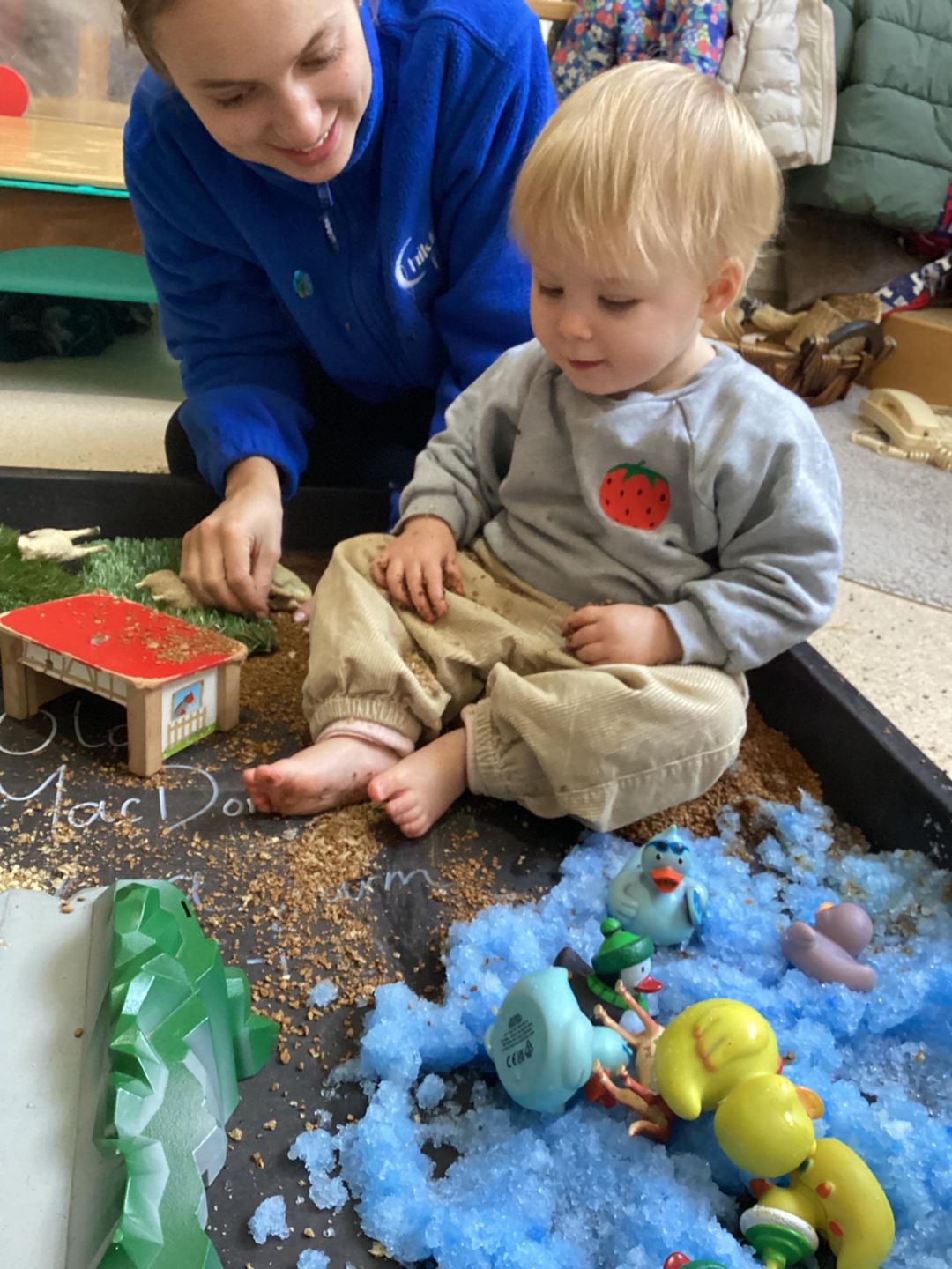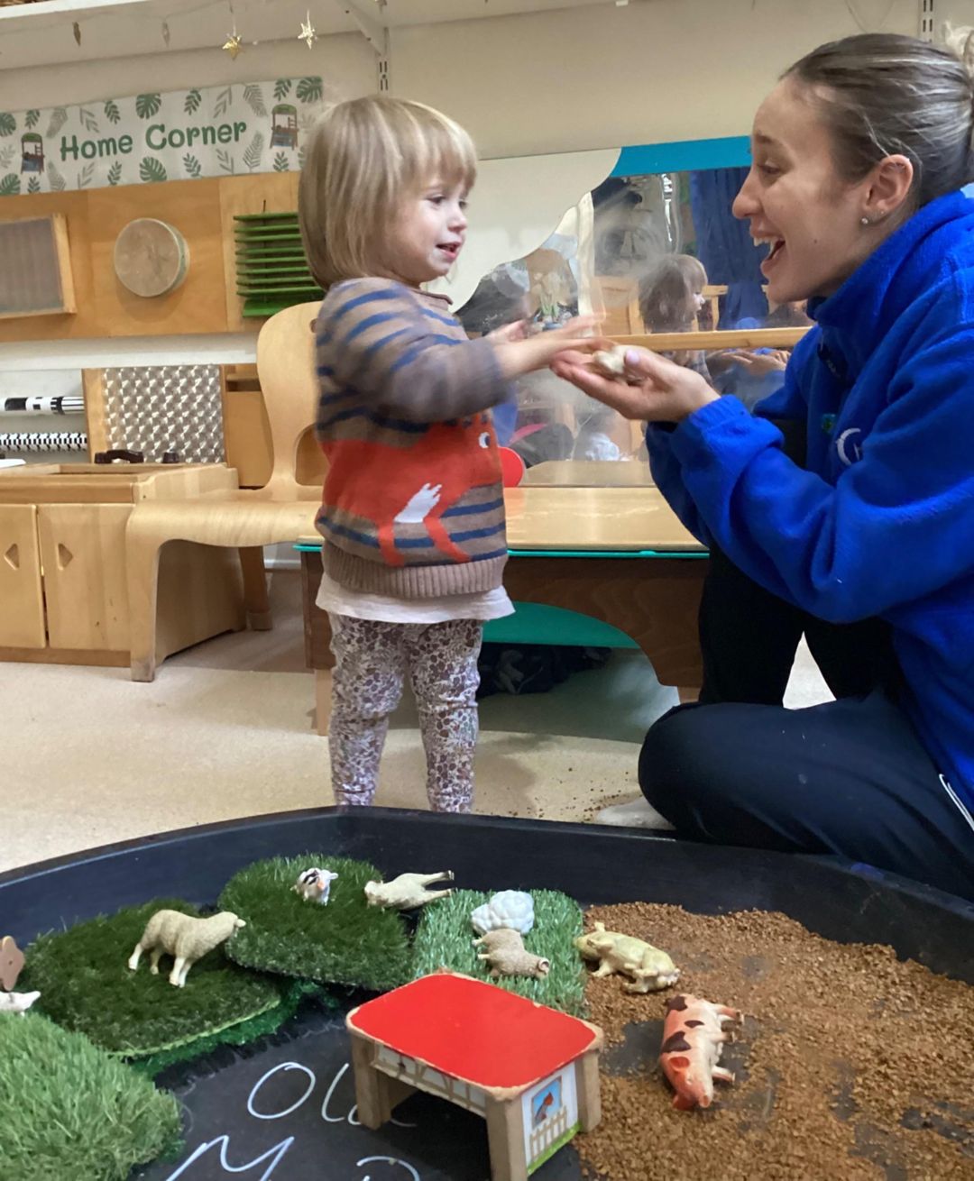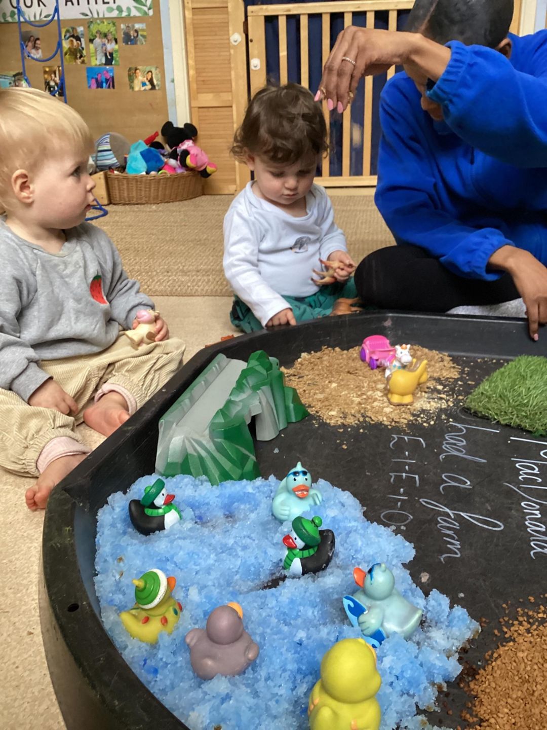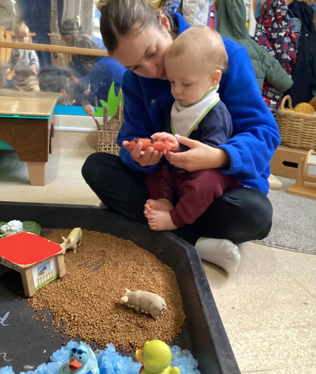 Throughout the activity, we talked about the different noises each animal makes, modelling words such as “moo,” “baa,” and “oink.” Several of the children showed great enthusiasm, attempting to repeat the sounds and copying actions as we played together. This activity supported sensory development, early language skills, and imaginative play, while giving the babies a rich, hands-on experience inspired by the farm.