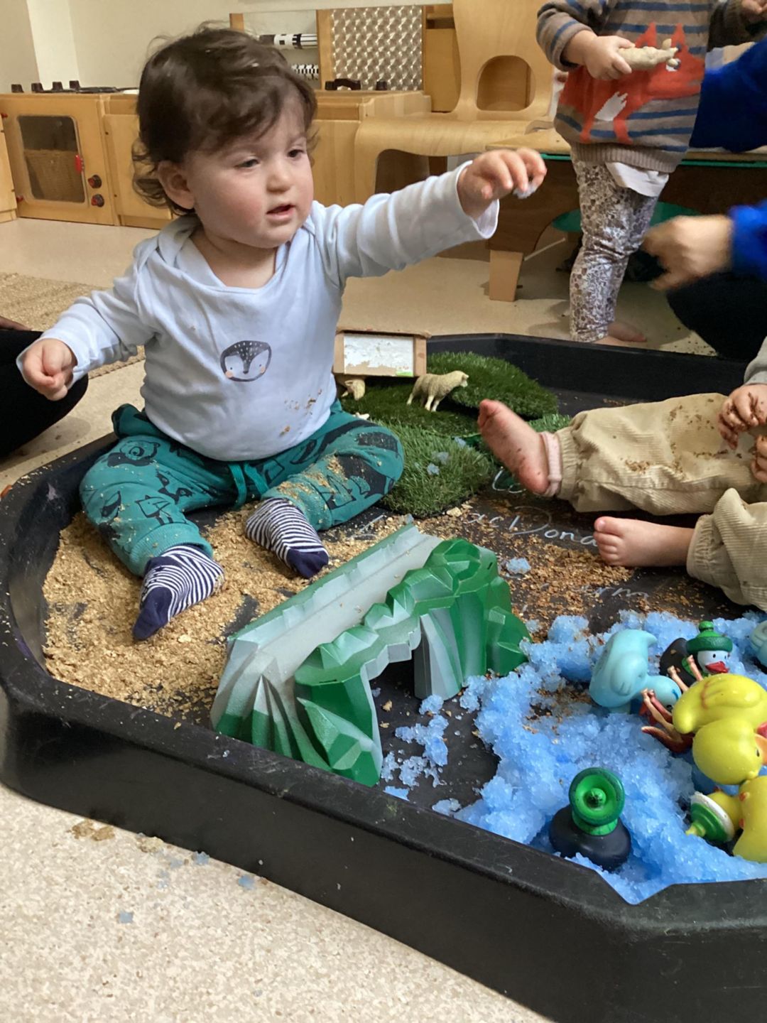 The babies eagerly investigated the materials with their hands, scooping, squeezing, and tasting as they explored. We added a selection of farm animal figures, which encouraged the children to engage in imaginative play moving the animals around, placing them in the different “environments,” and experimenting with sounds.