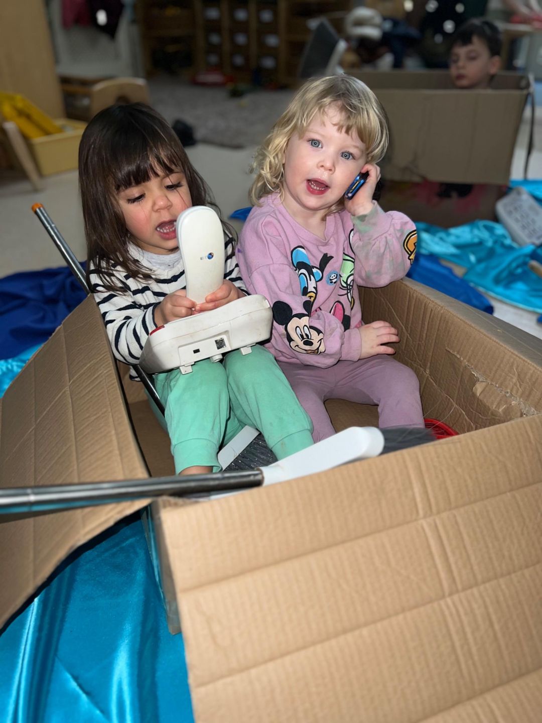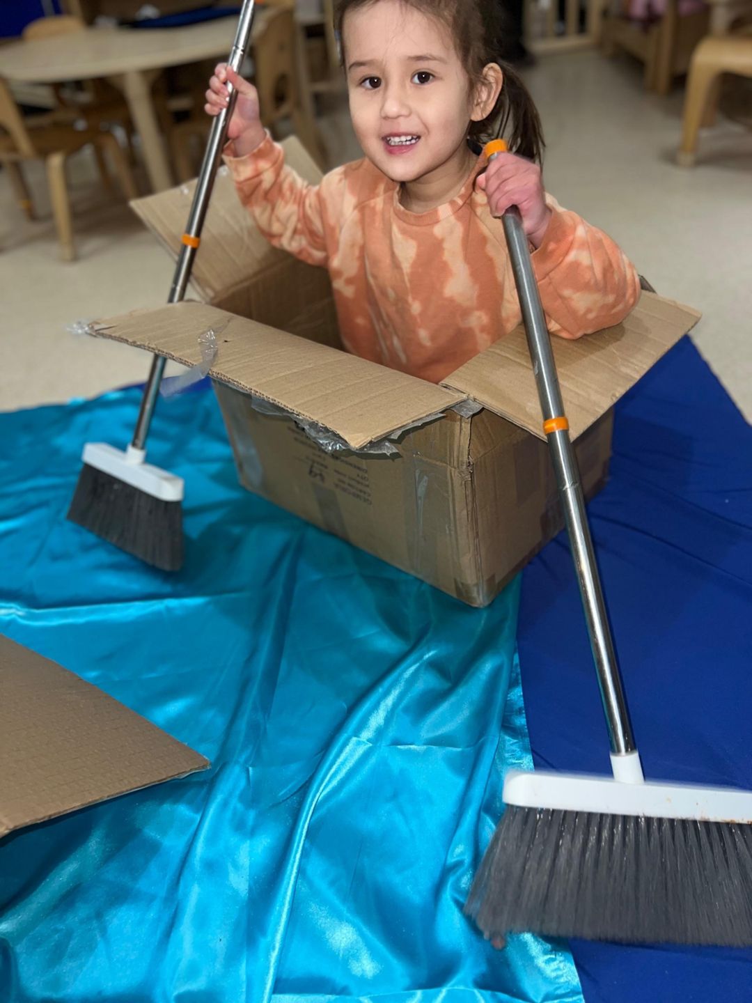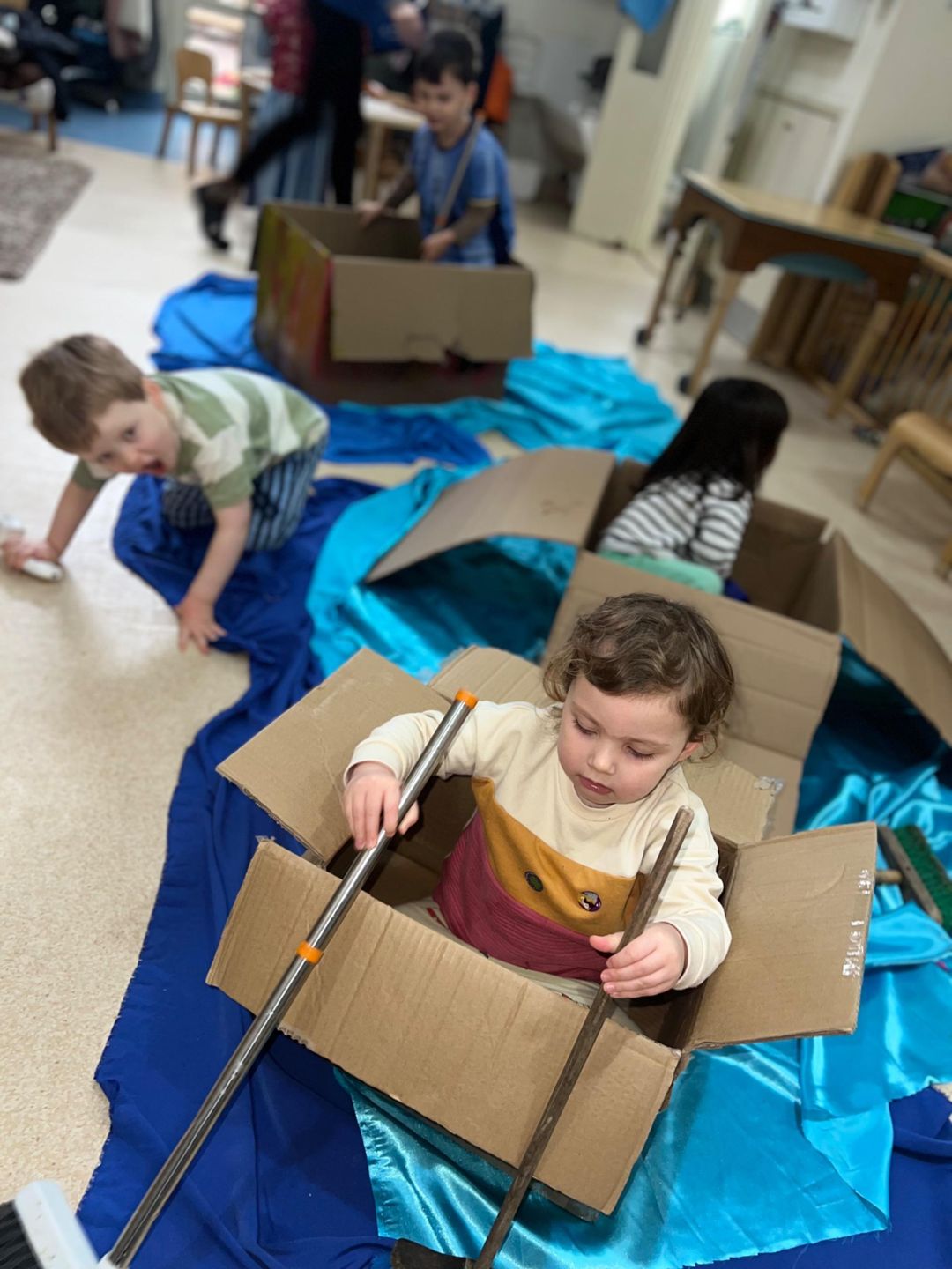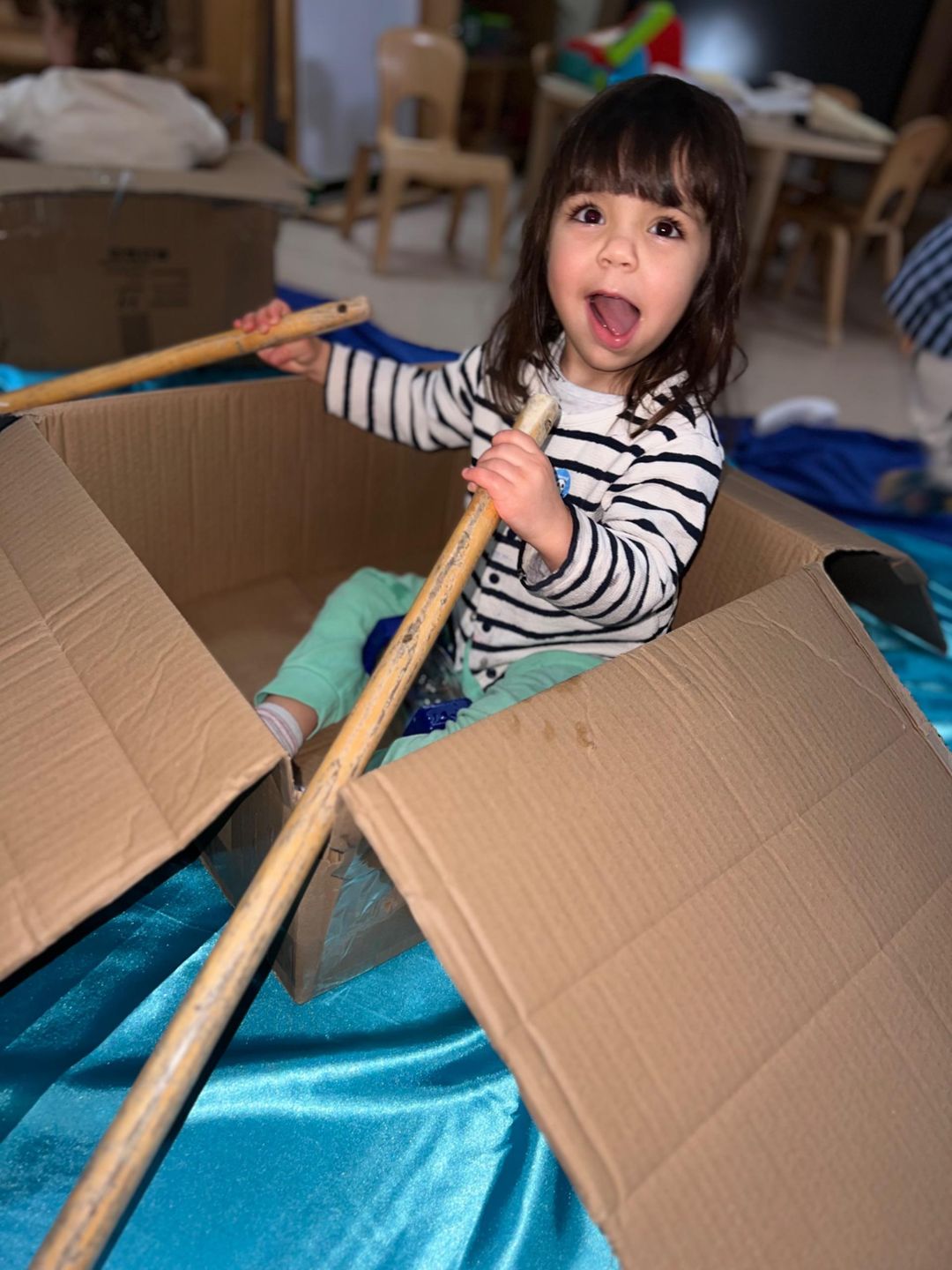 The children eagerly transformed a simple cardboard box into a pretend boat, sparking their creativity and teamwork. To start, we painted the boxes together and left them to dry, giving them a bright and colourful “boat” appearance. Once ready, we extended their role play by laying blue material on the floor to represent water and placing the boxes on top. Armed with brooms as paddles, the children climbed into their boats, imagining adventures on the high seas, steering, rowing, and creating their own imaginative scenarios. They laughed and collaborated, using the props to act out stories, explore roles, and bring their ideas to life in a playful and engaging way.