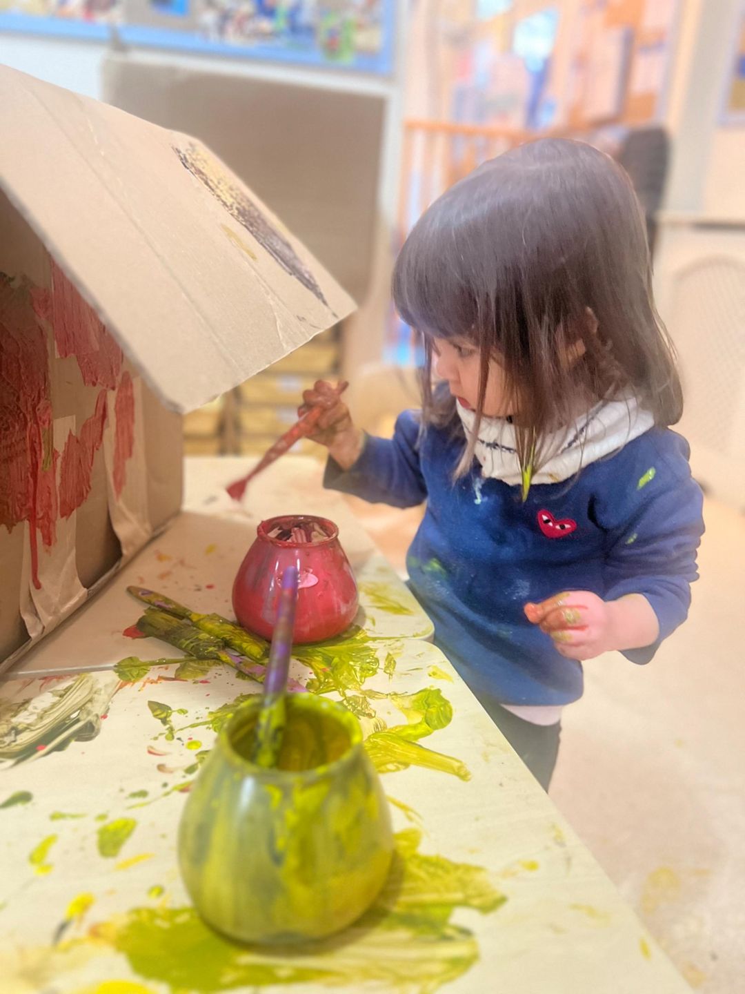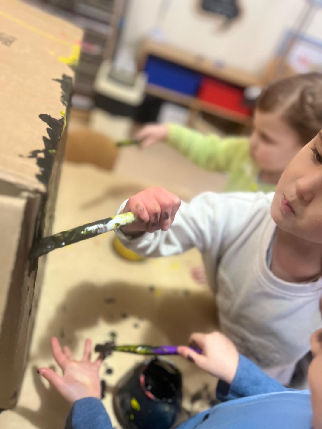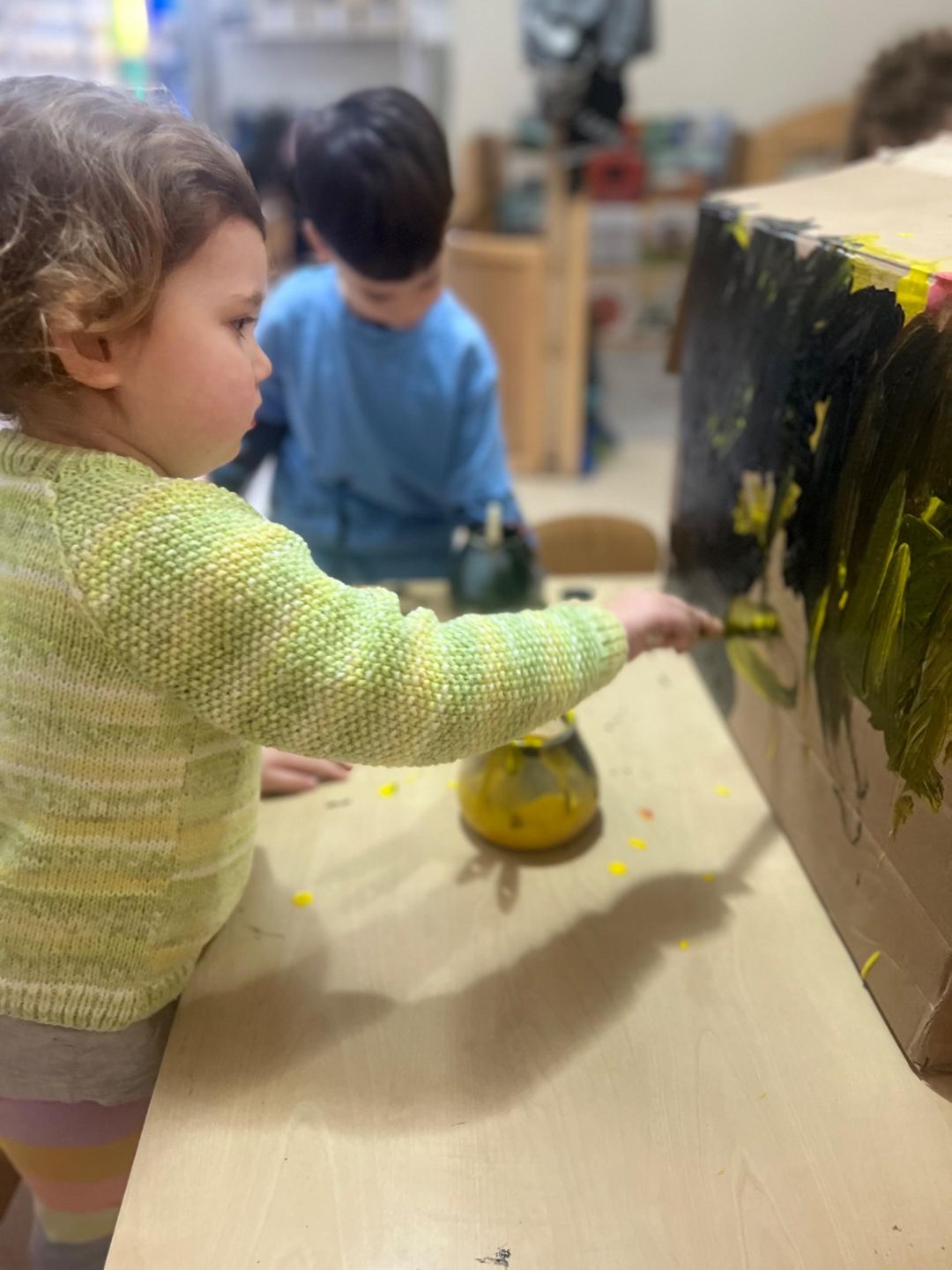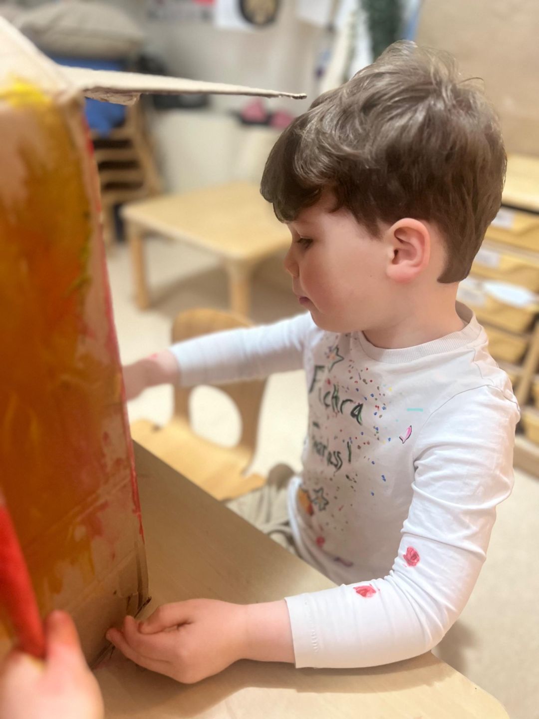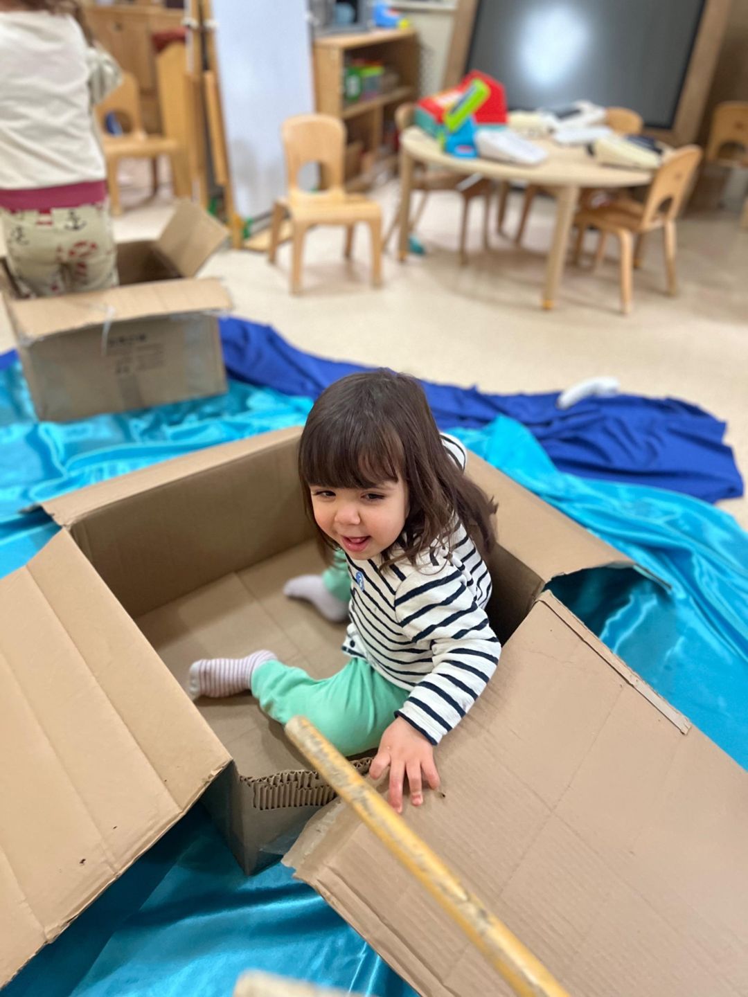 The children eagerly transformed a simple cardboard box into a pretend boat, sparking their creativity and teamwork. To start, we painted the boxes together and left them to dry, giving them a bright and colourful “boat” appearance. Once ready, we extended their role play by laying blue material on the floor to represent water and placing the boxes on top. Armed with brooms as paddles, the children climbed into their boats, imagining adventures on the high seas, steering, rowing, and creating their own imaginative scenarios. They laughed and collaborated, using the props to act out stories, explore roles, and bring their ideas to life in a playful and engaging way.
