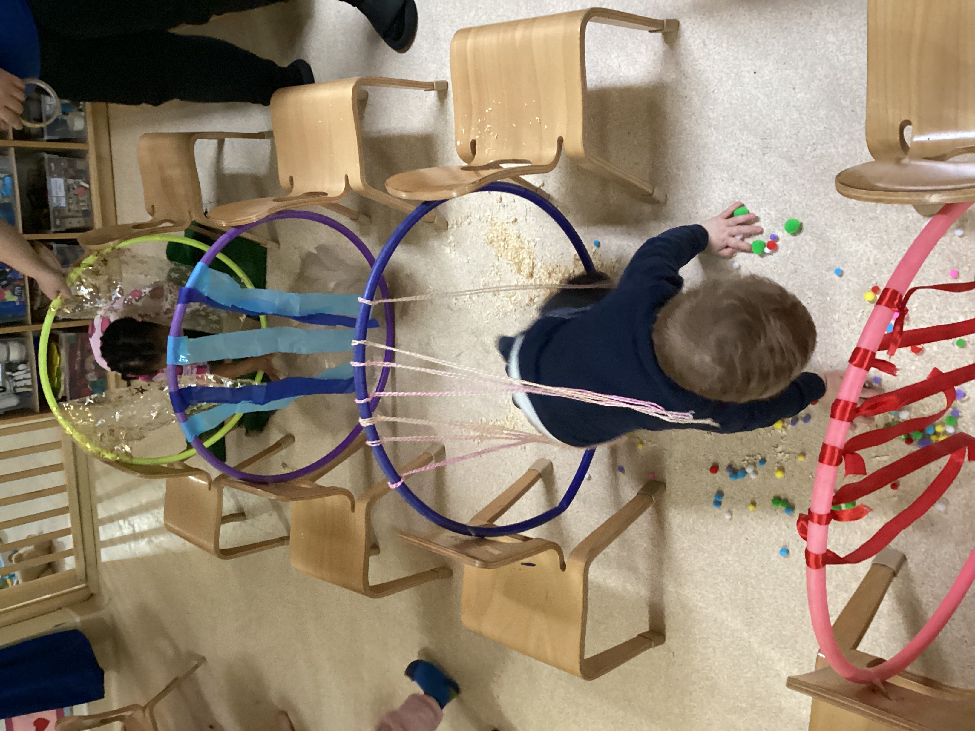 This week in preschool, we explored our sense of touch through an obstacle course and sensory buckets. The obstacle course consisted of different textured hoola hoops. The hoola hoops had string, tissue paper, material and ribbon attached. In between each of the hoola hoops were other textures such as sand, hay, pompoms, grass and beanbags. The children took it in turns to use their gross motor skills to crawl through each of the hoola hoops. They described the different textures that they could feel, using words such as “cold”, “soft”, “squashy” and “crunchy”. The children really enjoyed it and kept going round again.