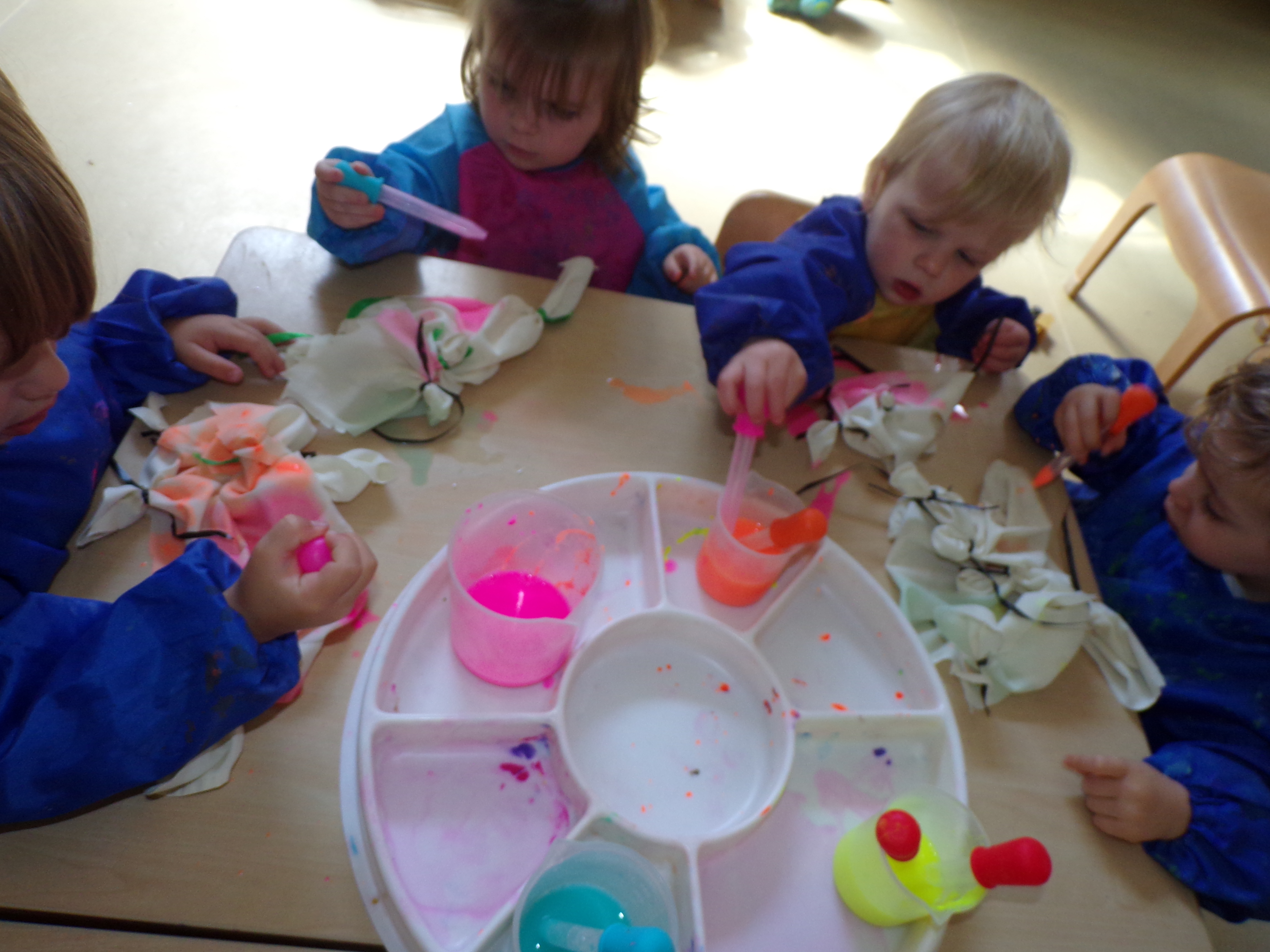 The children used the pipettes and their fine motor skills to transfer and drip their colours onto the fabric to explore the colours mixing together and change in effects on the fabric.