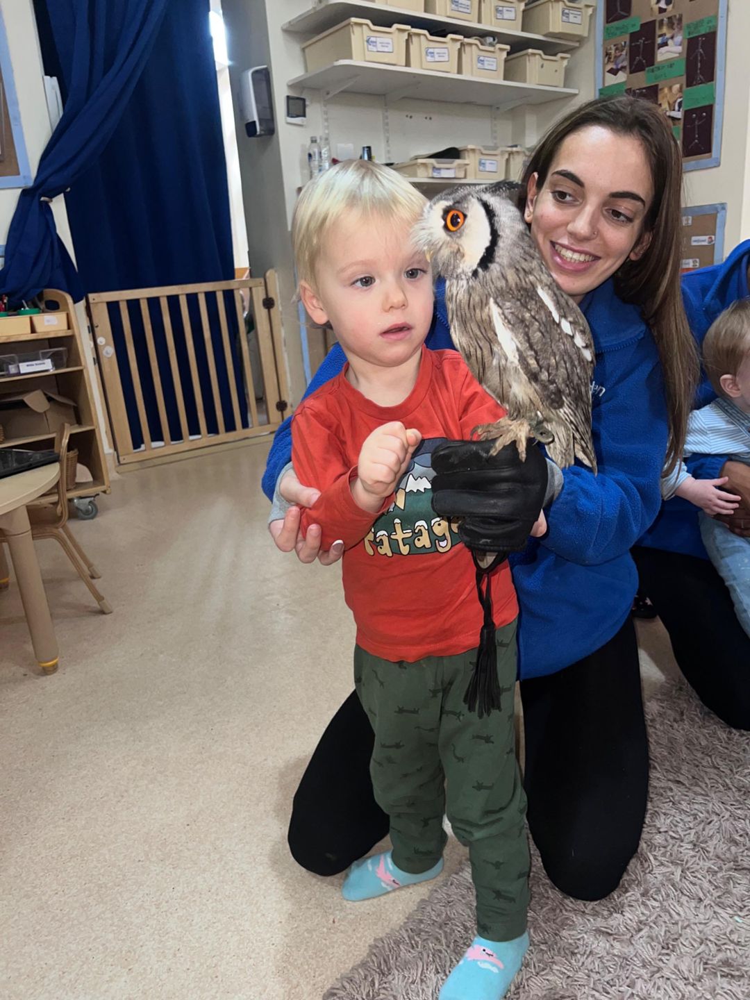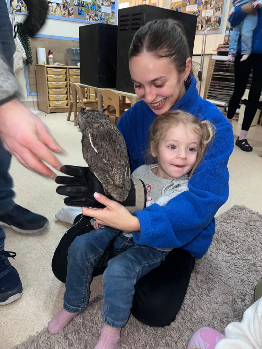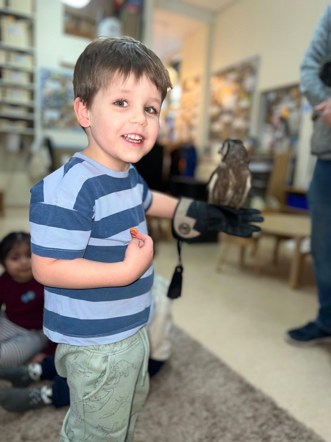 Owl adventures came to visit our nursery and brought some very special animals with him. He had three owls and one hawk, and everyone was very excited to see them. He told us about each bird and explained how to stay calm and quiet so we wouldn’t scare them. We watched in amazement as the owls and the hawk flew across the room, spreading their wings wide and landing carefully.