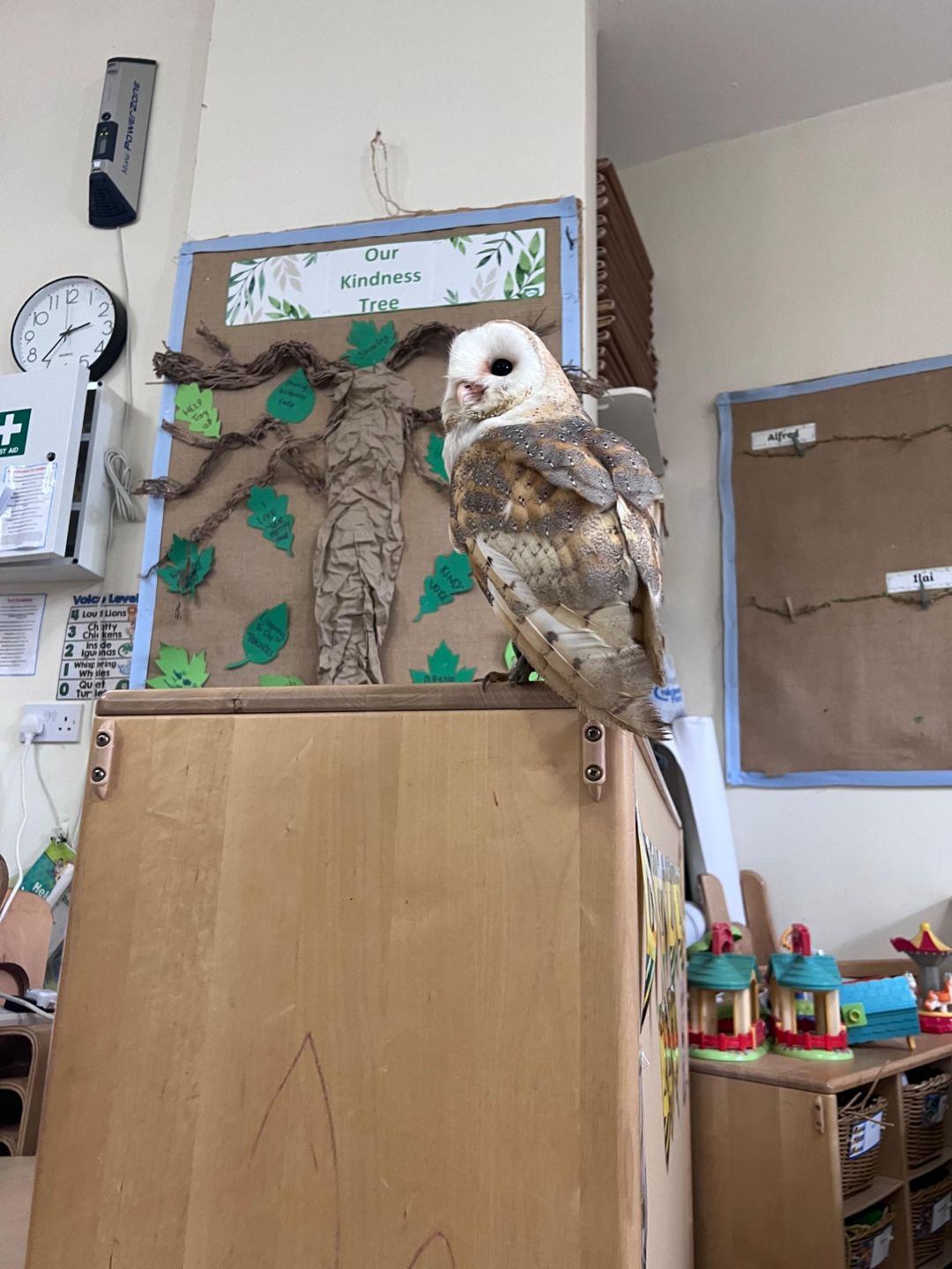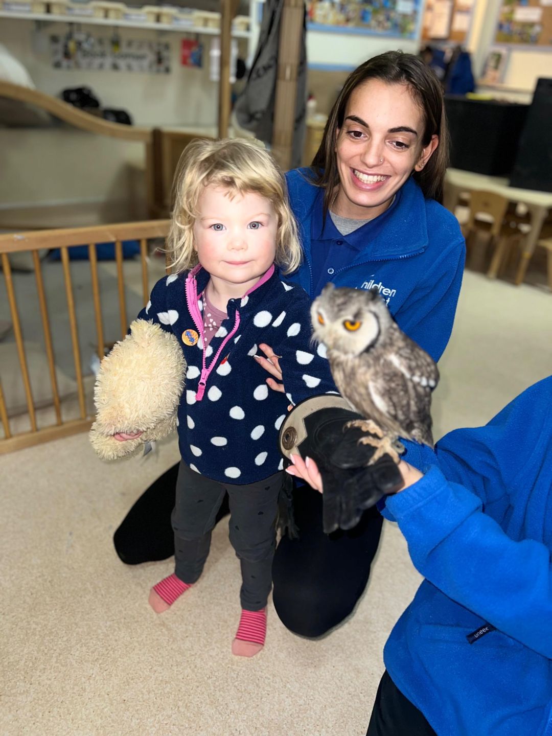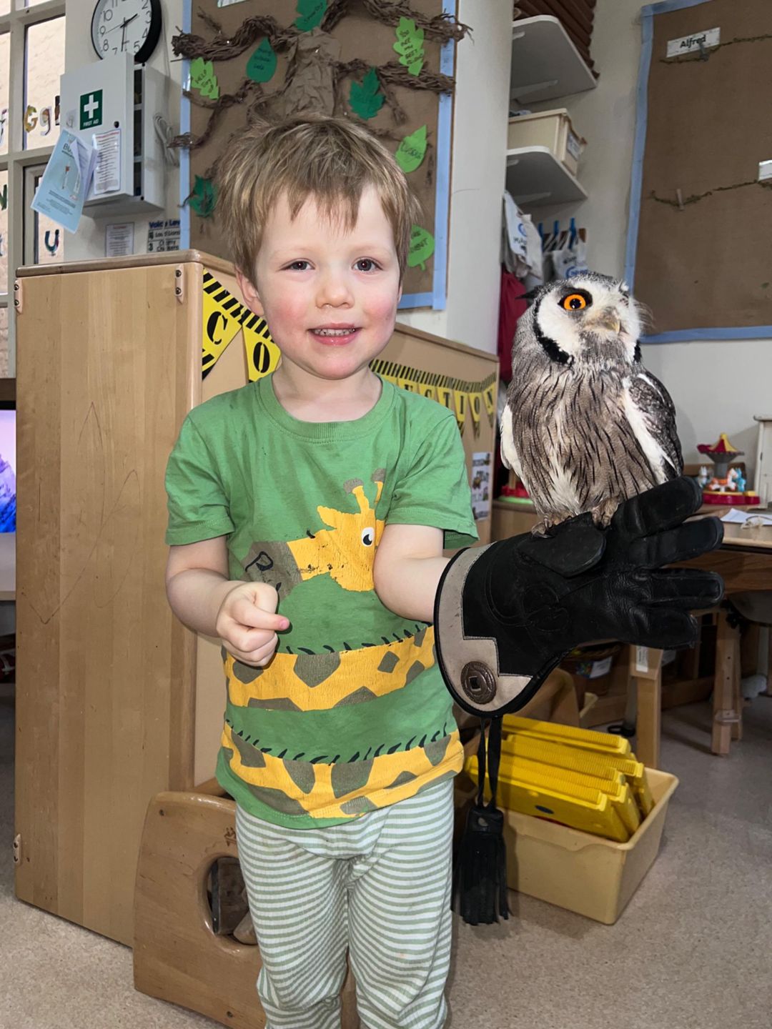 Owl adventures came to visit our nursery and brought some very special animals with him. He had three owls and one hawk, and everyone was very excited to see them. He told us about each bird and explained how to stay calm and quiet so we wouldn’t scare them. We watched in amazement as the owls and the hawk flew across the room, spreading their wings wide and landing carefully.