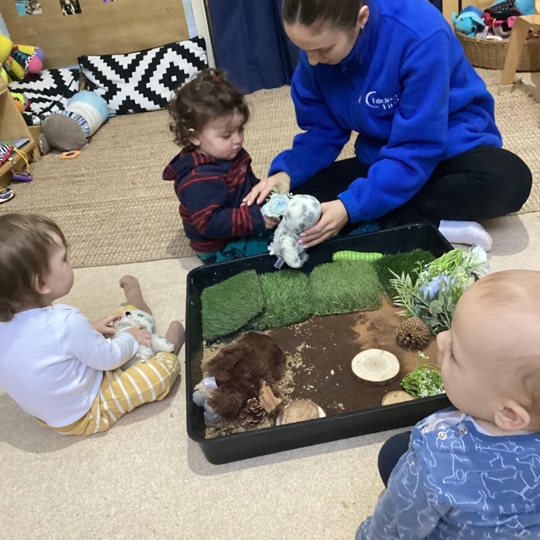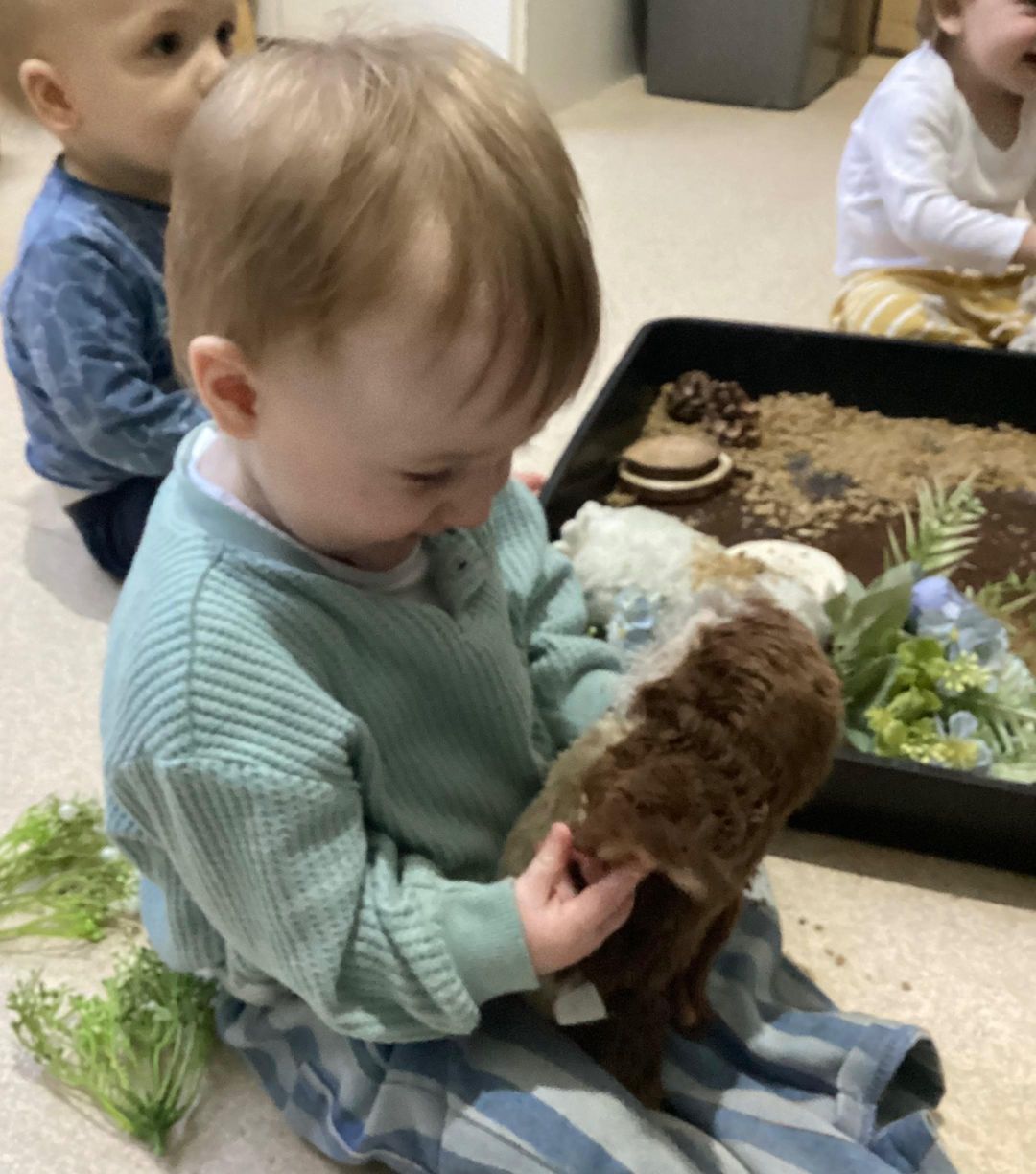 The owl babies were placed around the tray, and the babies quickly became engaged, using their hands to explore the different textures and interacting with the owls and feeding the owls food. They showed care and affection by cuddling the owl babies and enjoyed playing alongside them. The babies were fully engaged throughout the activity and clearly enjoyed the sensory experience.