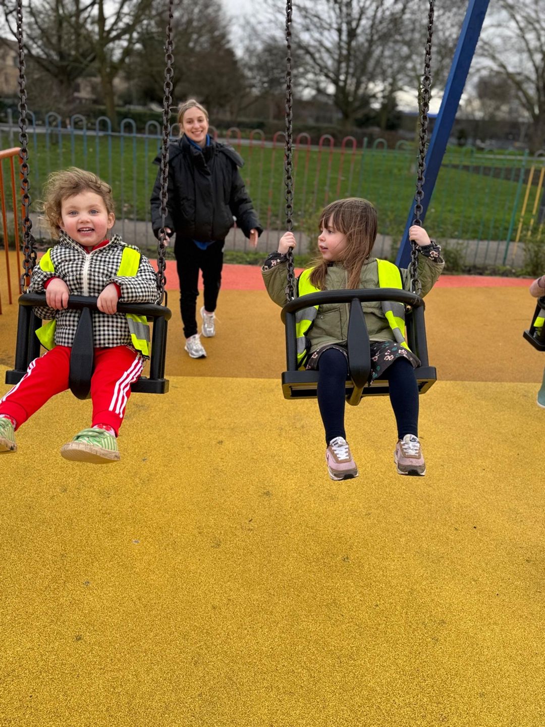 Of course, the playground was just as exciting. The children took turns on the swings, soaring back and forth through the air. They climbed up the steps to the slide and came down with big smiles, sometimes going again and again. The park was filled with happy voices and joyful play.