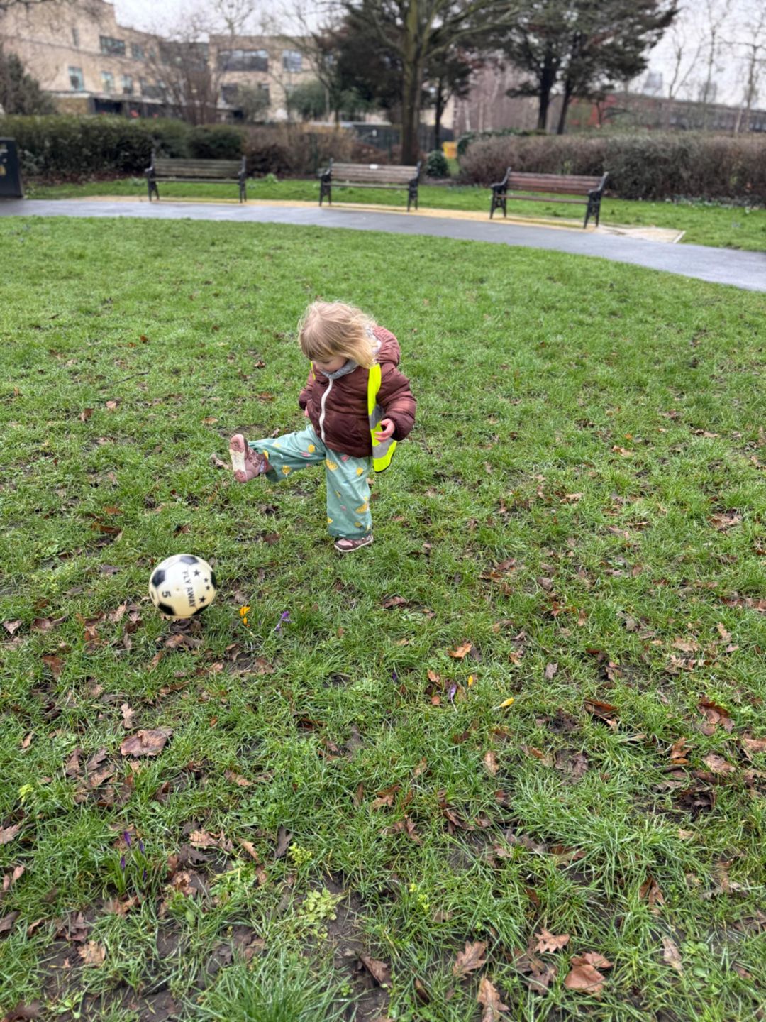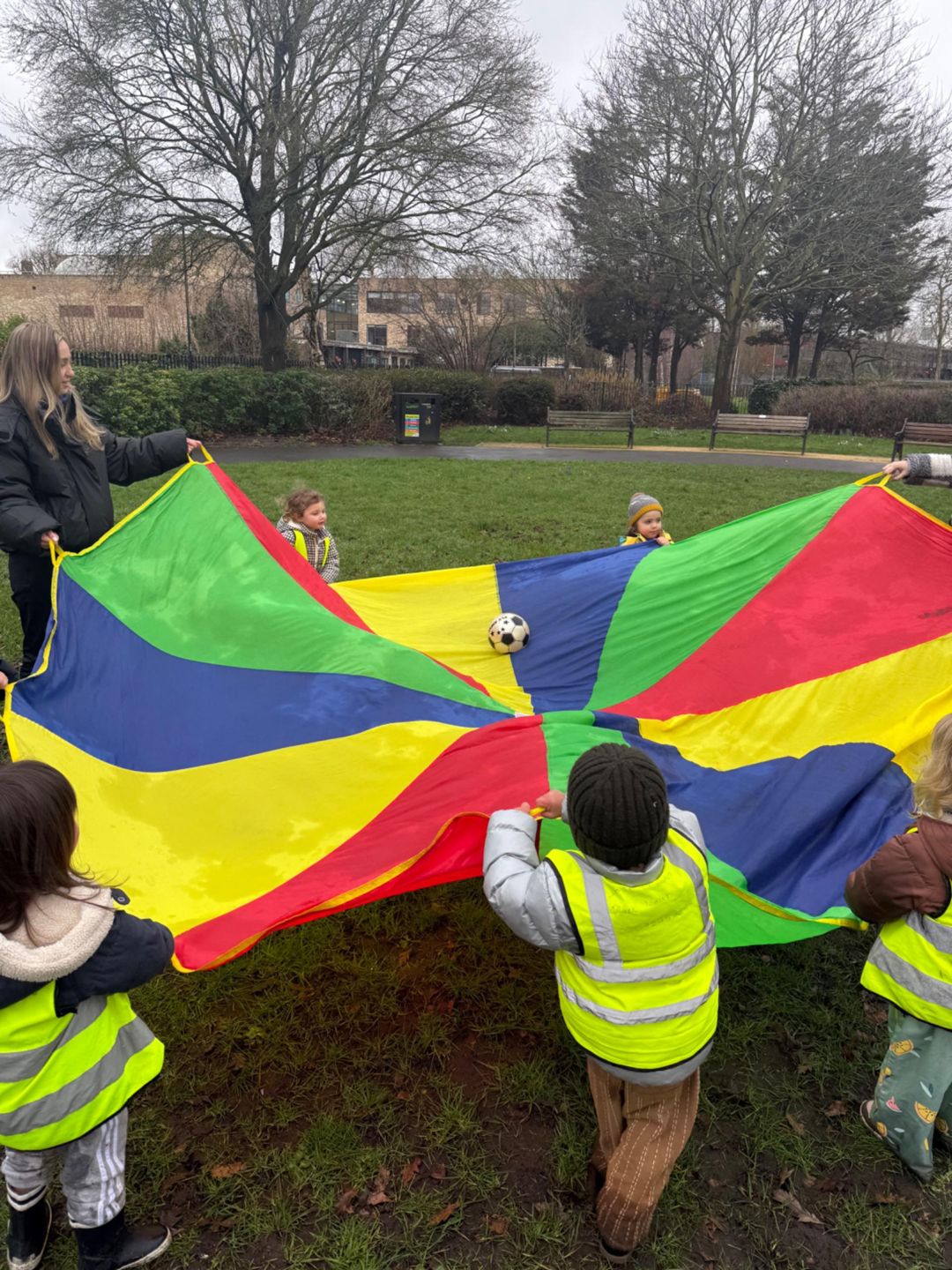 The children in preschool went for a walk to the park. We played with the big, colourful parachute. All the children held onto the edges and worked together to lift it up high into the air and then bring it down low. We placed a ball in the middle and watched it bounce and roll as we moved the parachute. They enjoyed working as a team, listening carefully and moving together. Then we kicked balls around on the grass. Some children practiced kicking the ball to their friends, while others chased after it with lots of energy. There was so much laughter as the balls rolled in different directions. Everyone had a turn and felt proud when they made a big kick.
