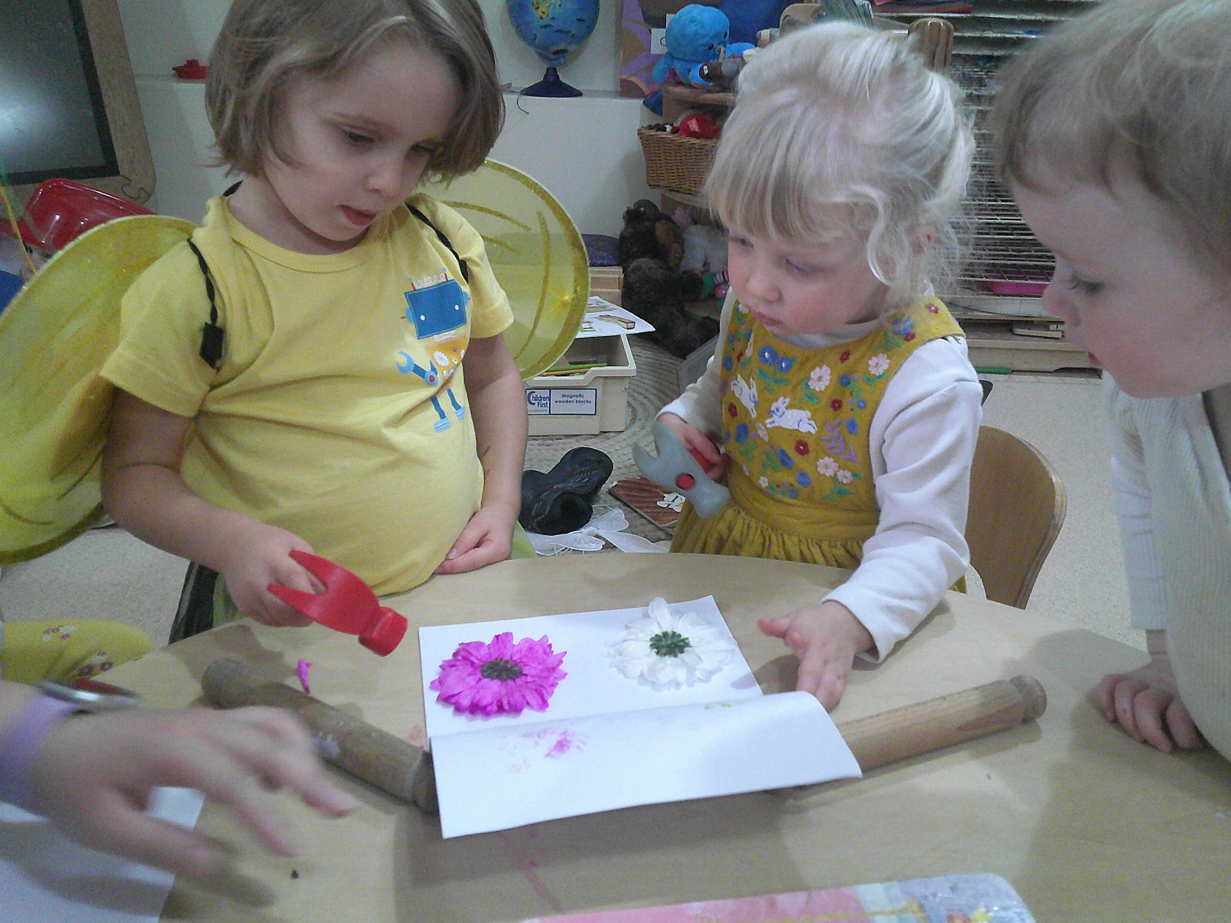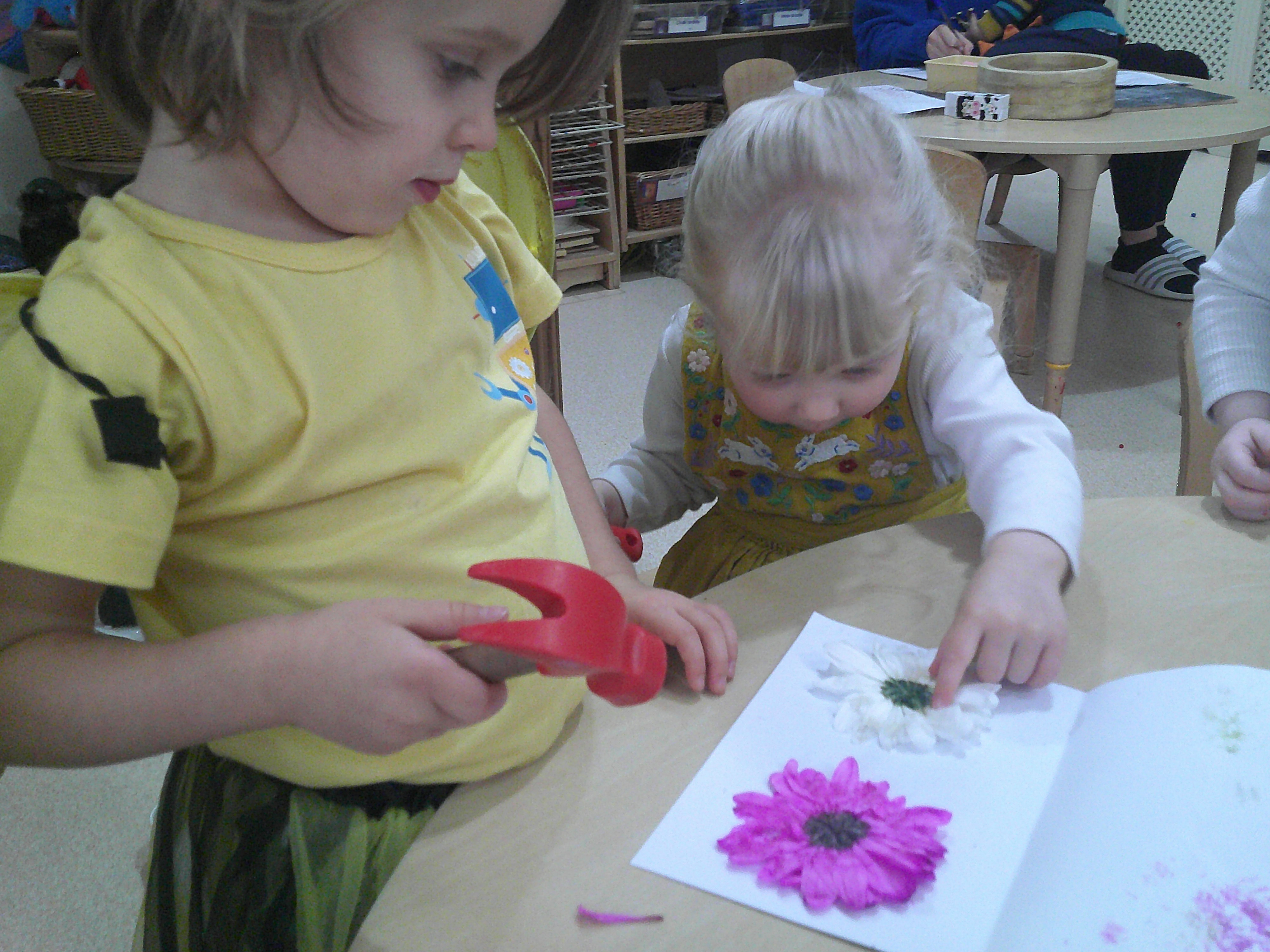 This week in preschool we pressed some flowers! We experimented with different techniques to see which would work best. Some of the children used their toy hammers whilst others used rolling pins. We also used the more traditional technique of putting it between books and leaving it for a few days. By the end of the week the children had a look at their flowers and compared the different techniques. They concluded that the hammers did not work as well as the rolling pins and books as the flower petals fell apart. We extended the activity by using our pressed flowers to create lovely artwork!