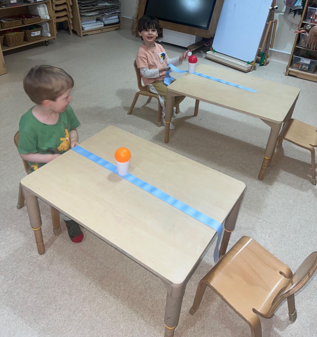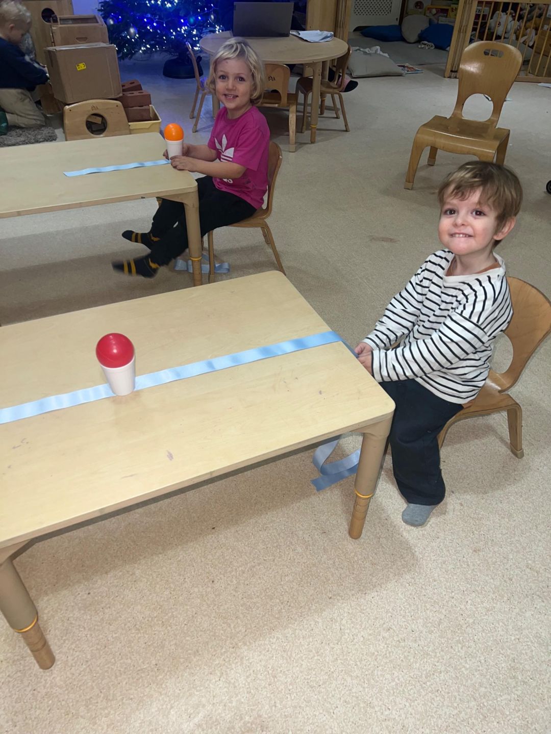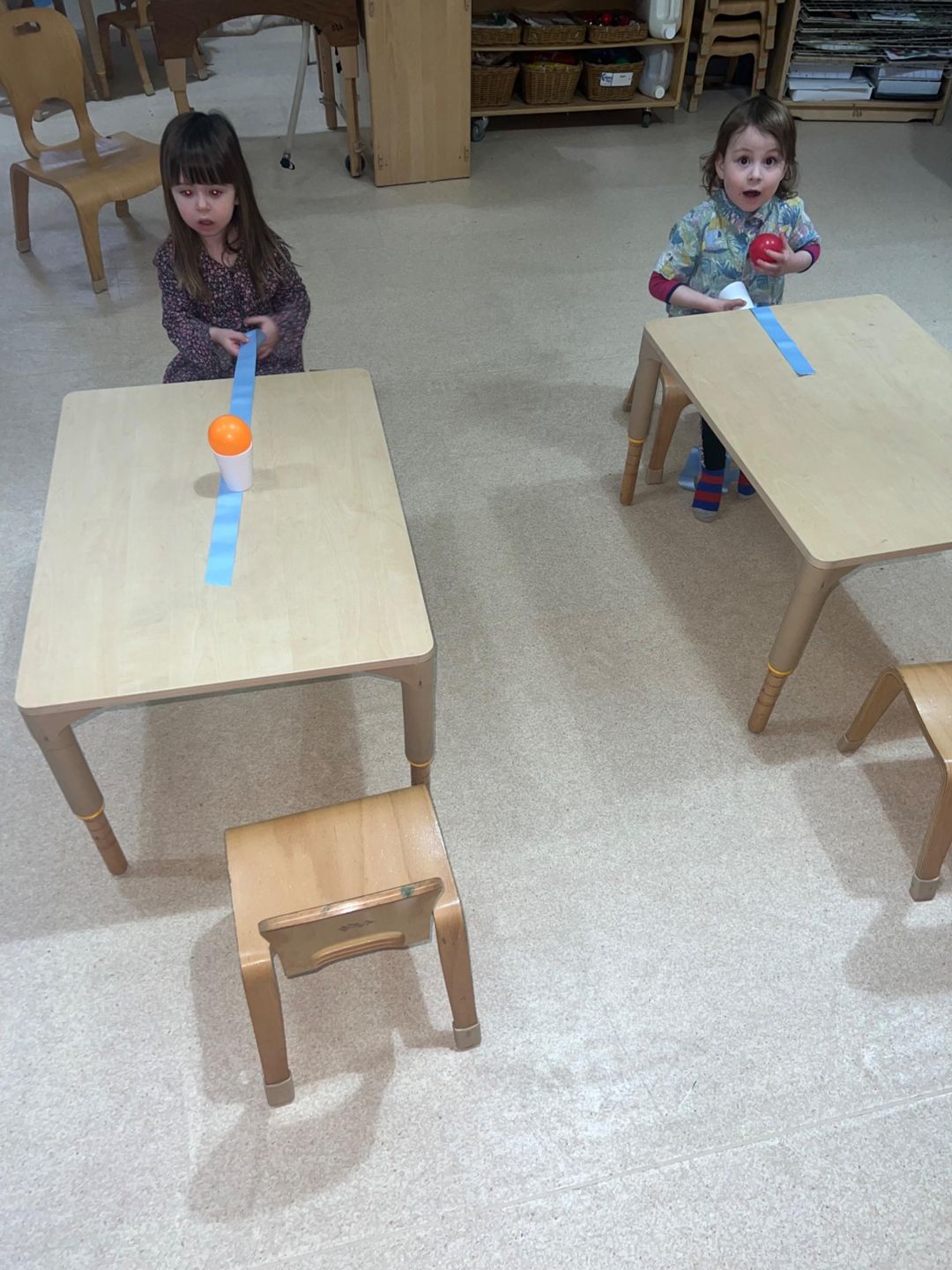 This week the children all took part in a competitive and exciting activity that involves a lot of cheering on and speed. The teachers explain and demonstrate to them that the task was to try and get the cup to the other end of the table whilst it is resting on top of a long strip of ribbon.