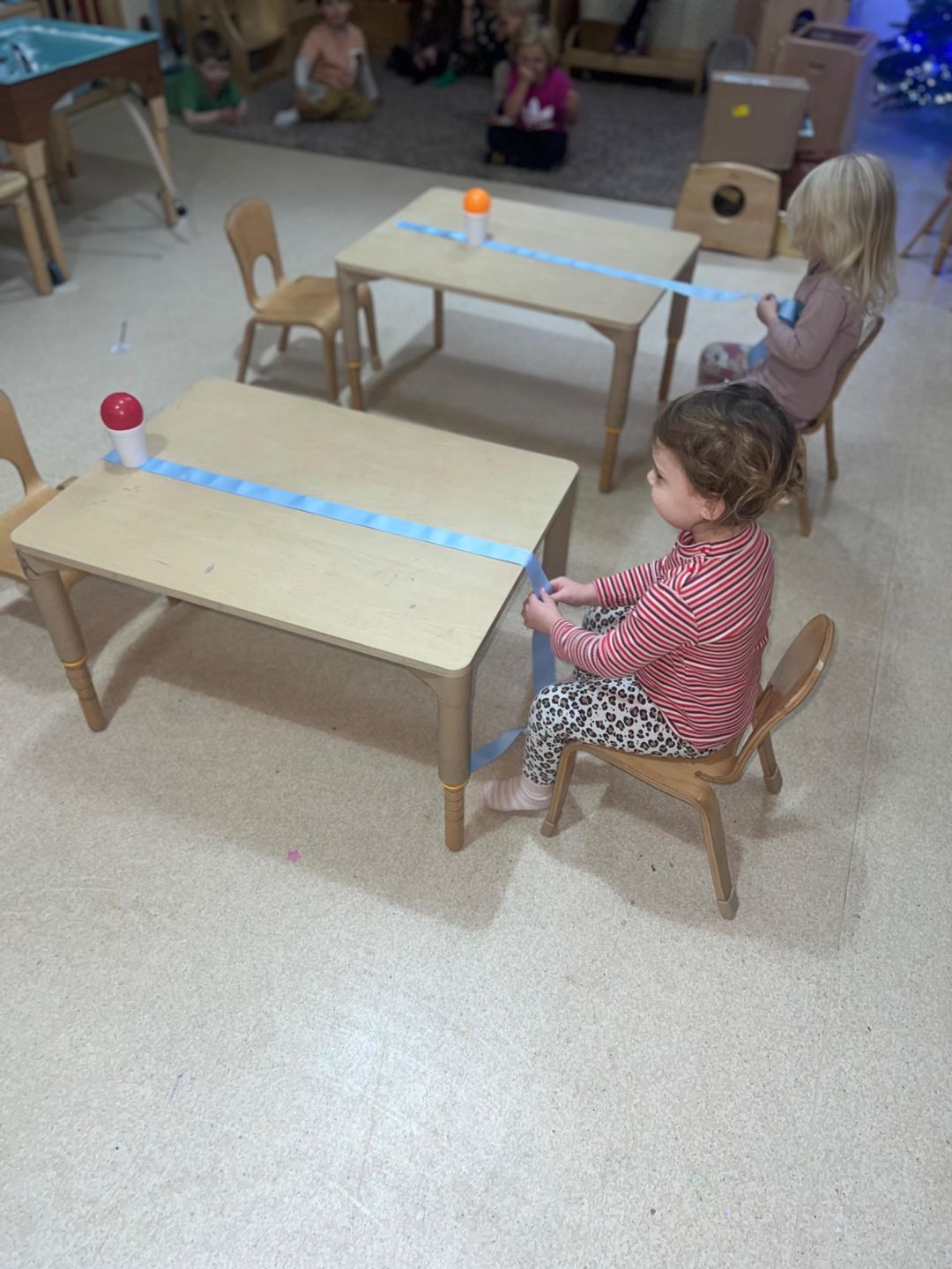 This fun engagement requires 2 pairs of children that compete against each other, meaning there was some concentration needed for them to successfully pull the ribbon steadily enough so the cup won’t fall over, but instead the cup would get drawn to the opposite end of the table smoothly.