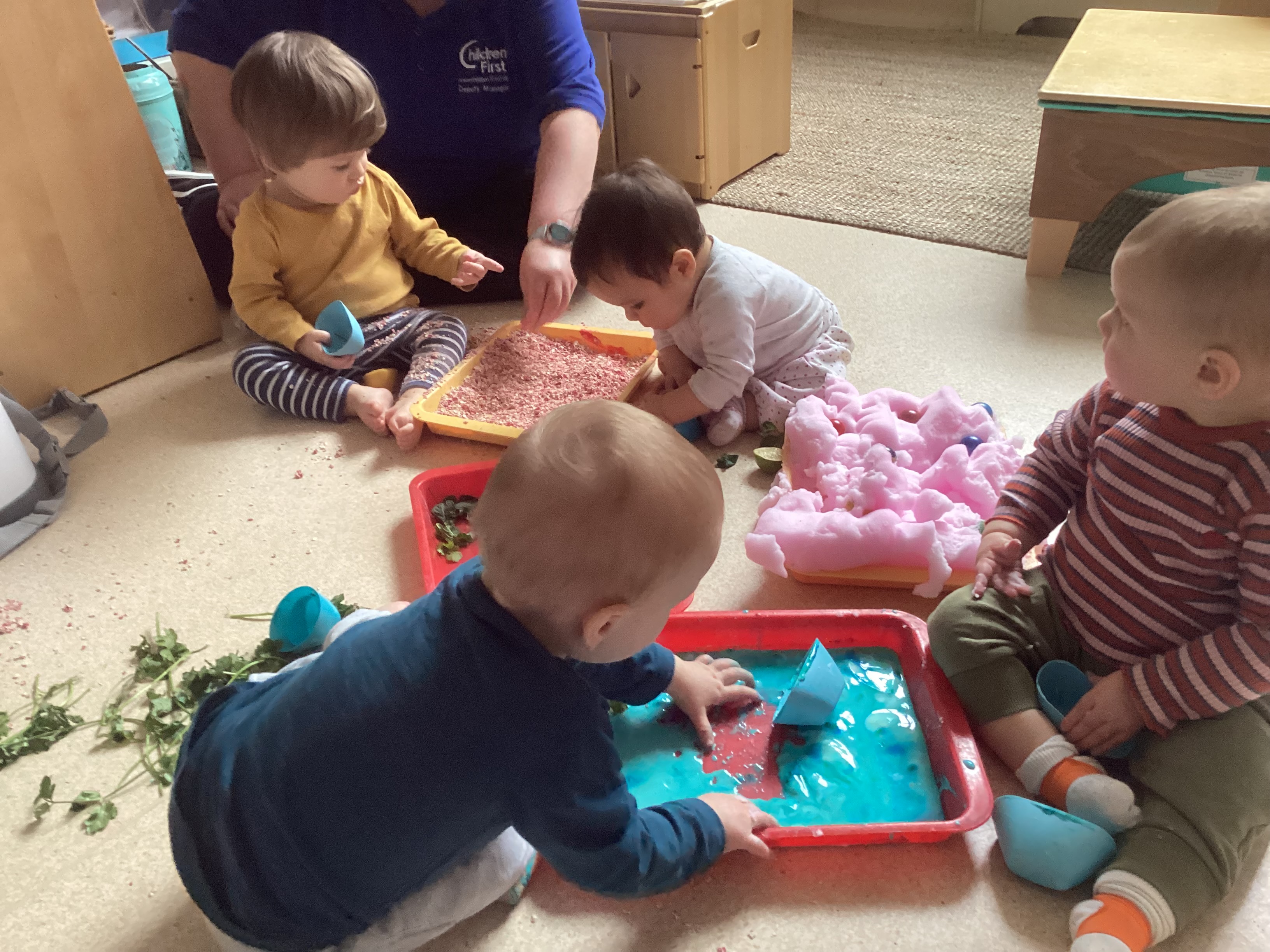 This week in baby room we have been busy exploring our senses using a variety of different edible and non-edible resources such as cornflour, foam soap, coloured oats and herbs and fruit. Using these resources, we were able to smell, taste, and feel the texture. The babies were encouraged to squeeze, mould and pour using the different textures we had on offer and some of the babies were very keen to taste the herbs and citrus fruits, we thoroughly enjoyed our sensory experience and are all currently very keen on messy play.