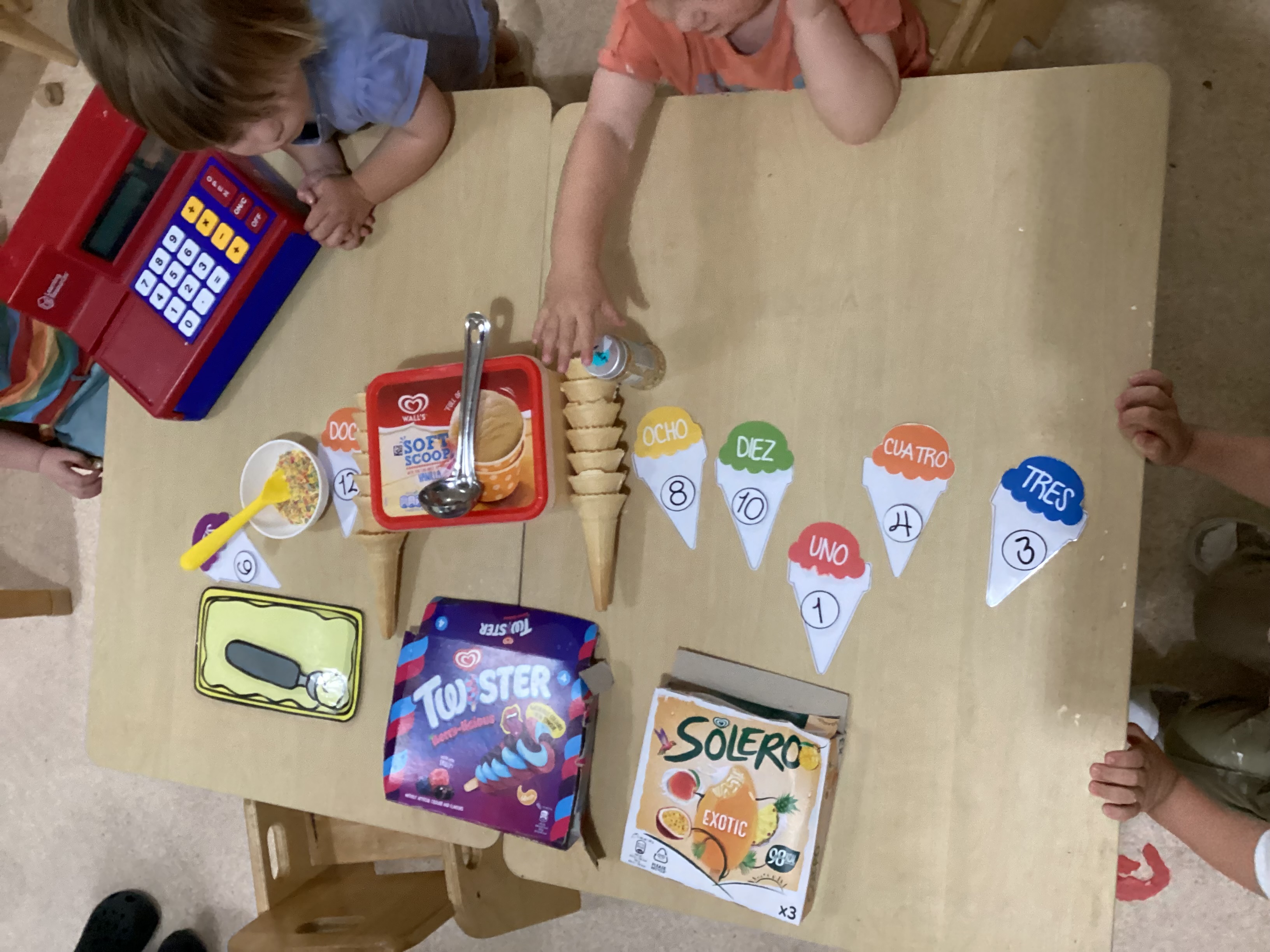 This week in toddler room we have shown a great interest in learning Spanish. To do this Chaimae extended our learning from our Spanish specialist teacher sessions through a lovely ice cream activity. For this we focused on numbers and colours. We matched numbers to the scoops of ice cream in a matching activity. While we were matching we repeated the numbers and colours in Spanish. We then extended this by completing an ice cream role play activity. We took what we had learned and counted our scoops in Spanish as we passed the ice cream out to our friends. This was a lovely way for us to extend our sharing and turn taking skills. We then continued to use our Spanish skills by taking part in an ice cream playdough activity. Muy Bien toddlers!