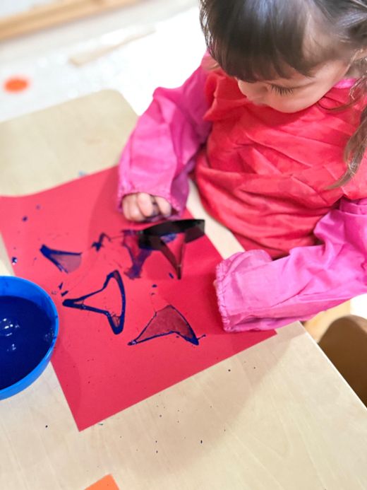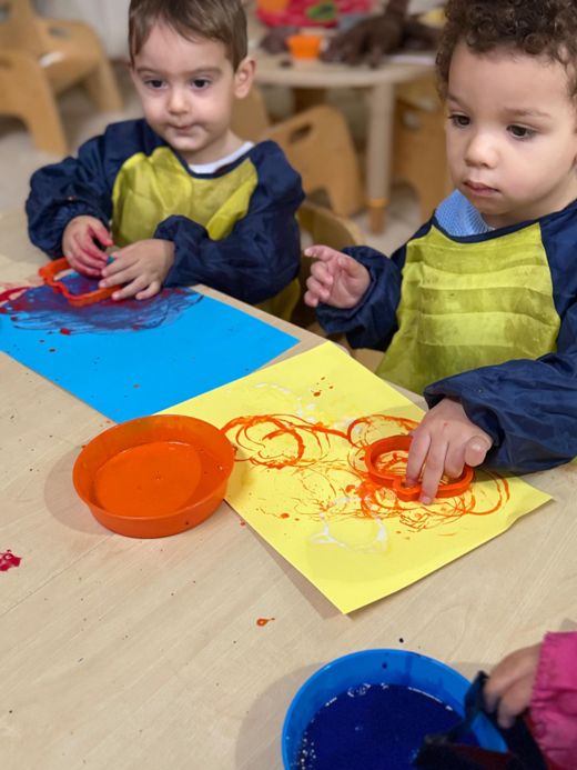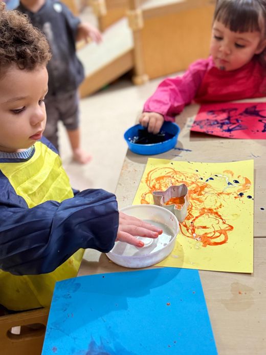 Using Halloween-themed playdough cutters, the children dipped and printed their designs, exploring cause and effect as they watched the bubbly paint spread and mix on the paper. This hands-on activity supported their fine motor development as they grasped, dipped, and pressed with control.